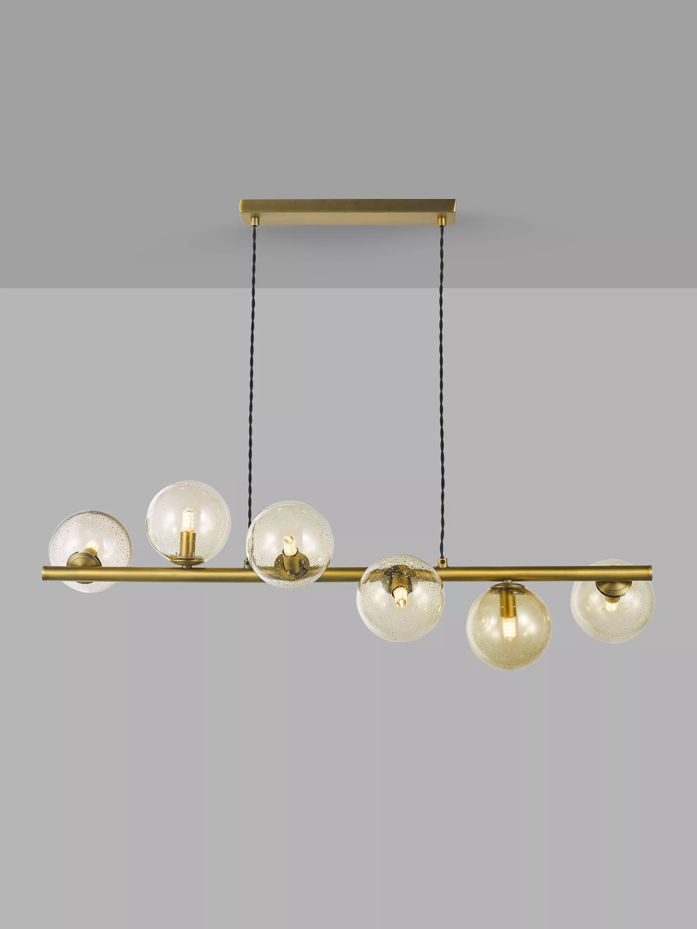 This six light statement bar pendant will add the wow factor to your kitchen or dining room. Made from bubble glass with an opalescent finish that will cast shadows and create a subtle textured effect. Warm brass hardware lends a smart touch, finished with a twisted fabric flex.