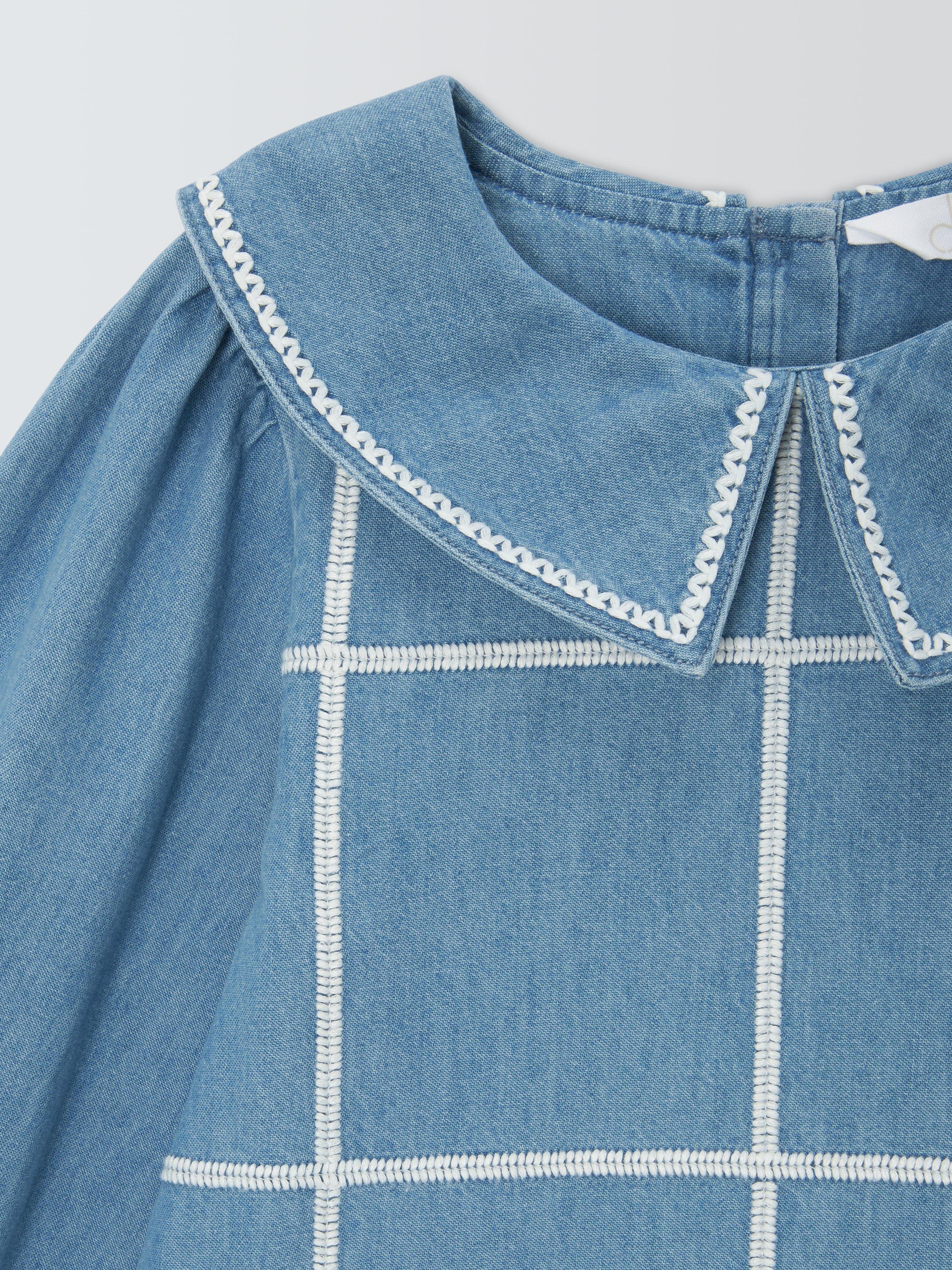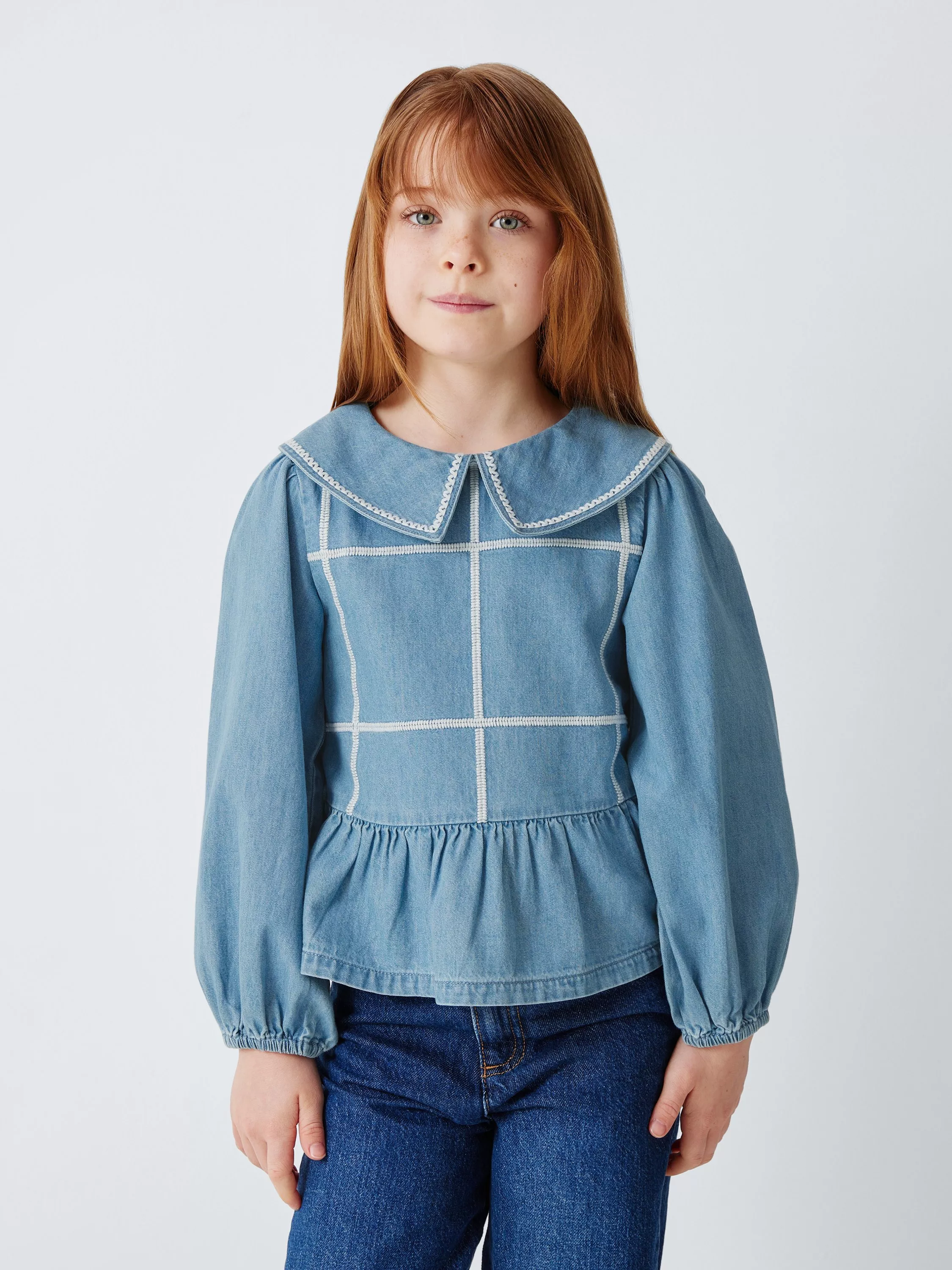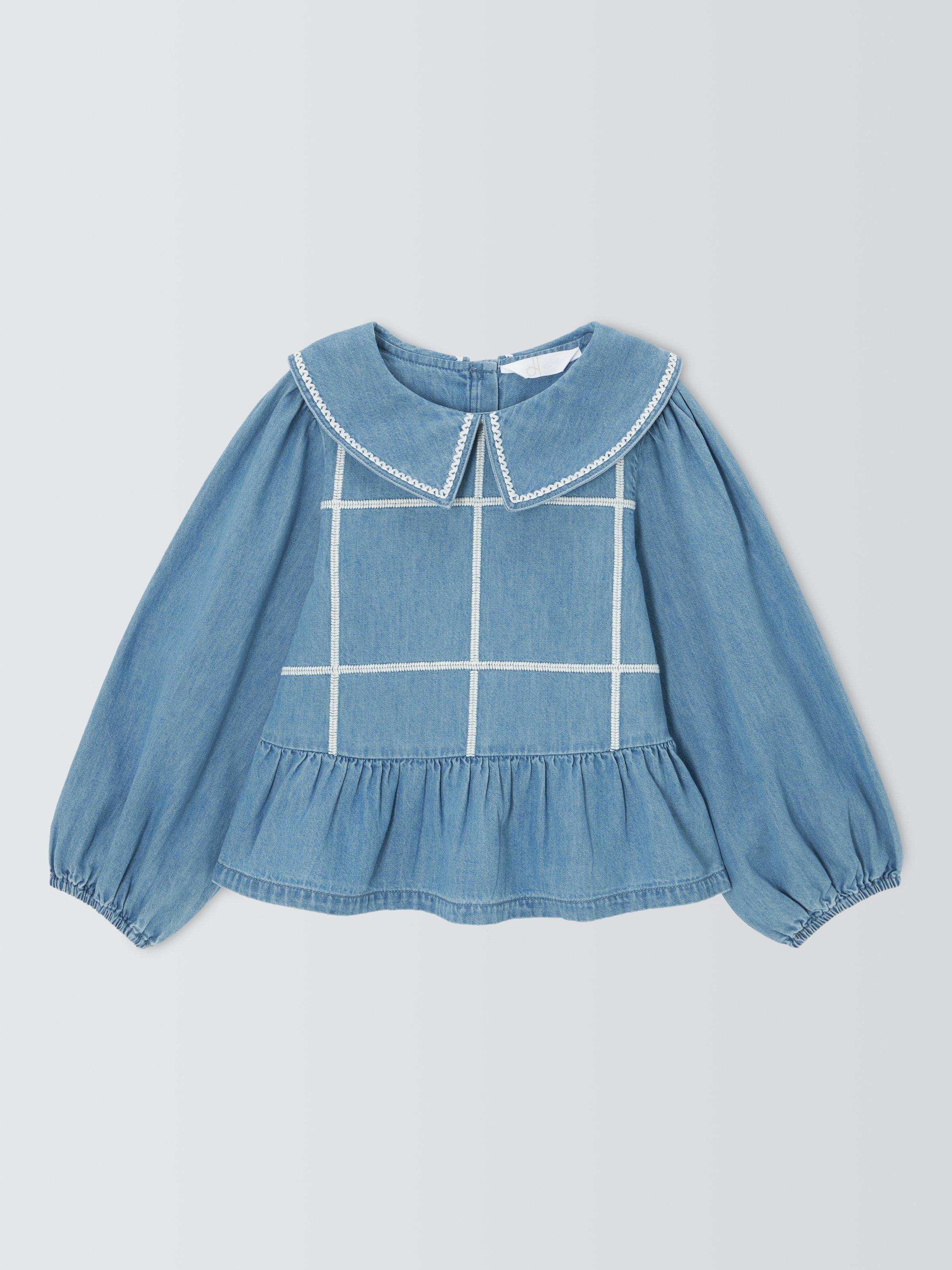 In pure cotton denim, this top has a charming feel thanks to the check embroidery, oversized collar, and peplum hem.