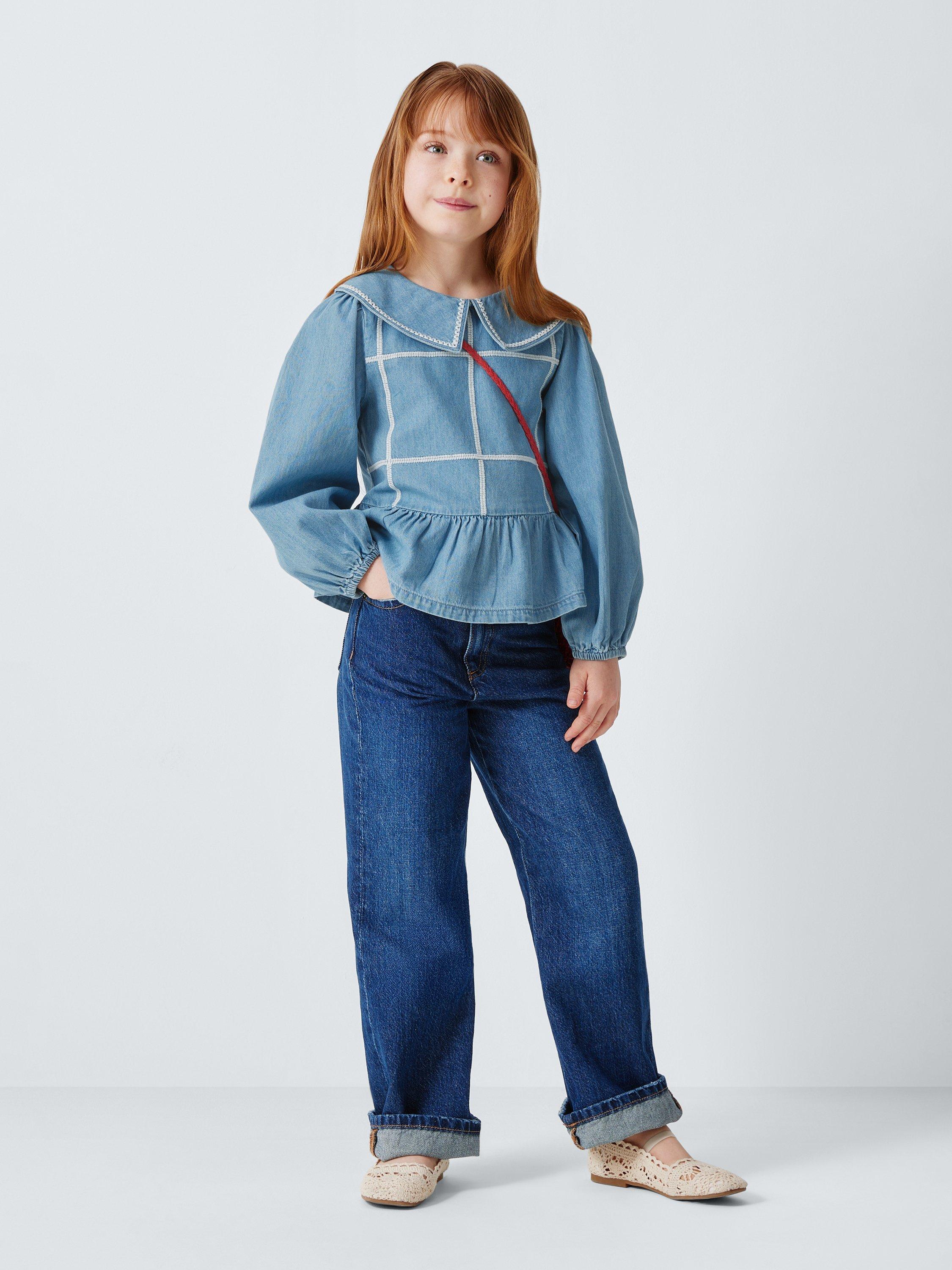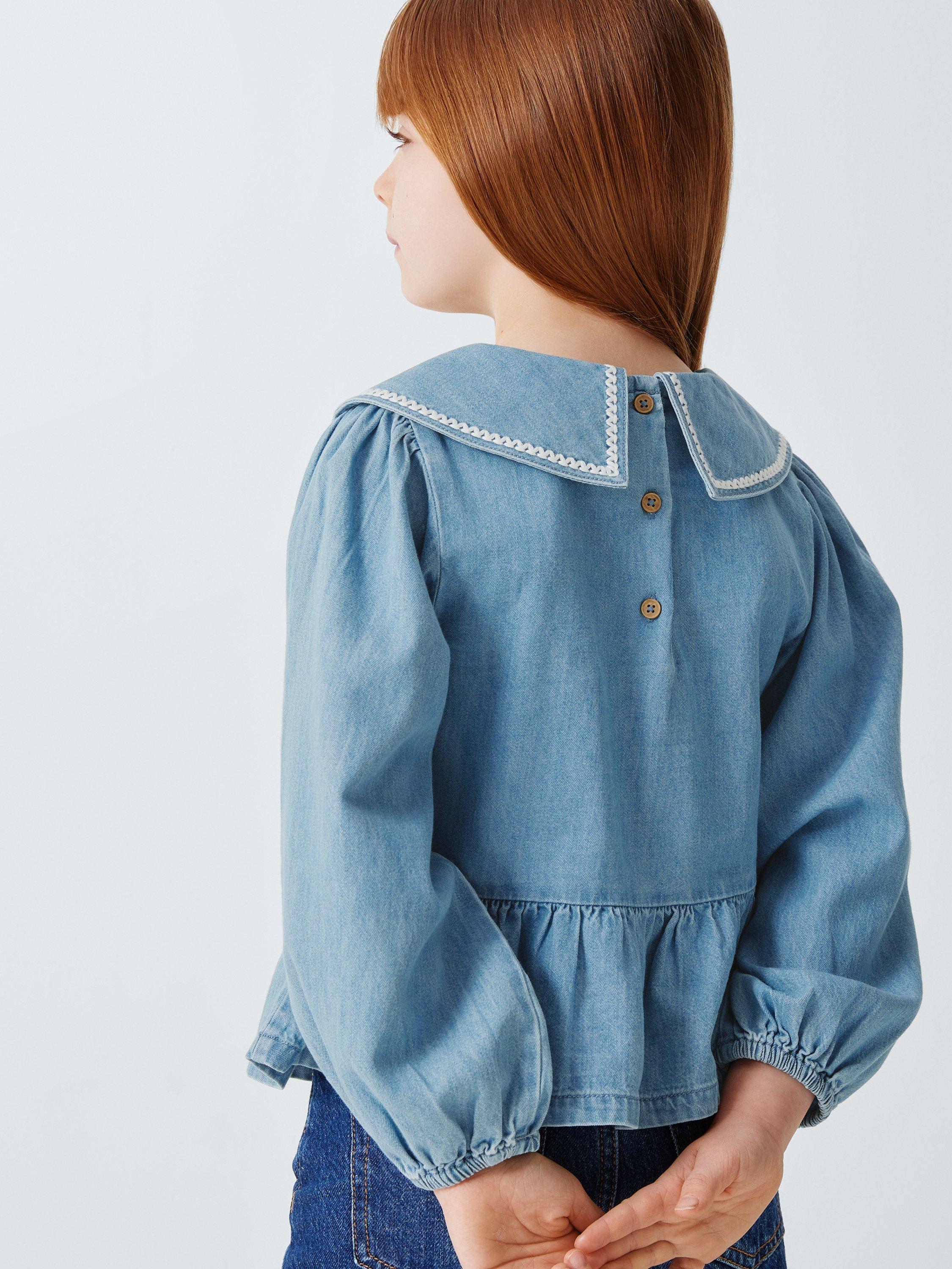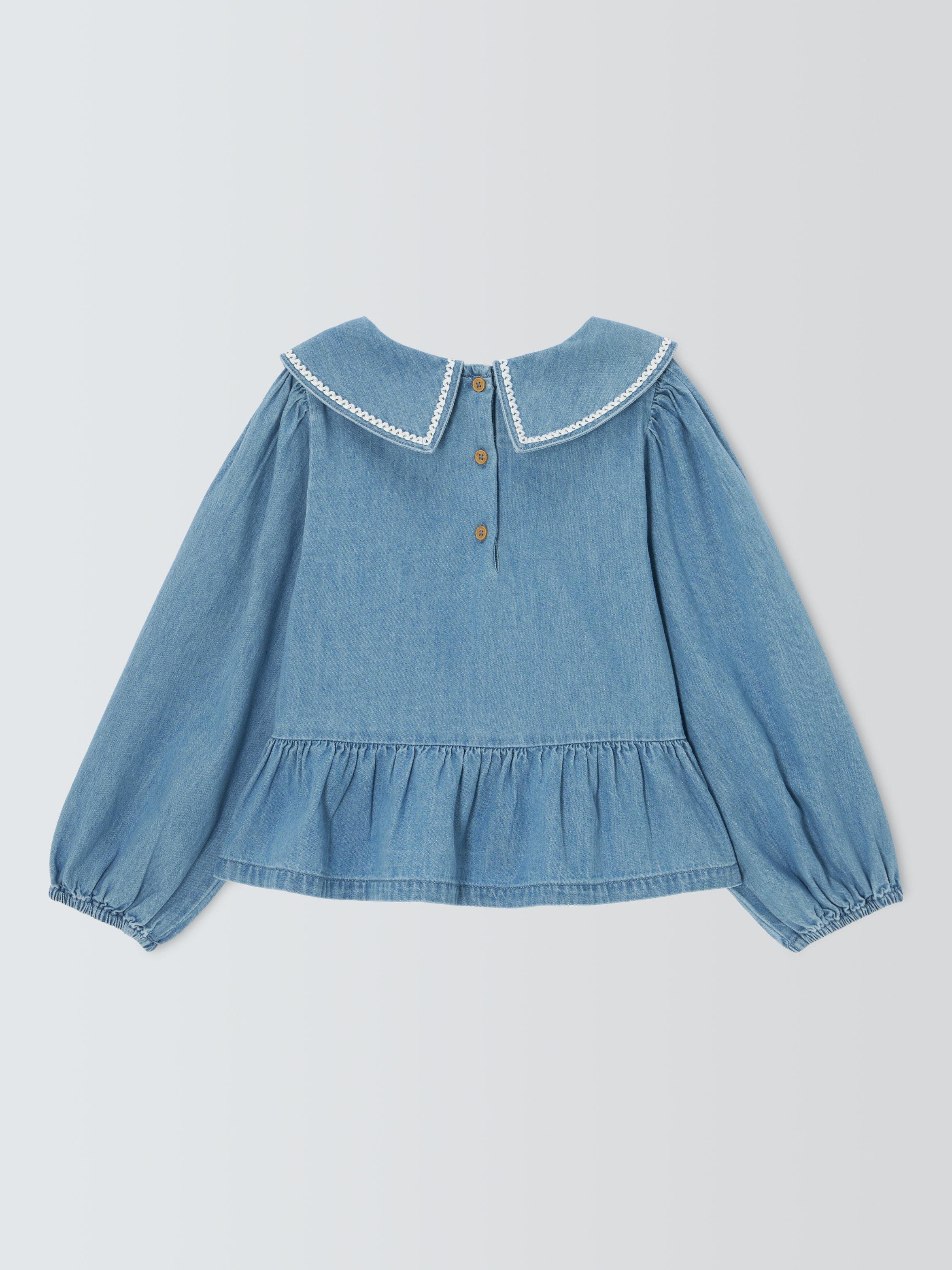 In pure cotton denim, this top has a charming feel thanks to the check embroidery, oversized collar, and peplum hem.