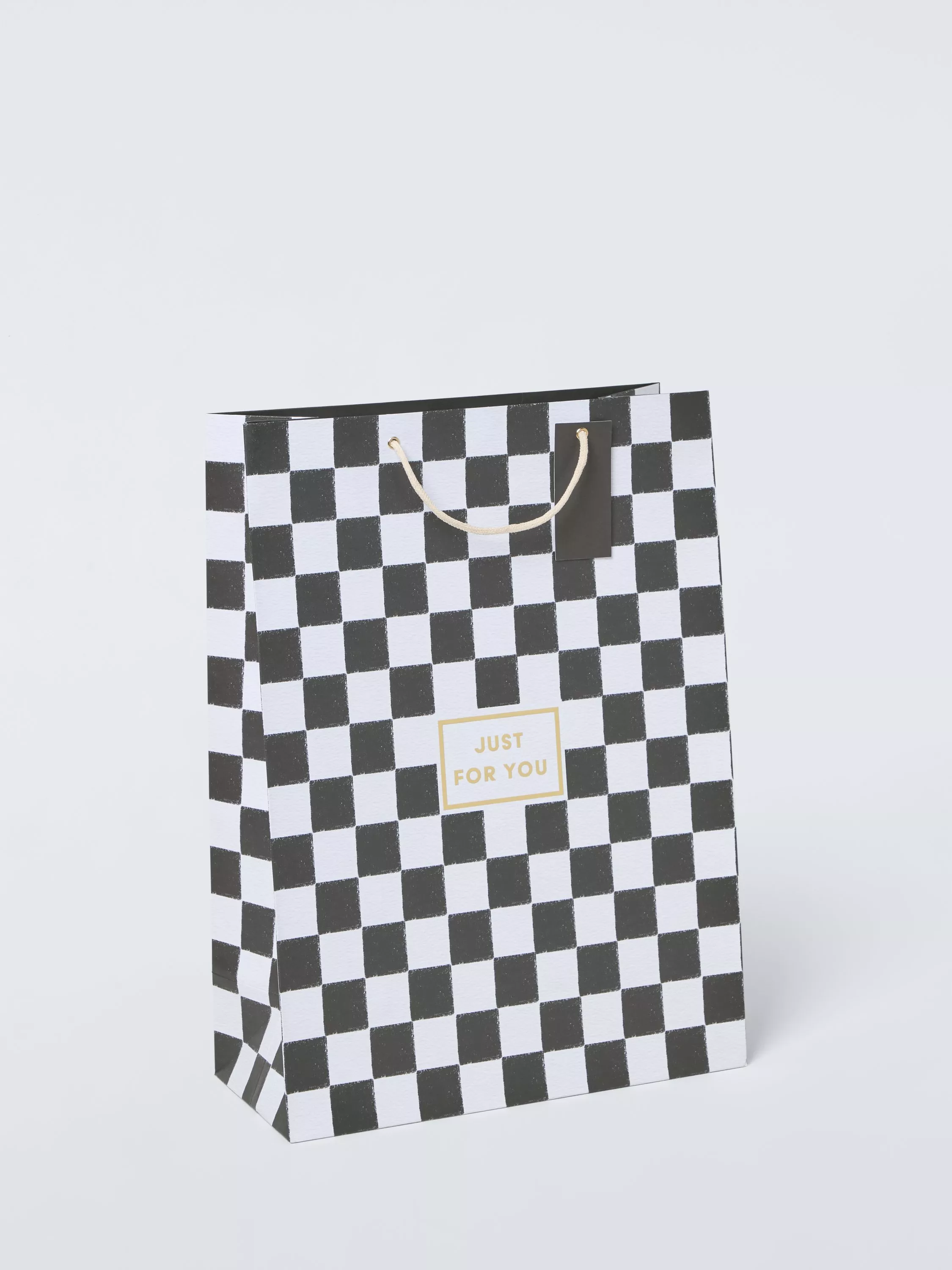 Checkerboard gift bag with cotton rope handles and gift tag.