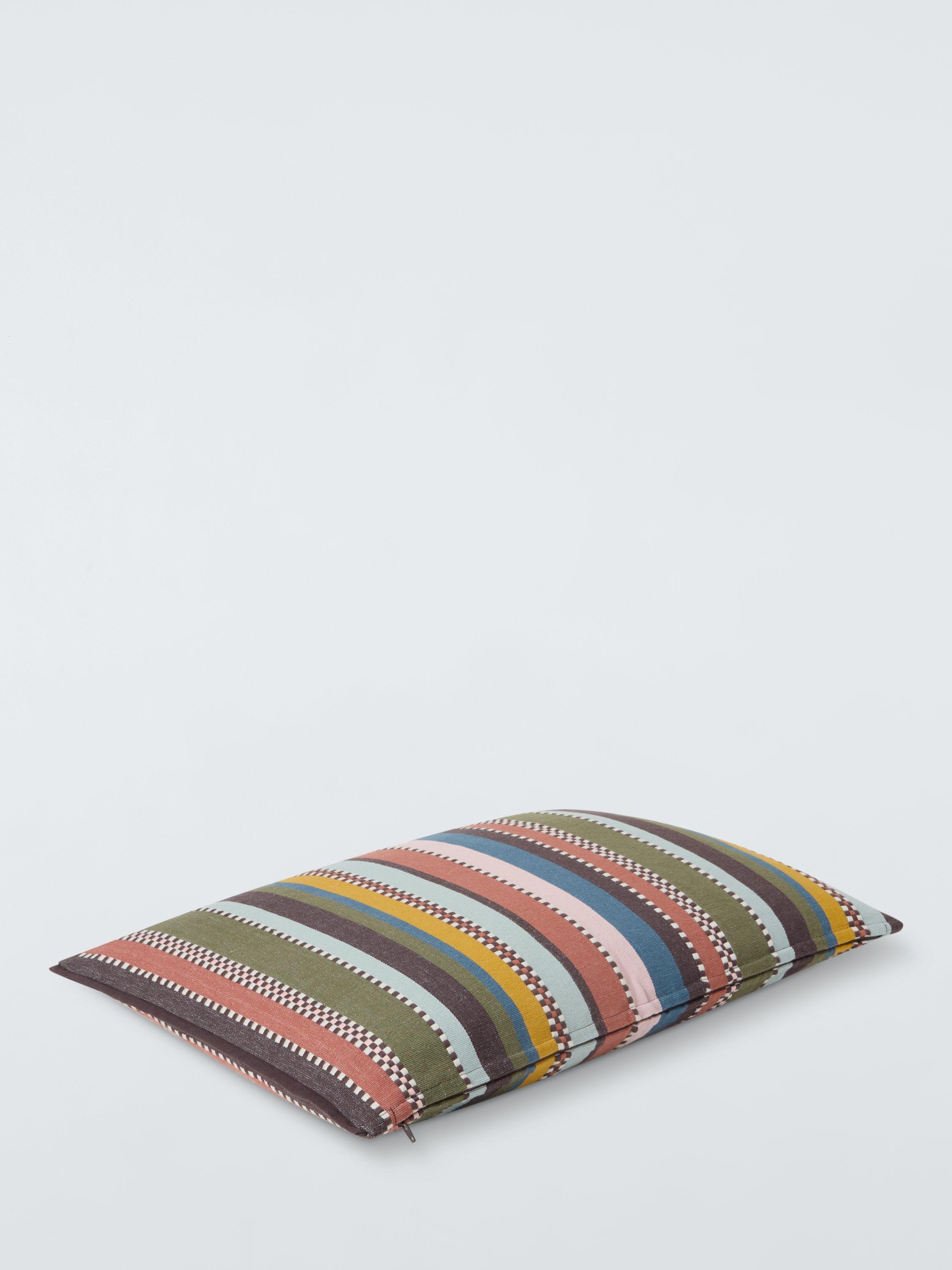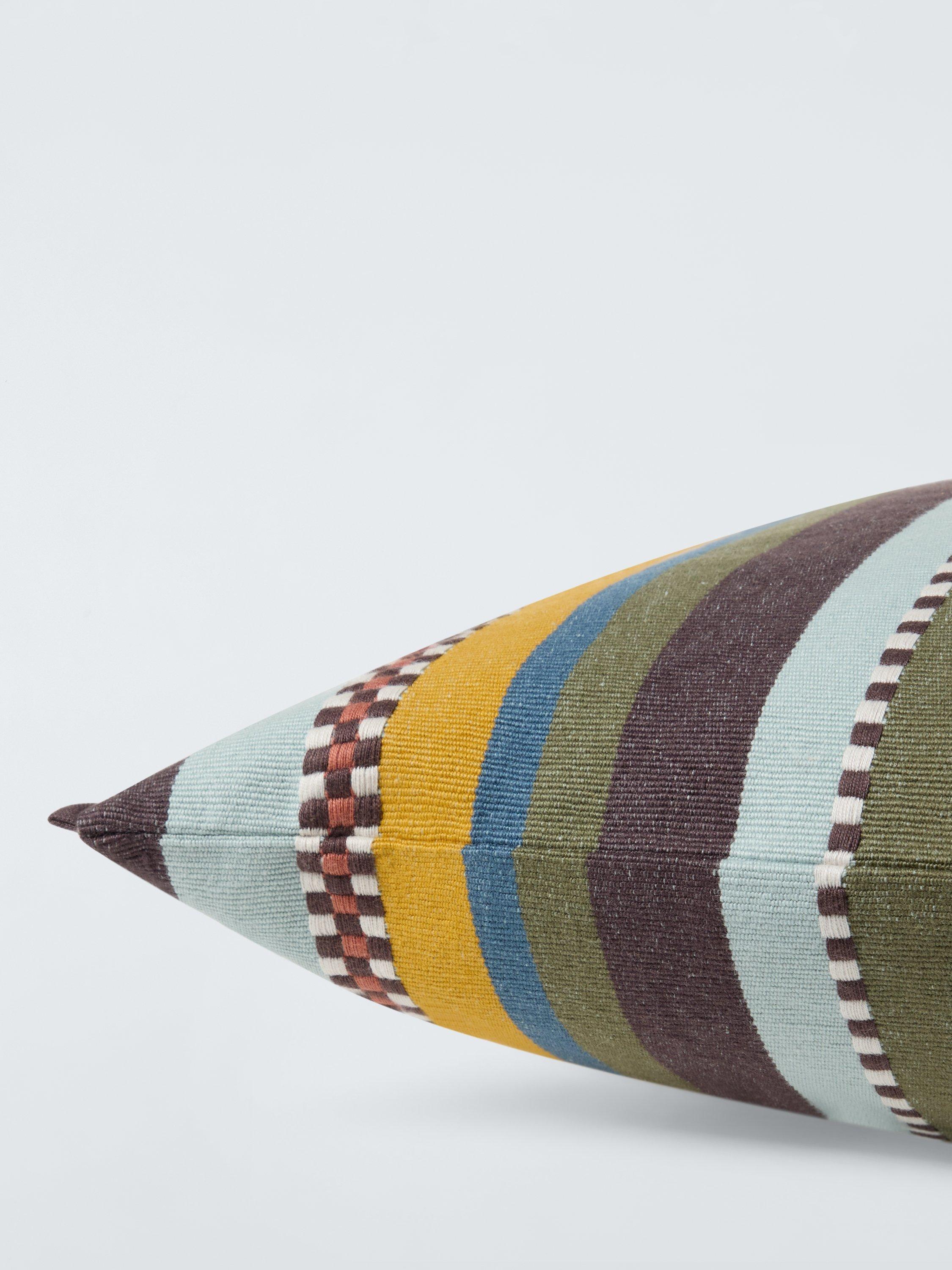 This woven stripe cushion has "checkered" squares of embroidery for additional texture and colour.
