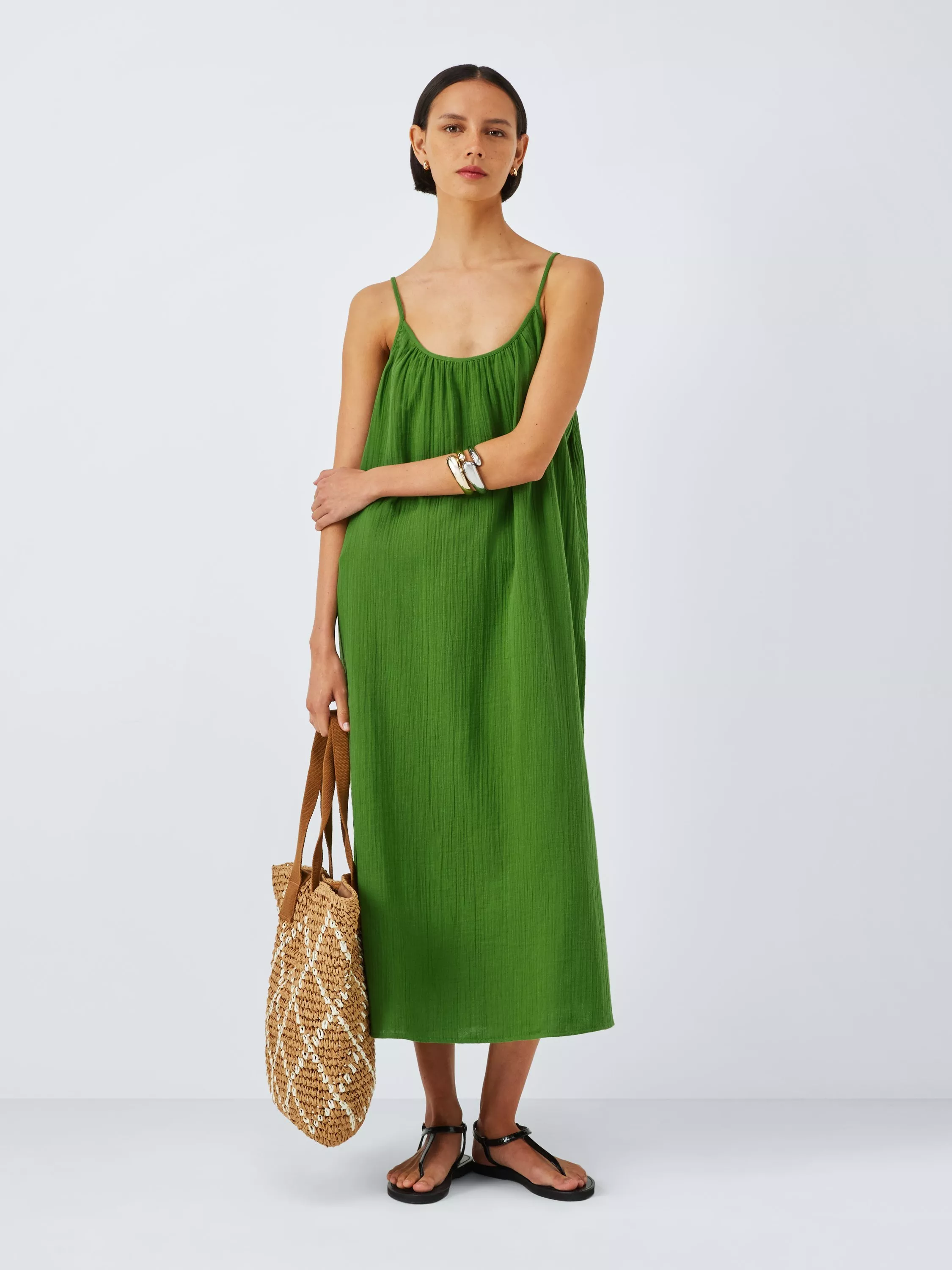 Made in light and airy cotton cheesecloth, this dress is a suitcase staple. With spaghetti straps and a flowing shape, it's ideal for throwing on over your swimwear.