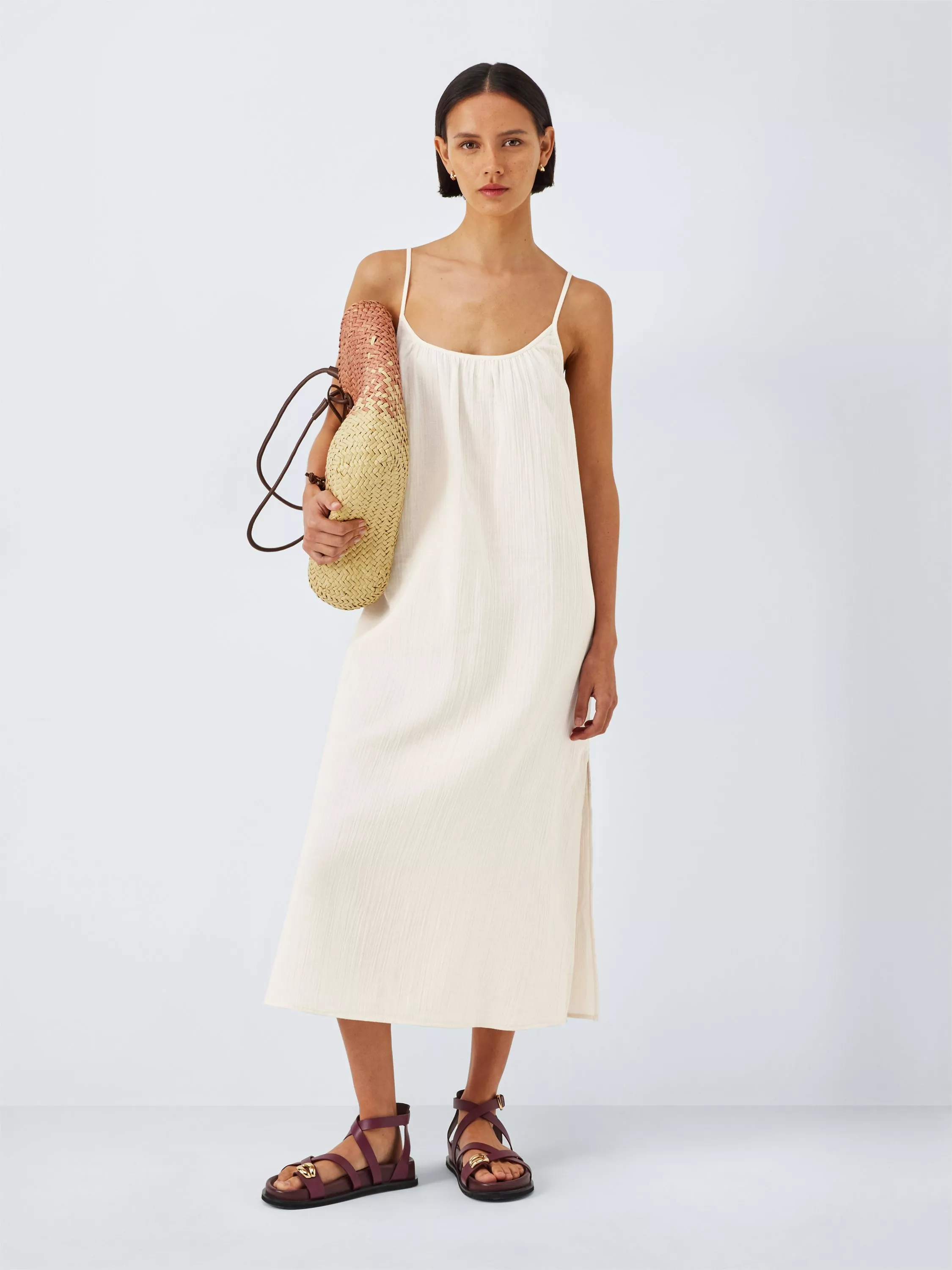 Made in light and airy cotton cheesecloth, this dress is a suitcase staple. With spaghetti straps and a flowing shape, it's ideal for throwing on over your swimwear.