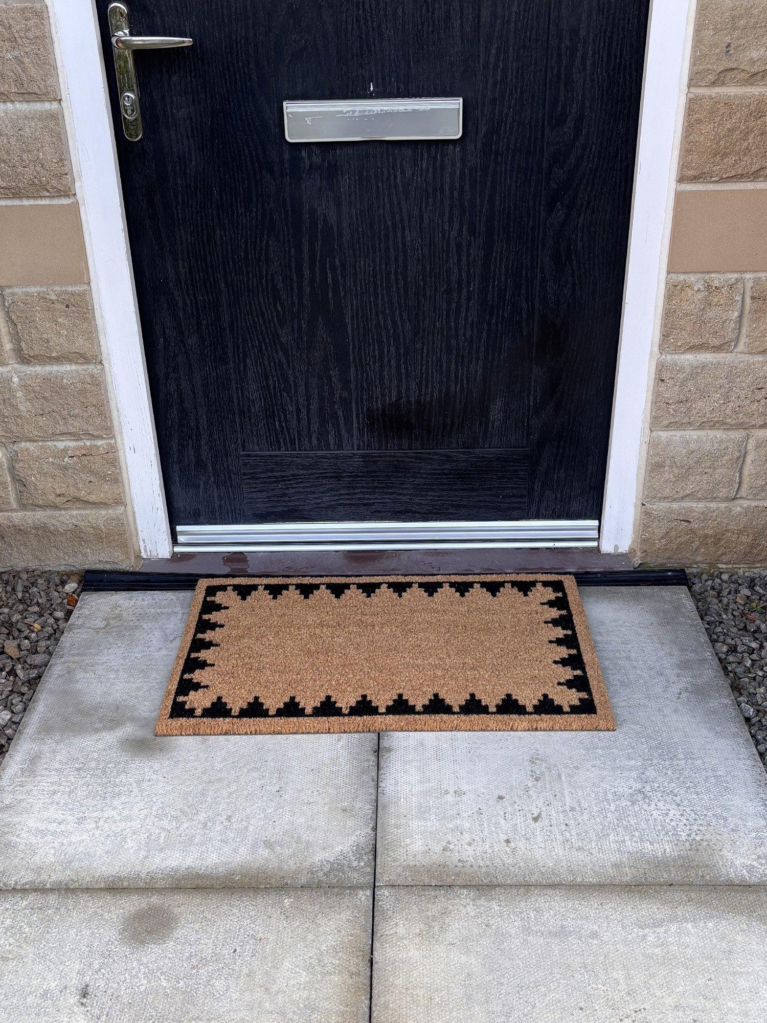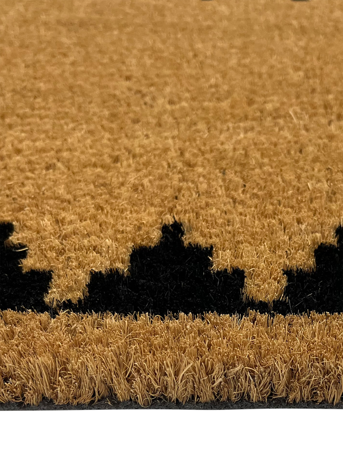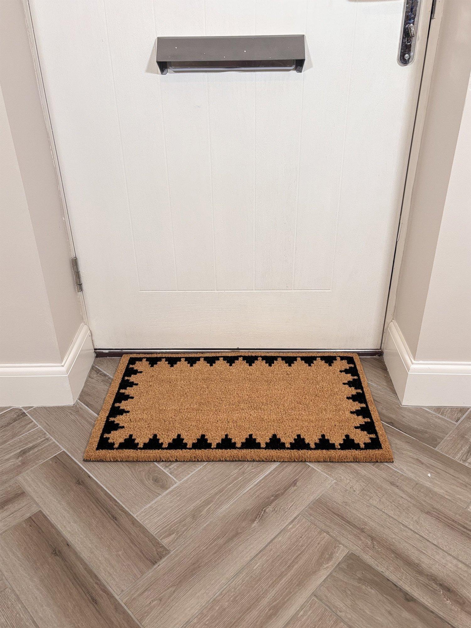 A hard-wearing coir door mat with a simple but elegant chevron border.