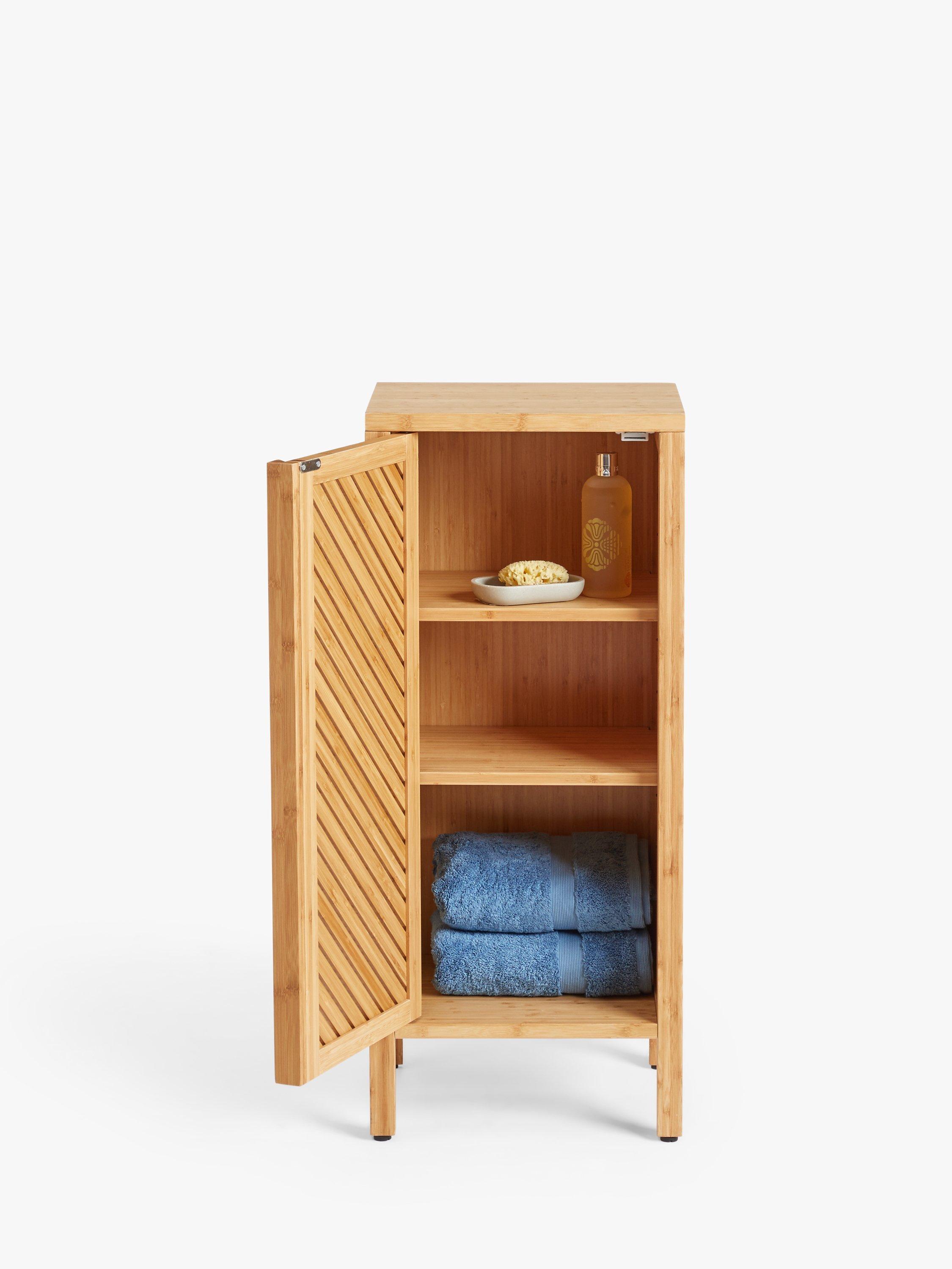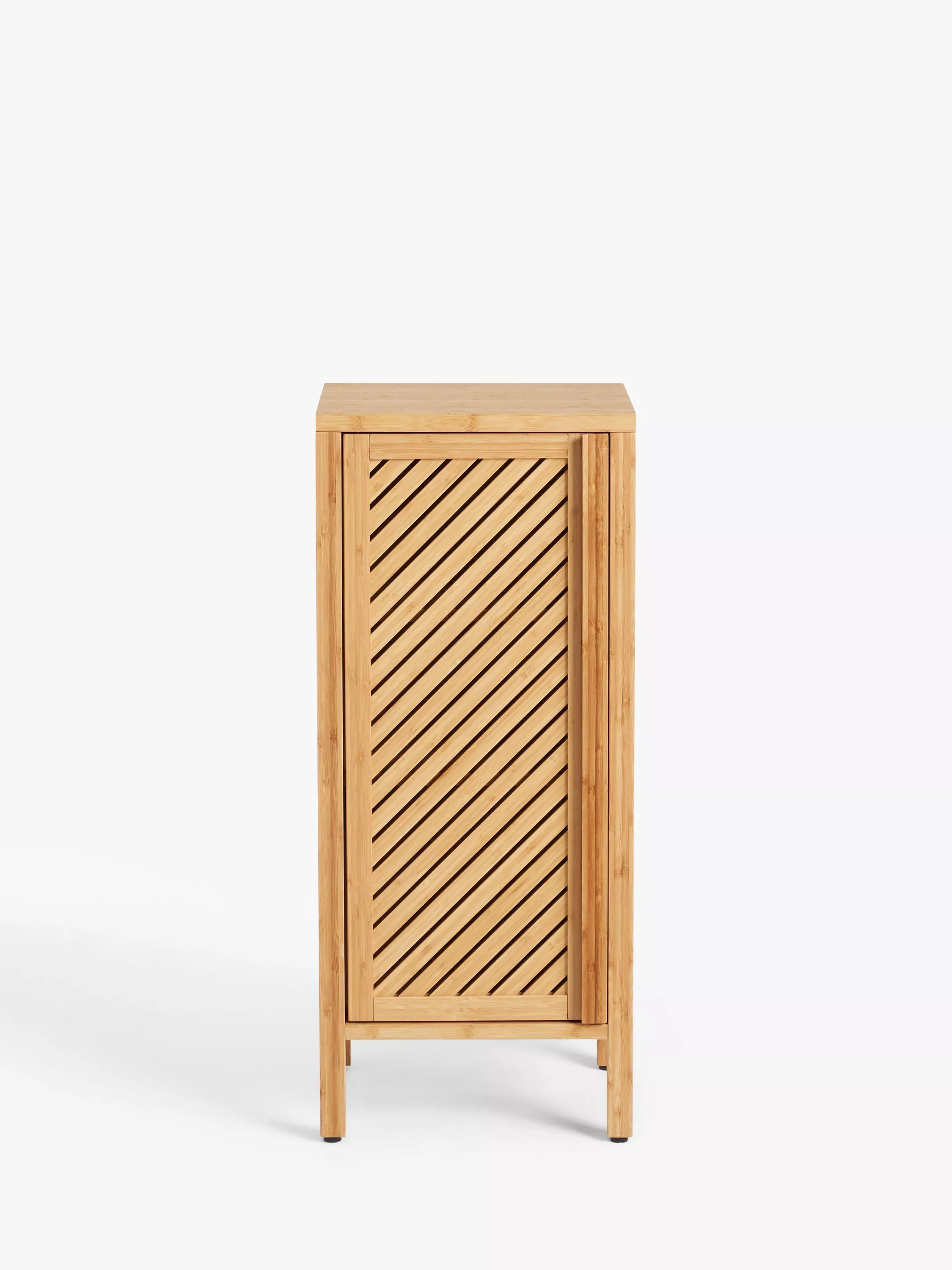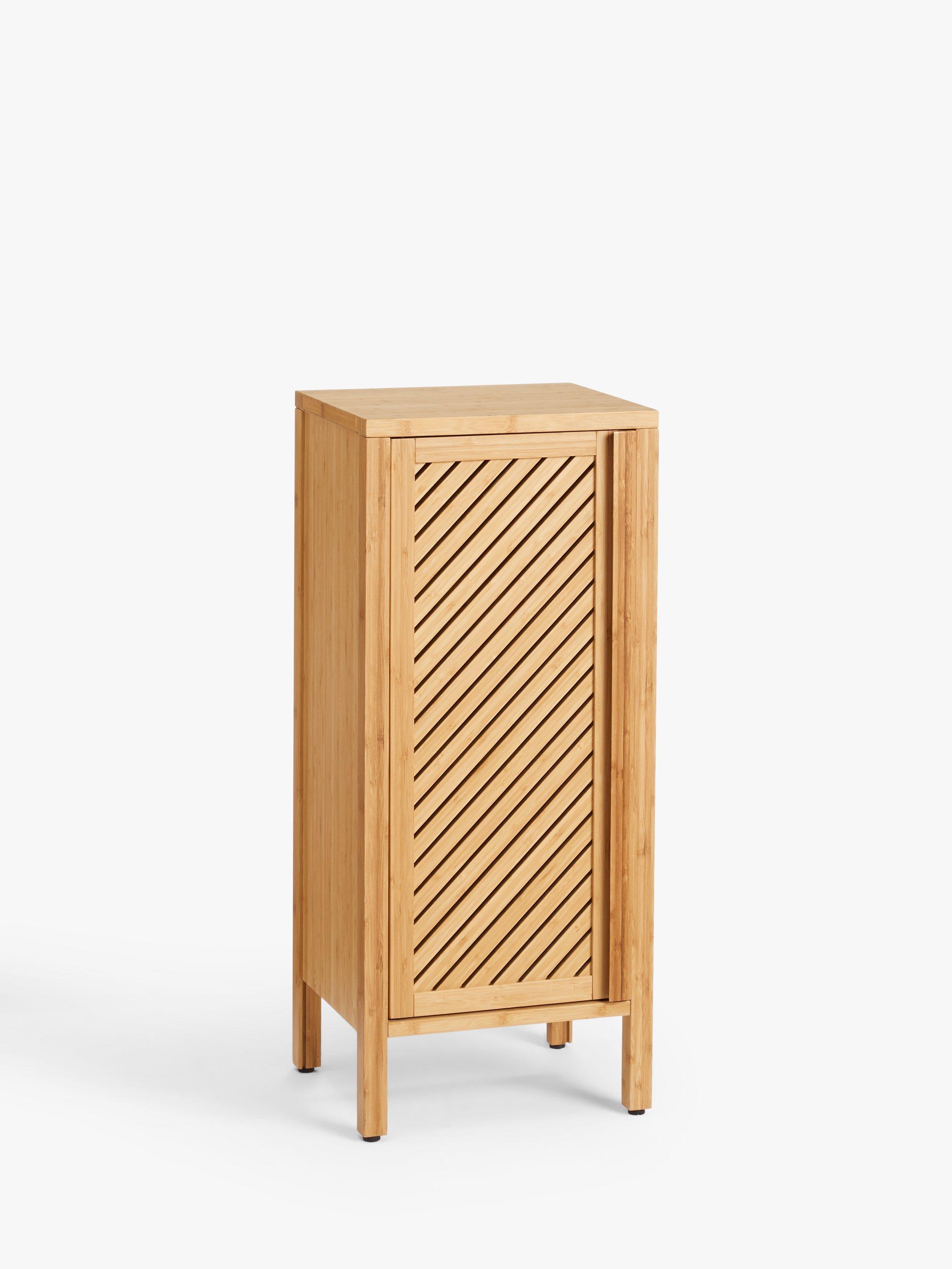 We've designed this slimline storage cabinet with a sustainable edge. It's made from a combination of solid bamboo, known for its lightweight and fast-growing characteristics, and MDF in a natural or stained finish. A practical option for your bathroom essentials, there are three shelves inside and the slatted detail on the door lends a modern touch to the design.