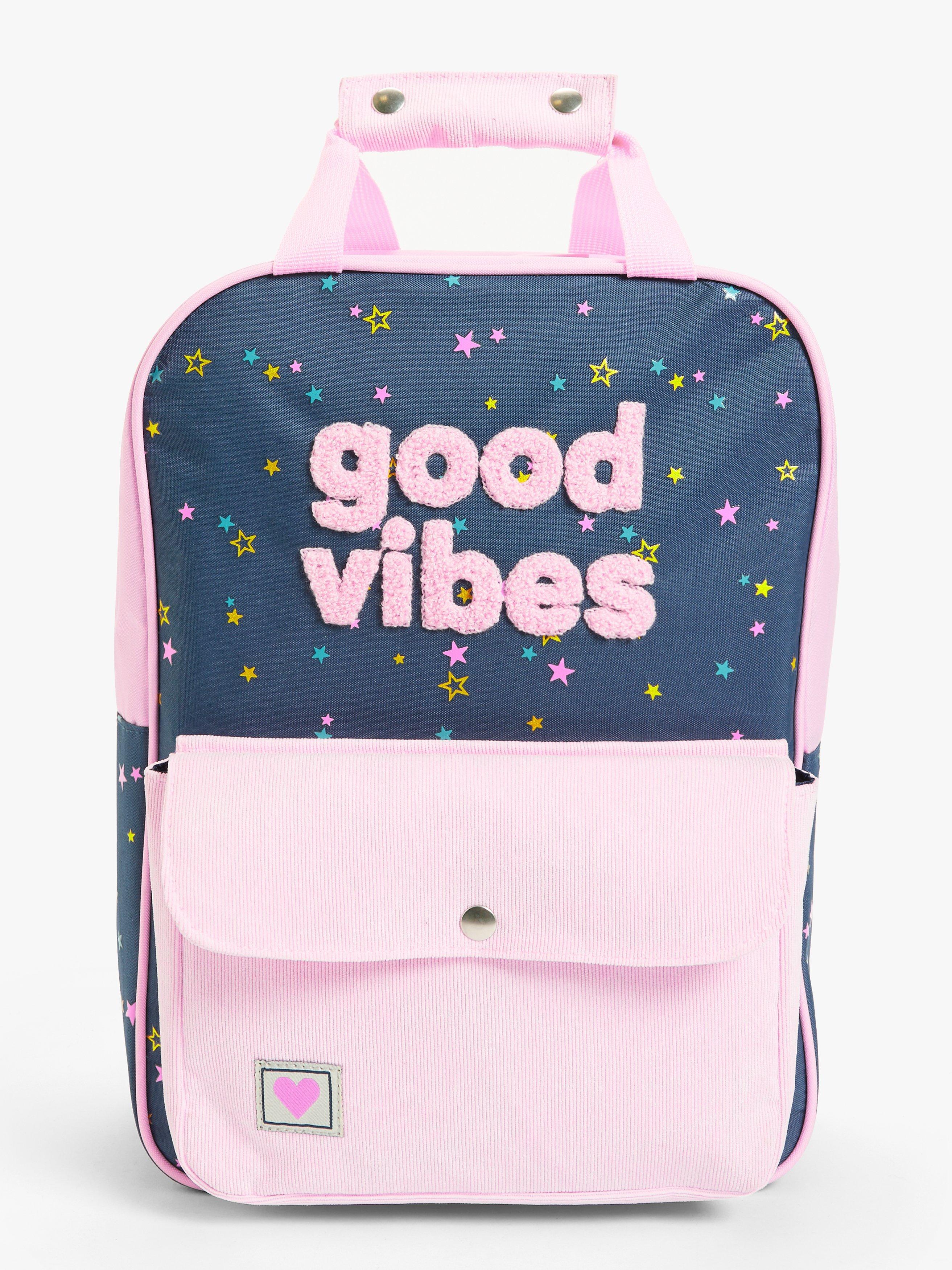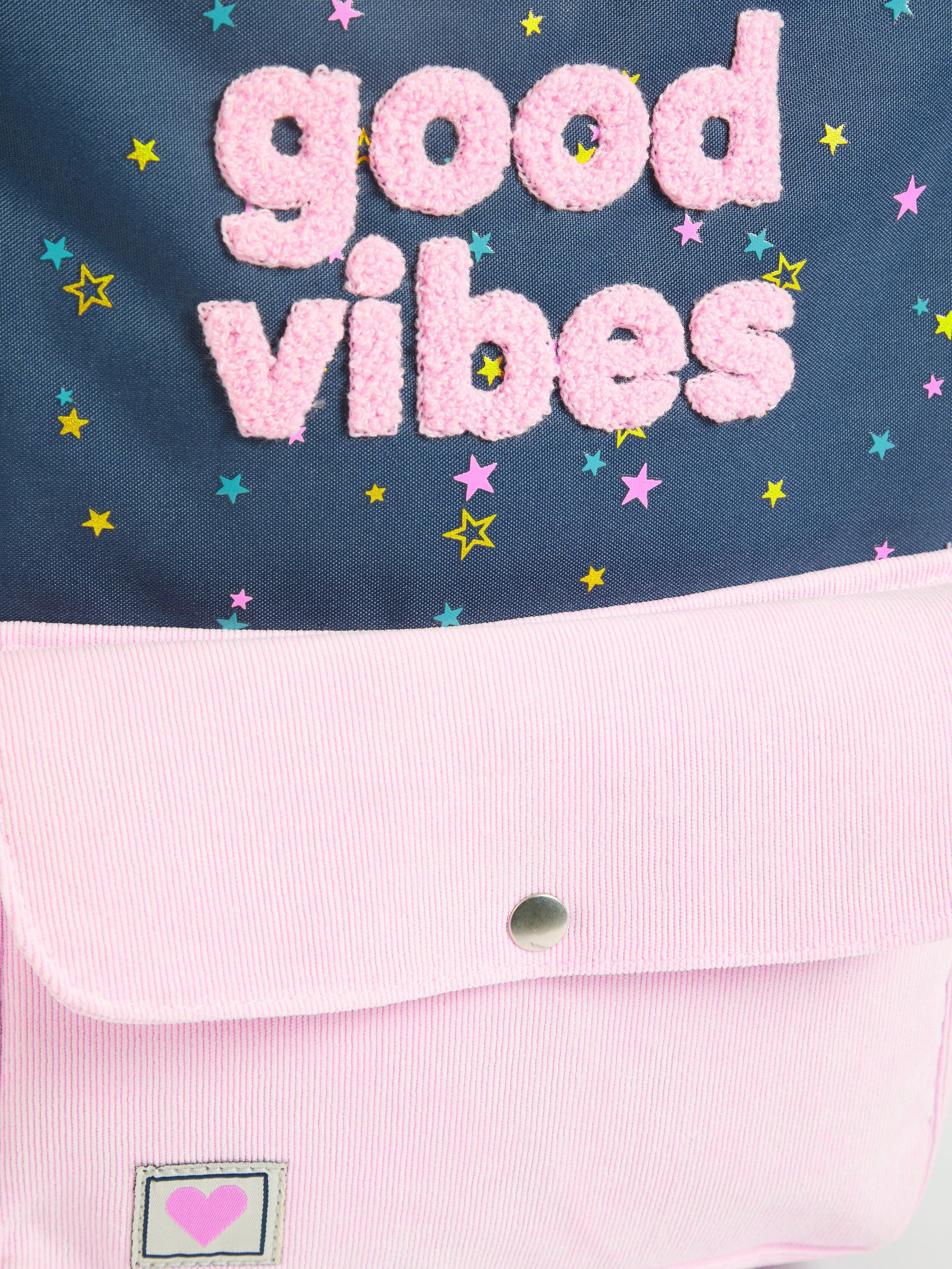 Have a school day filled with good vibes with this fun Children's Backpack from our own collection. Designed with a textured good vibes applique, it's made for starting days right! Perfect for school, adjustable straps and zips keep valuables safe and comfortable to carry, with a name tag on the inside so everyone knows who's got the coolest backpack in class.