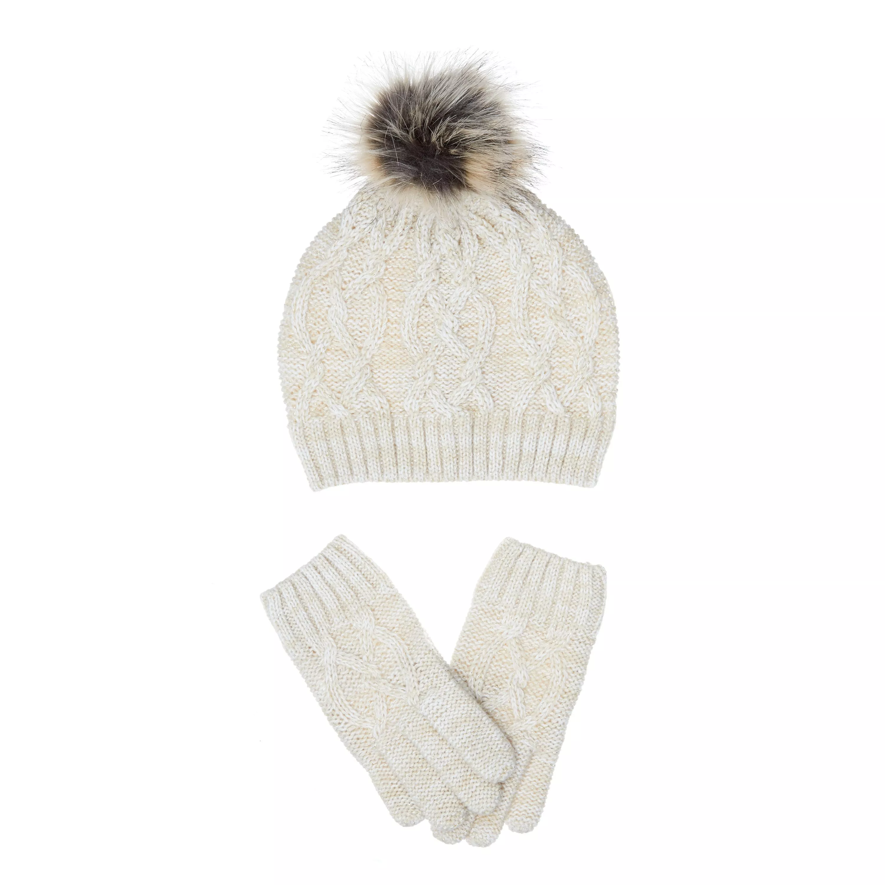 This set comprises a cable knit hat with faux fur bobble and the matching gloves, knitted with a hint of lurex for a sparkly finish.