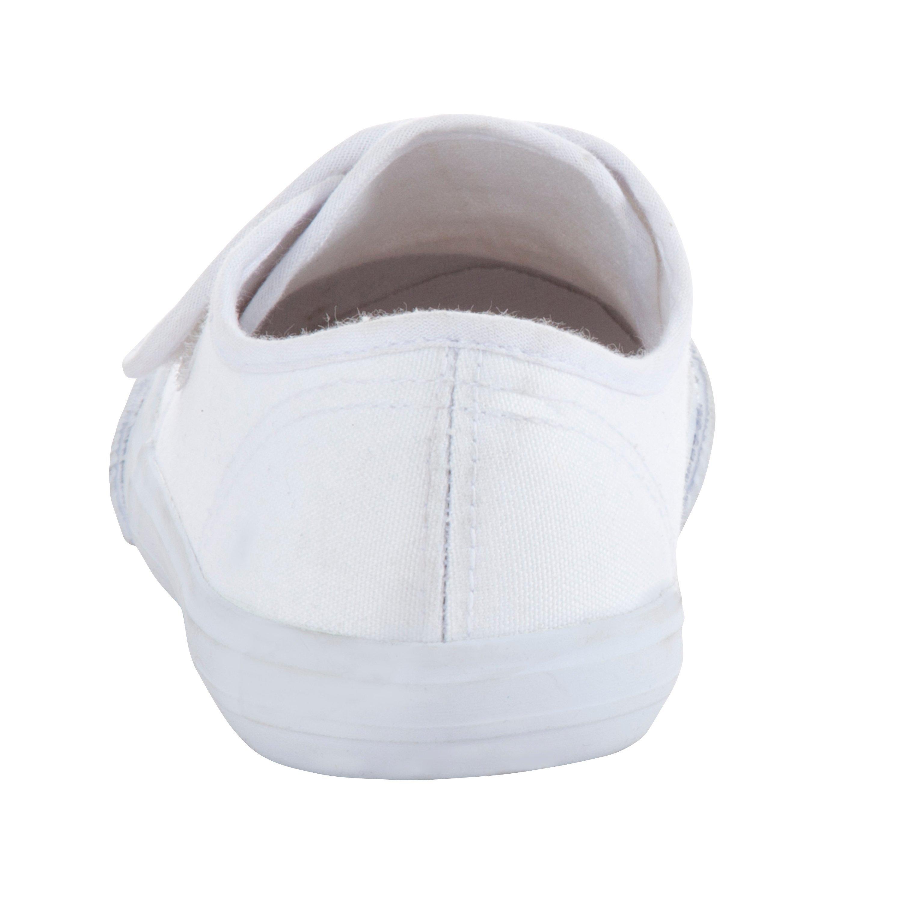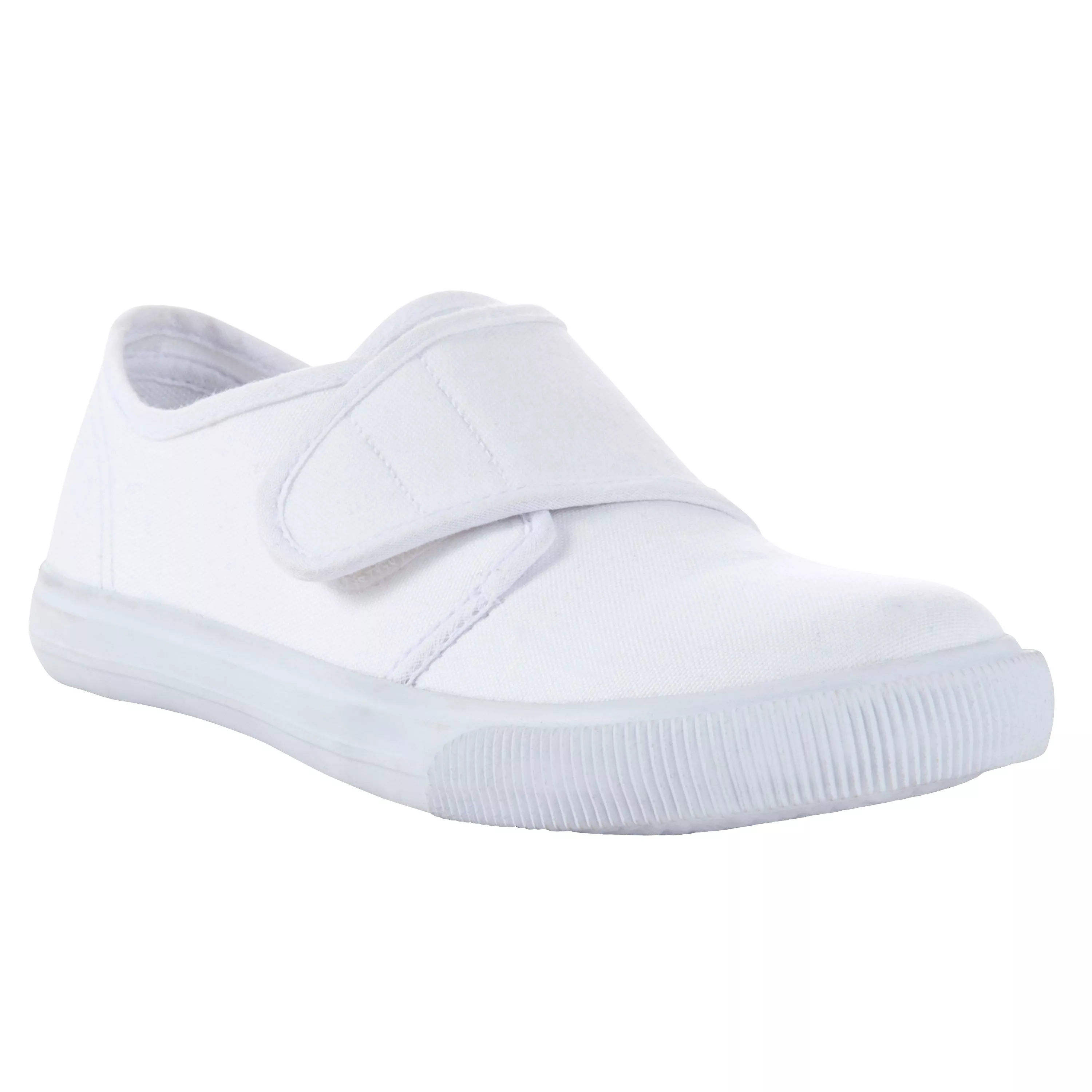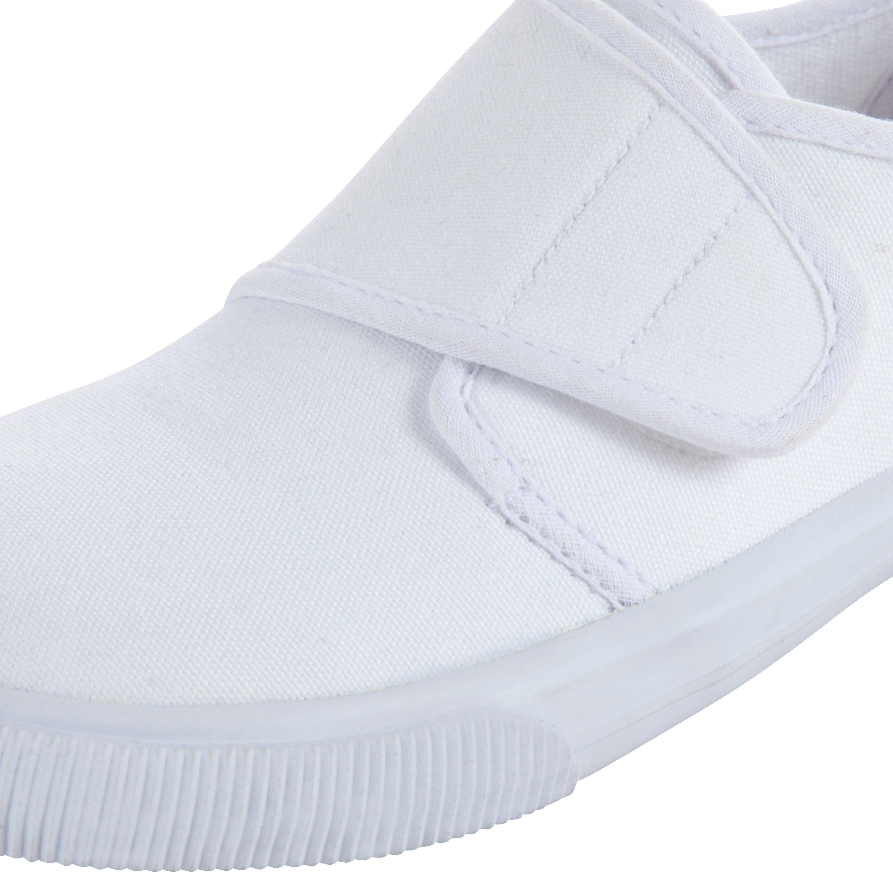 These plimsolls in clean white have reinforced rubber soles and broad rip-tape fastenings.