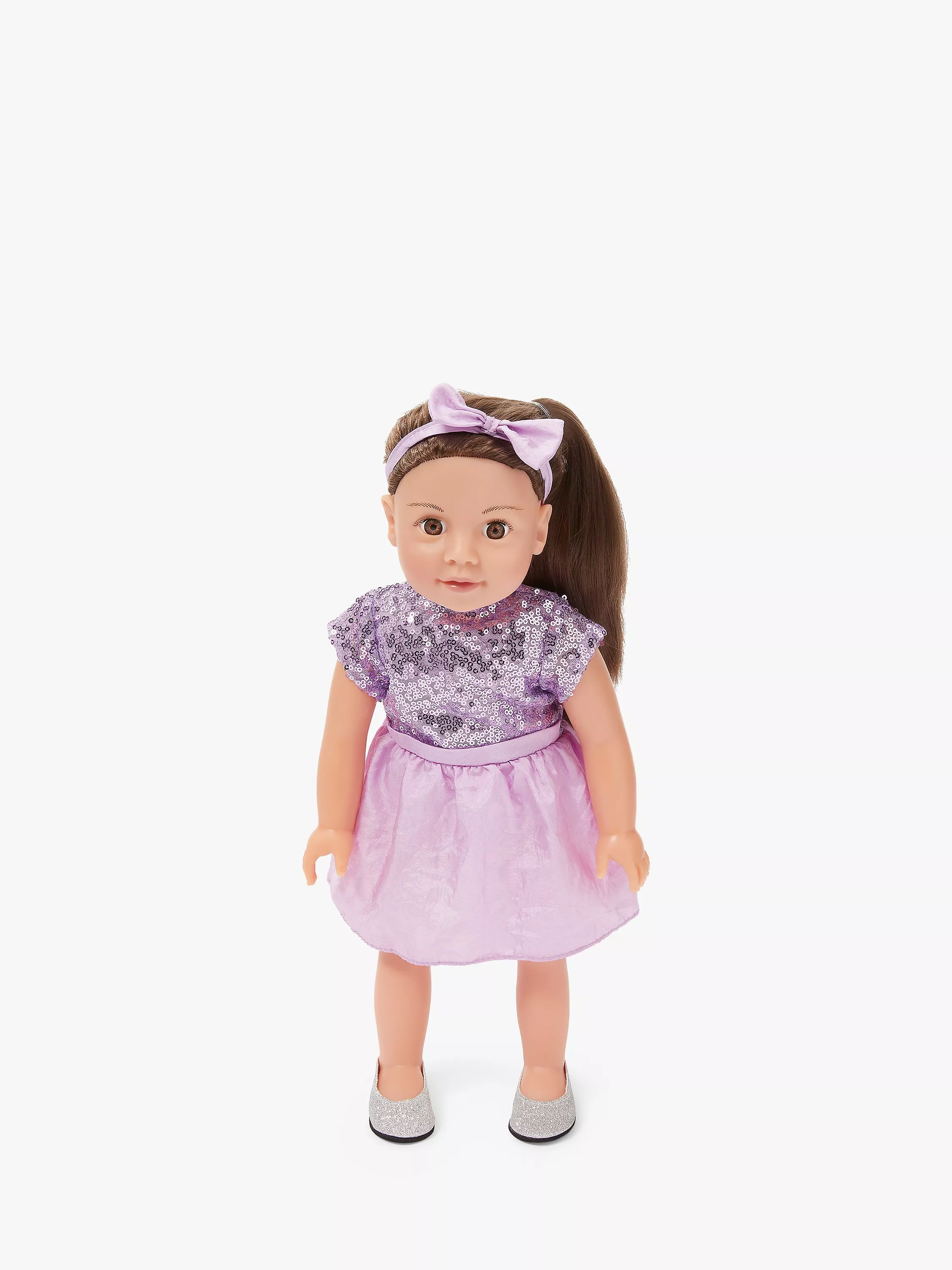 This pretty playmate looks extremely lifelike, with her eager-looking face and long brown hair. Chloe is wearing a pretty dress with sequins and sparkling shoes. In her hair, she sports a headband, with a beautiful bow to match her sparkling top.