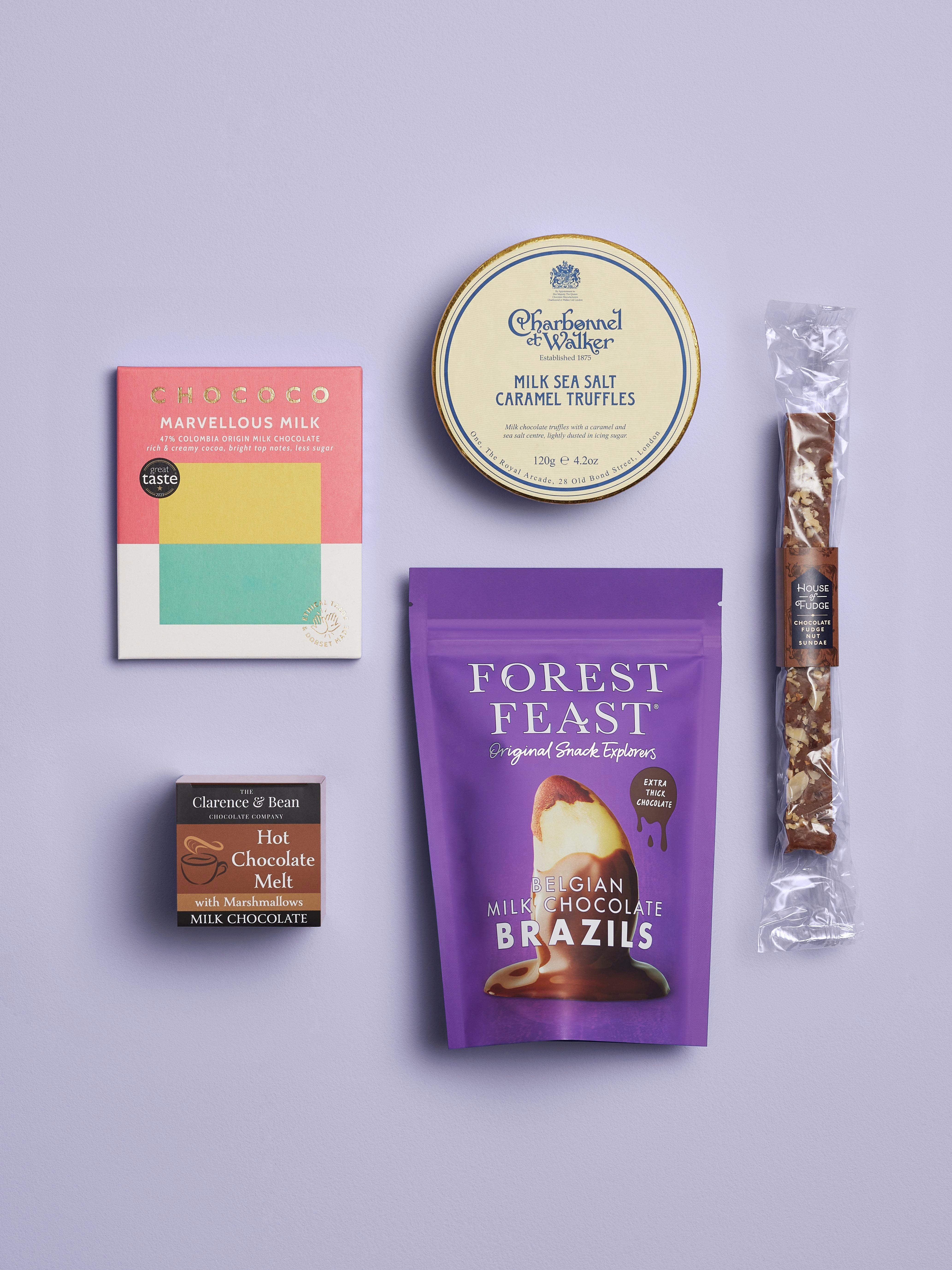 - Forest Feast Belgian Milk Chocolate Brazils 120g Charbonnel et Walker Milk Sea Salt Caramel Truffles 120g House of Fudge Chocolate Fudge Nut Sundae Fudge Log 100g Chococo Marvellous Milk Tablet Bar 75g Clarence & Bean Milk Chocolate Hot Chocolate Melt with Marshmallows 40g