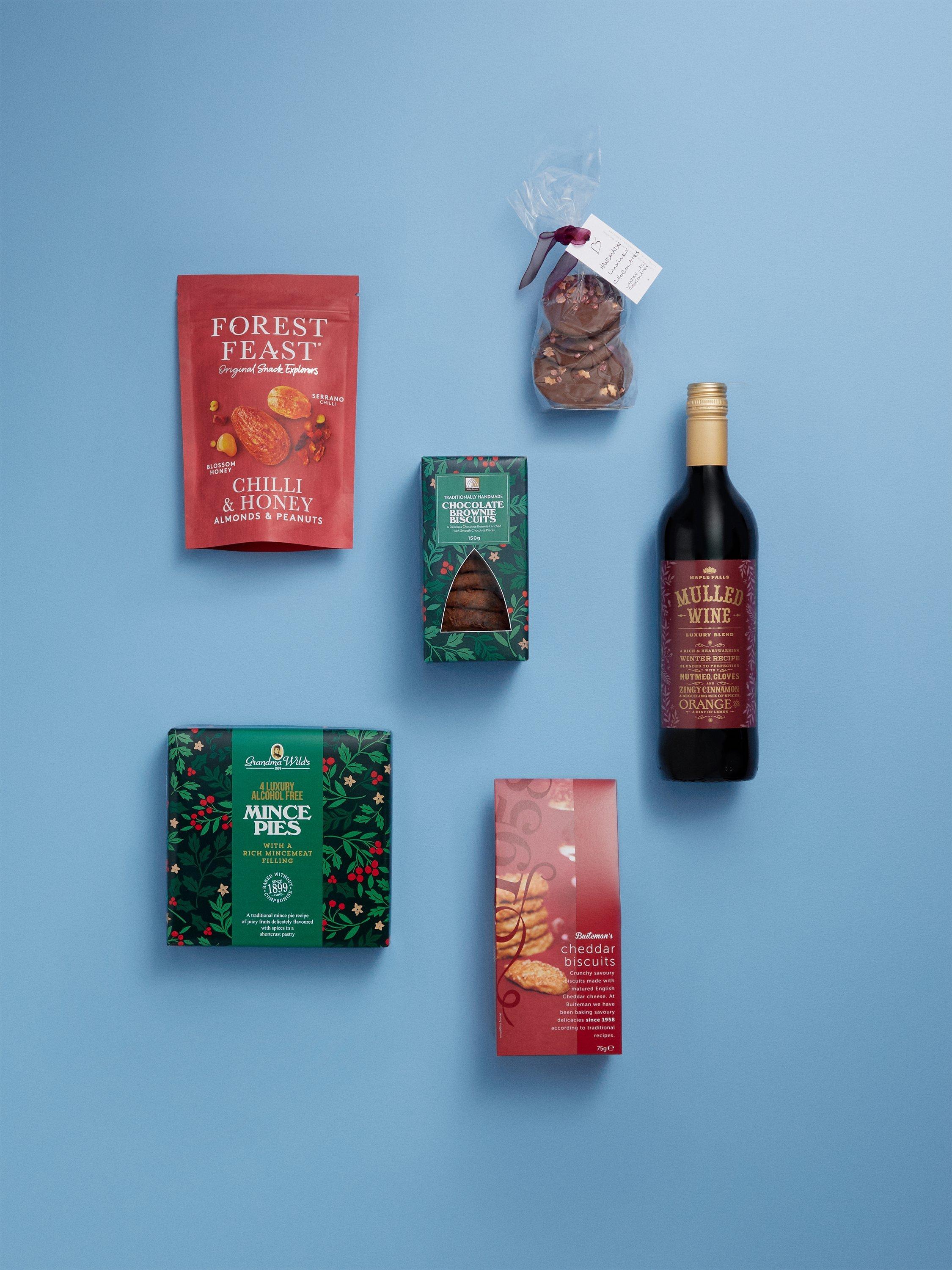 - Maple Falls Mulled Wine 75cl: Grapes contains SULPHITES. Forest Feast Slow Roasted Almonds & Peanuts with Serrano Chilli and Blossom Honey 120g: PEANUTS (36%), ALMONDS (NUTS)(20%), Sugar, Blossom Honey (3%), Salt, Rice Flour, Yeast Extract Powder, Onion Powder, Cayenne, Garlic Powder, Lemon Juice Powder, Dried Yeast, Serrano Chilli Powder, Natural Flavourings, Natural Colour (Paprika), Rosemary Extract. Buiteman 1958 Range Cheddar Biscuits in Red Gable Box 75g: WHEAT flour (GLUTEN), vegetable oils (rapeseed, palm*), matured Cheddar cheese 22% (MILK, potato starch, salt, starter culture, vegetarian rennet), barn EGG, yeast, dried MILK, salt, sugar, emulsifier: E471, spices, yeast extract, colour: paprika extract, acidity regulator: citric acid, natural flavouring. May contain traces of NUTS, SESAME, CELERY and SOYA. Abbey Biscuits Chocolate Brownie Biscuits in Green Berry Box 150g: Sugar, WHEAT Flour (WHEAT Flour, Calcium Carbonate, Iron, Nicotinamide, Vitamin B1), Margarine (Vegetable Oils (Palm, Rapeseed), Water, Salt (2.1%), Emulsifier: Polyglycerol Esters of Fatty Acids, Colours: Curcumin, Annatto, Flavouring), 100% Wholegrain OATflakes, Coconut (Desiccated Coconut, SULPHUR DIOXIDE,), Chocolate Chip Pieces (Sugar 58.5%, Cocoa Mass 33%, Cocoa Butter 8%, Emulsifier: SOYA Lecithin less than 1%, Natural Vanilla Flavouring less than 1%), Cocoa Powder (Cocoa Beans, Potassium Carbonate), Partially Inverted Refiners Syrup, Bicarbonate Of Soda, Water, Salt. Not suitable for NUT allergy sufferers due to manufacturing methods, May also contain traces of EGG, MILK, MUSTARD, OAT, SESAME & SOYA. Grandma Wild's Alcohol Free 4 Luxury Mince Pies - Green Berry Box: Mincemeat (44%) (Sugar, Vine Fruits (29%) (Raisins, Sultanas, Currants, Sunflower Oil ) Apple Puree (Apple Puree, Potassium Sorbate), Glucose-Fructose Syrup, Mixed Peel (4%) (Orange Peel, Glucose-Fructose Syrup, Lemon Peel, Sugar, Acidity Regulator: Citric Acid), Vegetable Suet (Palm Oil, Rice Flour, Sunflower Oil), Modified Maize Starch, Mixed Spice, Acidity Regulator: Citric Acid, Colour: Caramel, Orange Oil, Lemon Oil), Fortified WHEAT Flour (WHEAT Flour, Calcium Carbonate, Niacin, Iron, Folic Acid, Thiamin), Vegetable Oil (Palm, Rapeseed, Water, Salt, Flavouring), Sugar, Water, Invert Sugar Syrup. Linden Lady Milk Chocolate Buttons with Copper & Burgundy Tree, Holly and Disc Sprinkles 90g: Chocolate: Sugar, cocoa butter, cocoa mass, whole MILK powder, emulsifier: SOYA lecithin, flavour: natural vanilla. MILK chocolate min. Cocoa solids 33%, MILK solids 20%. Decorations: Sugar, Rice flour, Glucose syrup, Palm oil, Vegetable fat (Palm kernel, Palm oil), Invert sugar syrup, Thickeners: Gum Arabic, Xanthan gum, E462 Ethyl cellulose; Stabilizers: Xanthan gum; Humectant: Glycerol; Emulsifier: Mono and Diglycerides of fatty acids; Colours: Iron oxides. For allergens, see ingredients in capitals.