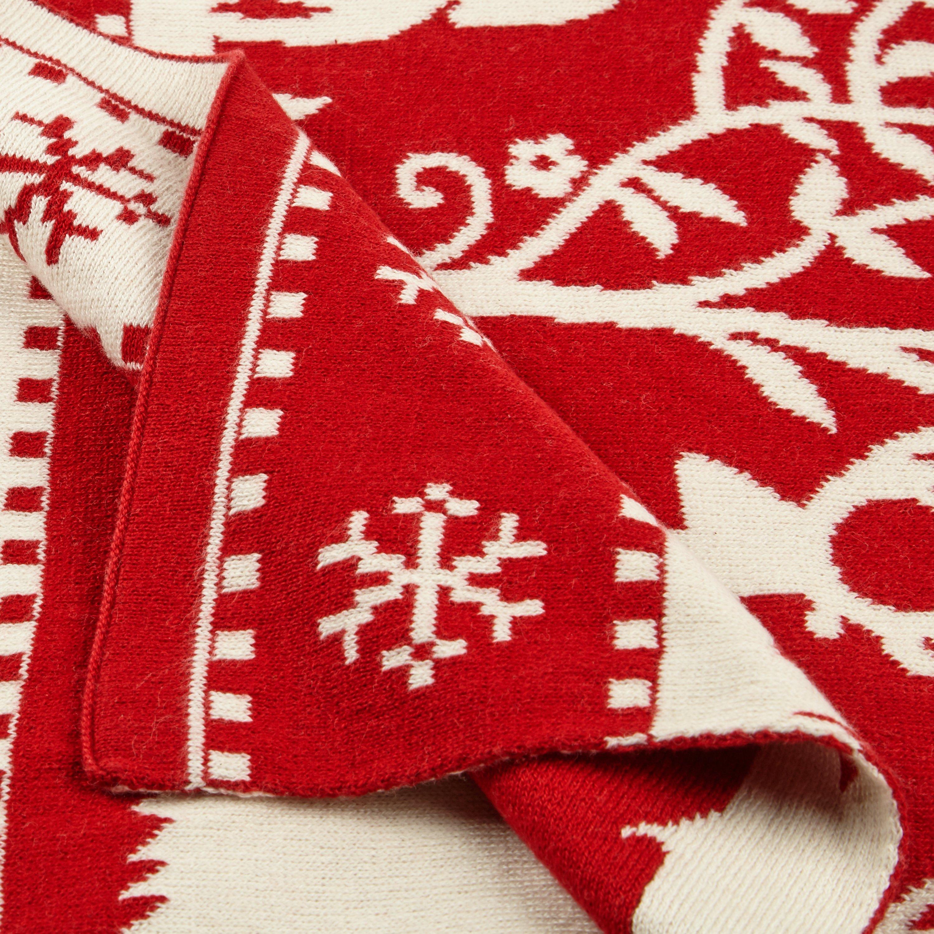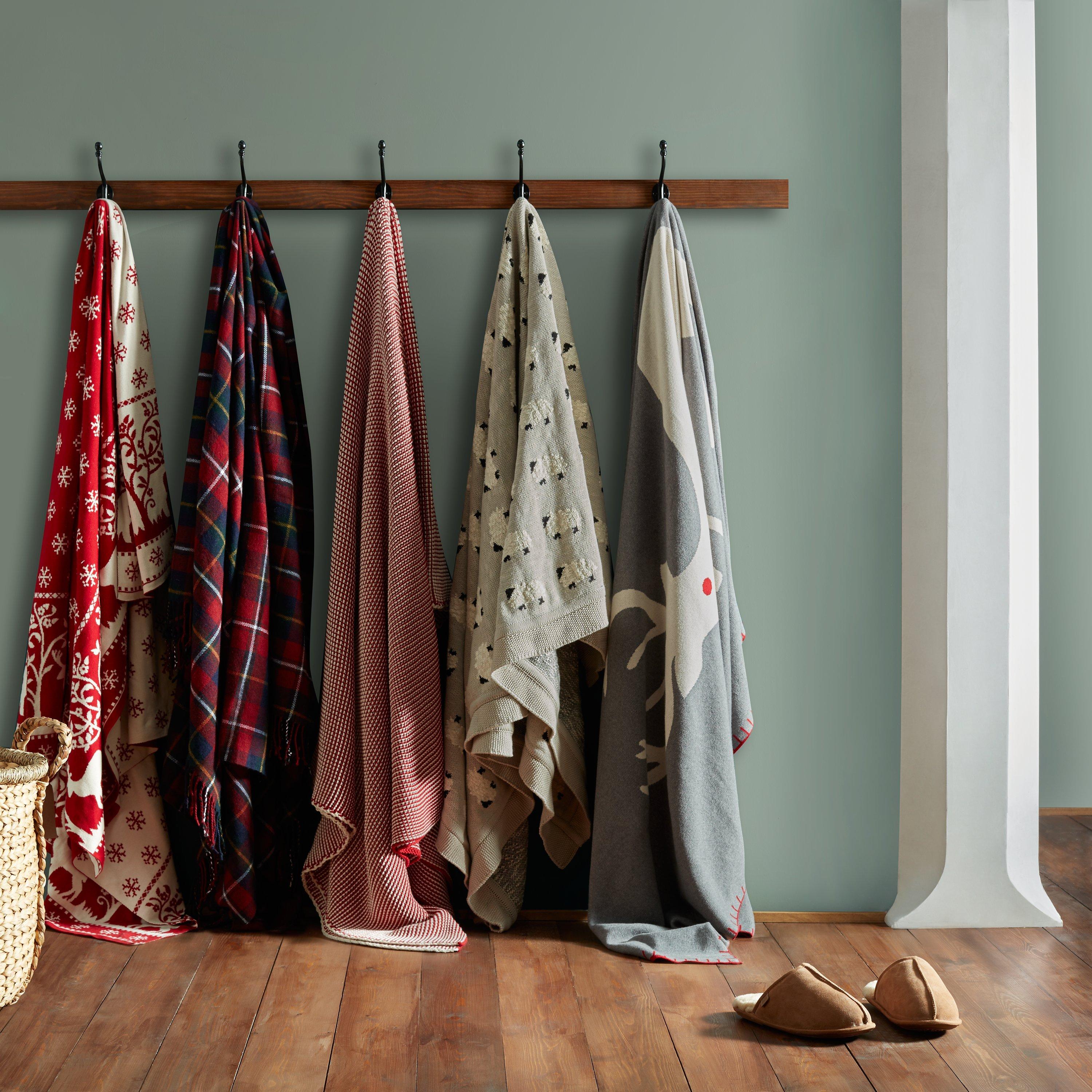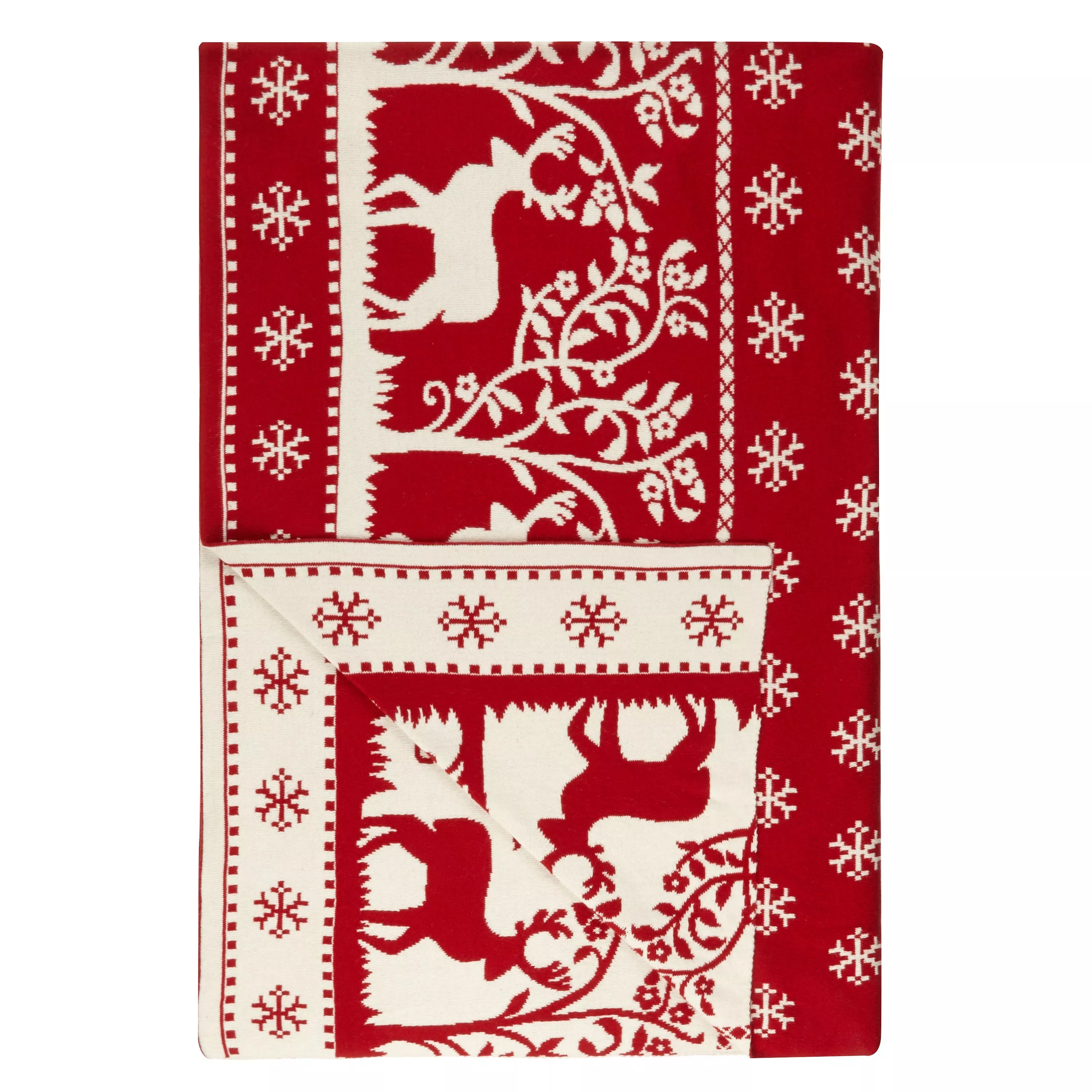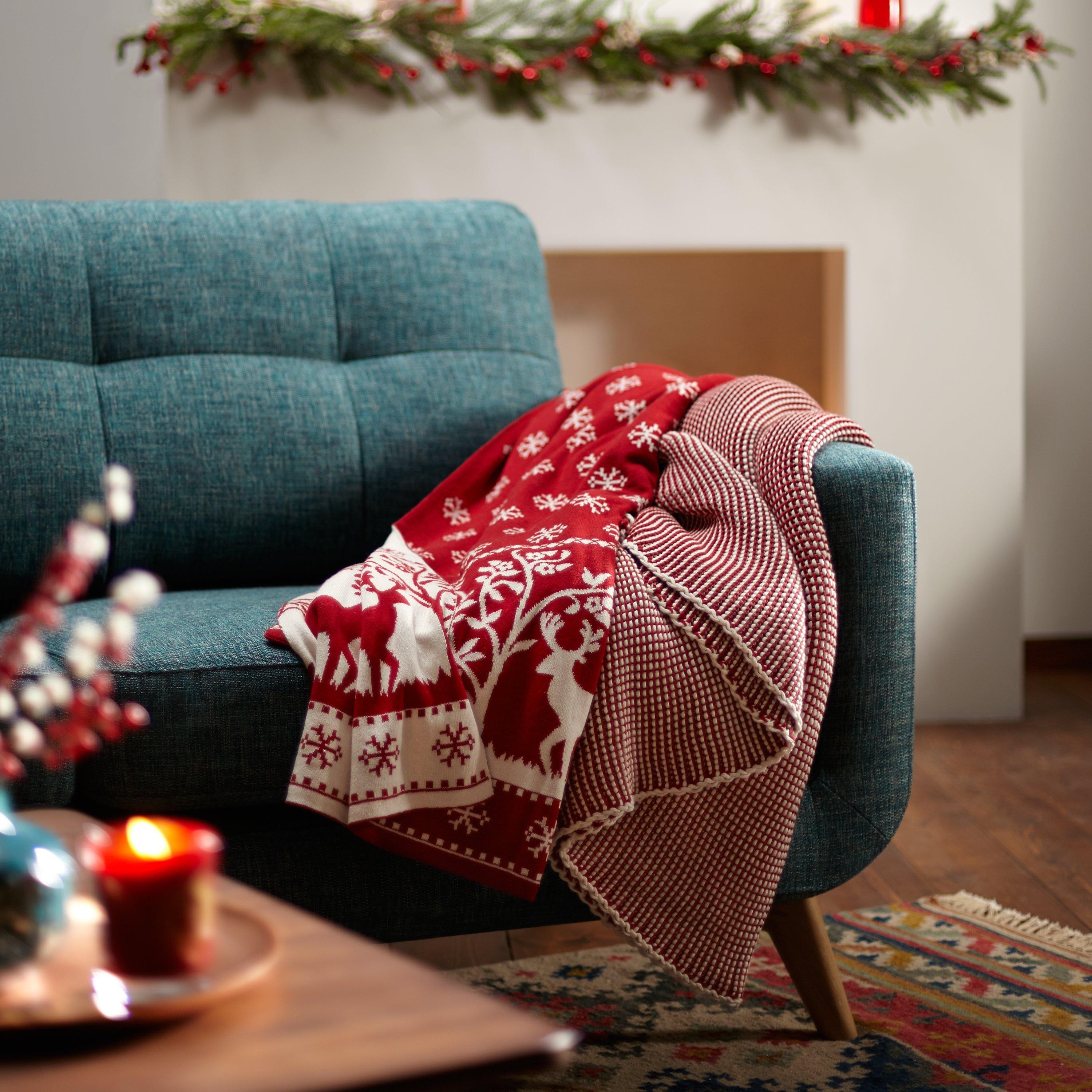 Fun, festive and folksy, this knitted cotton reindeer throw is the ideal accessory for bringing a Christmassy touch to your home.
