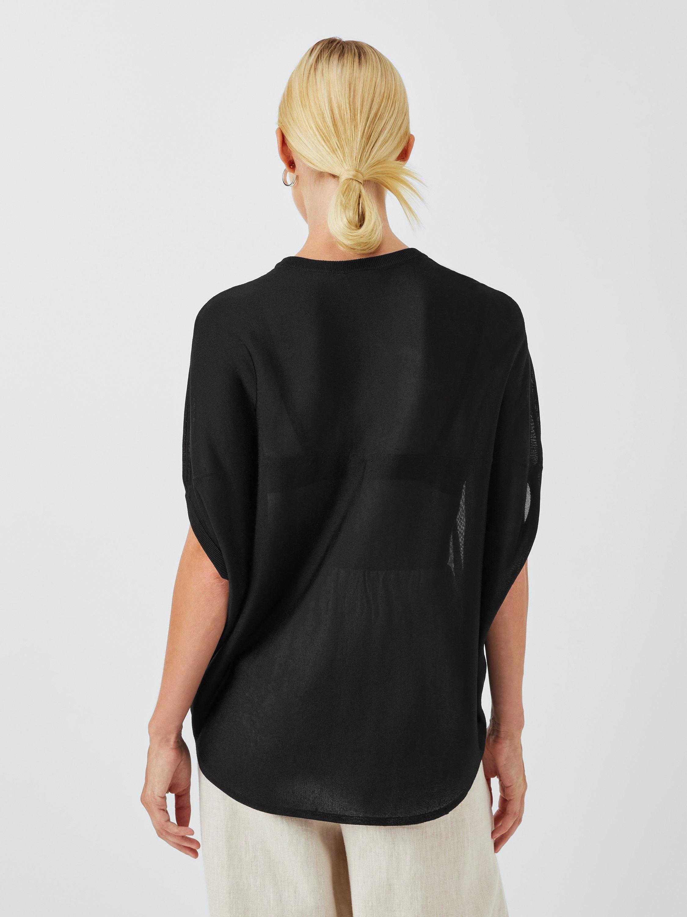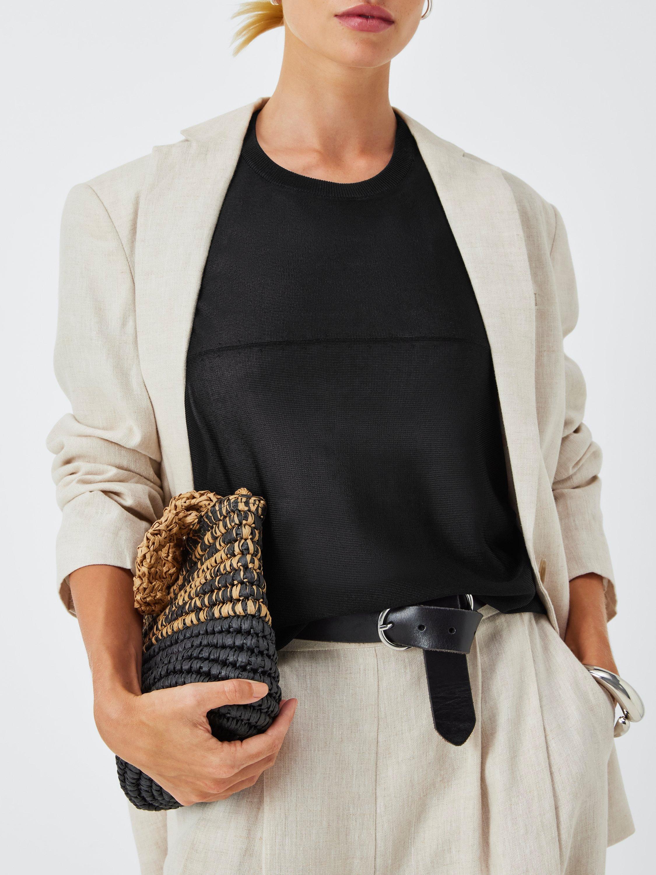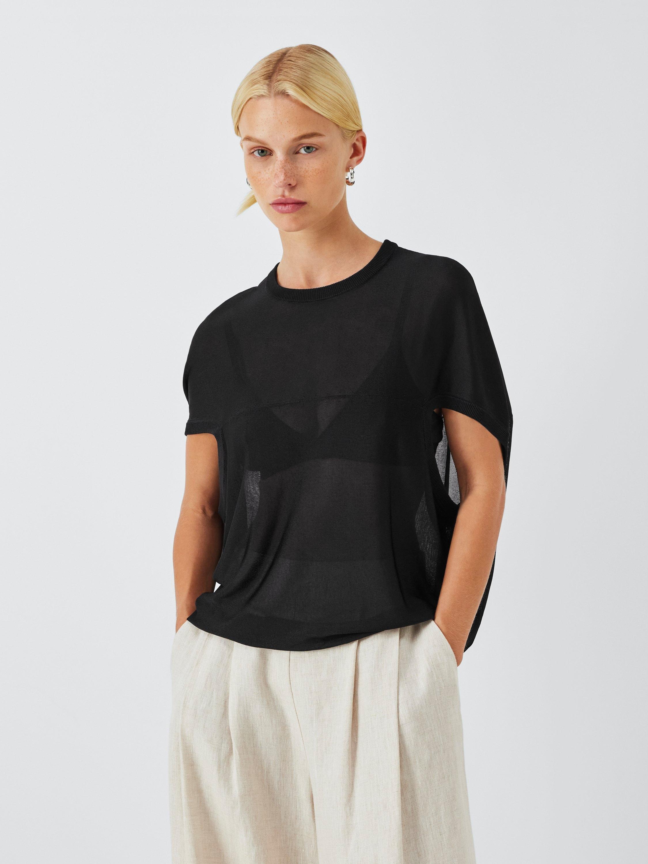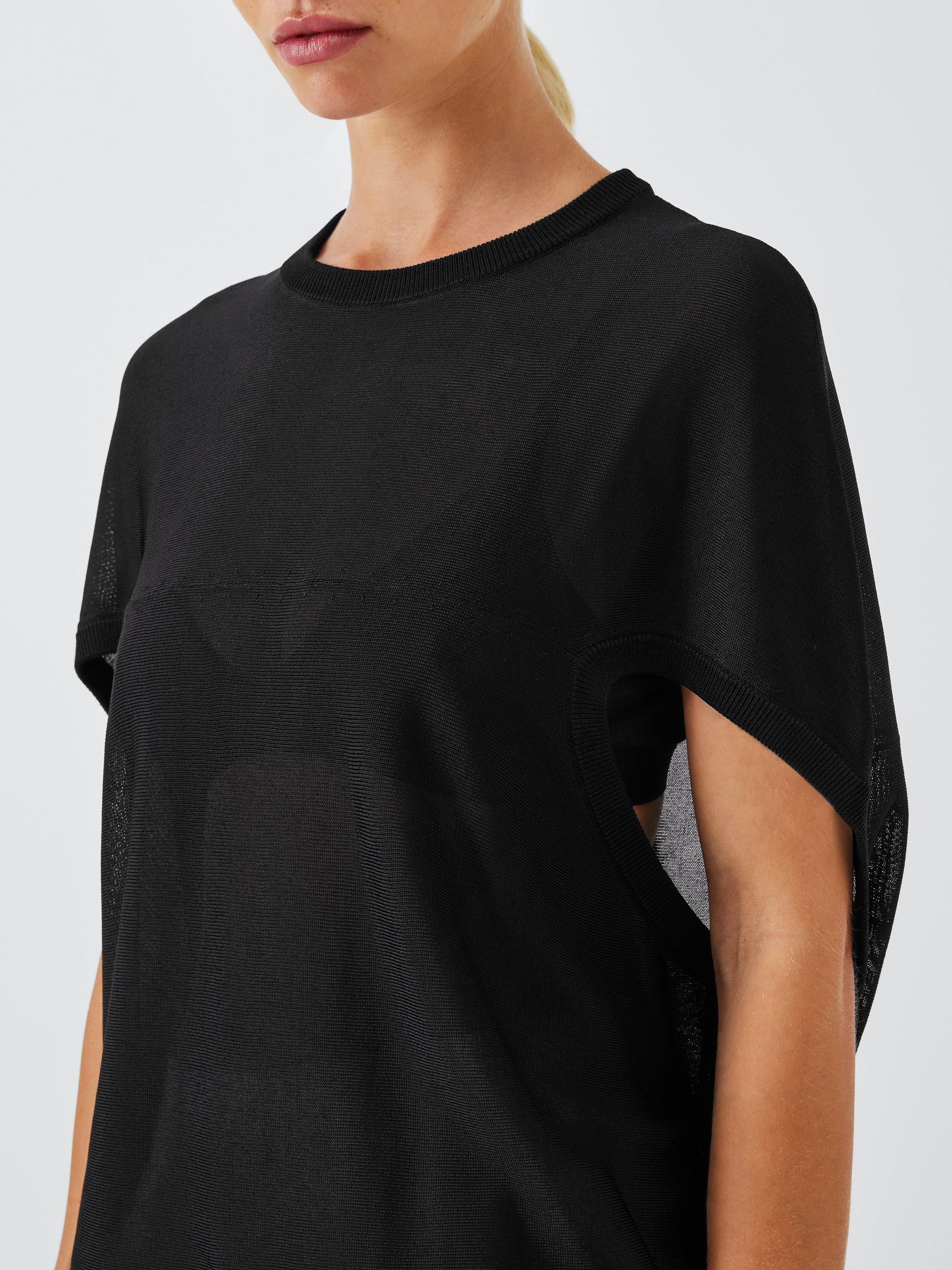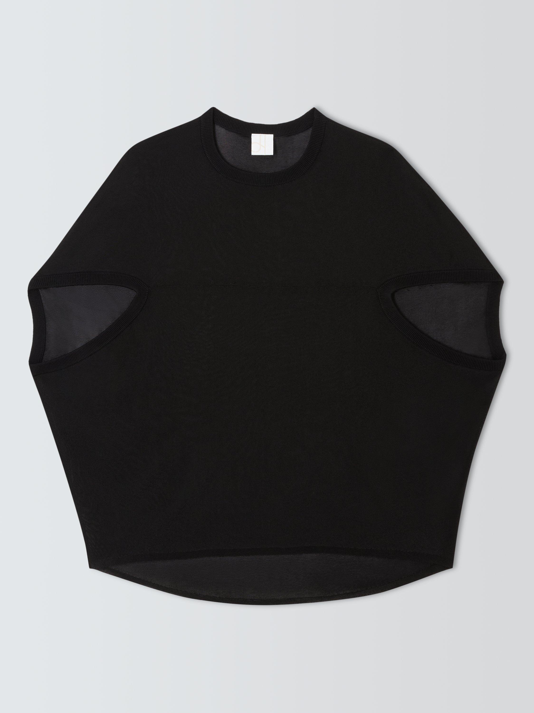 A new take on the classic knit top, this version comes in a circular style with subtle, slit arm holes and a curved hem.