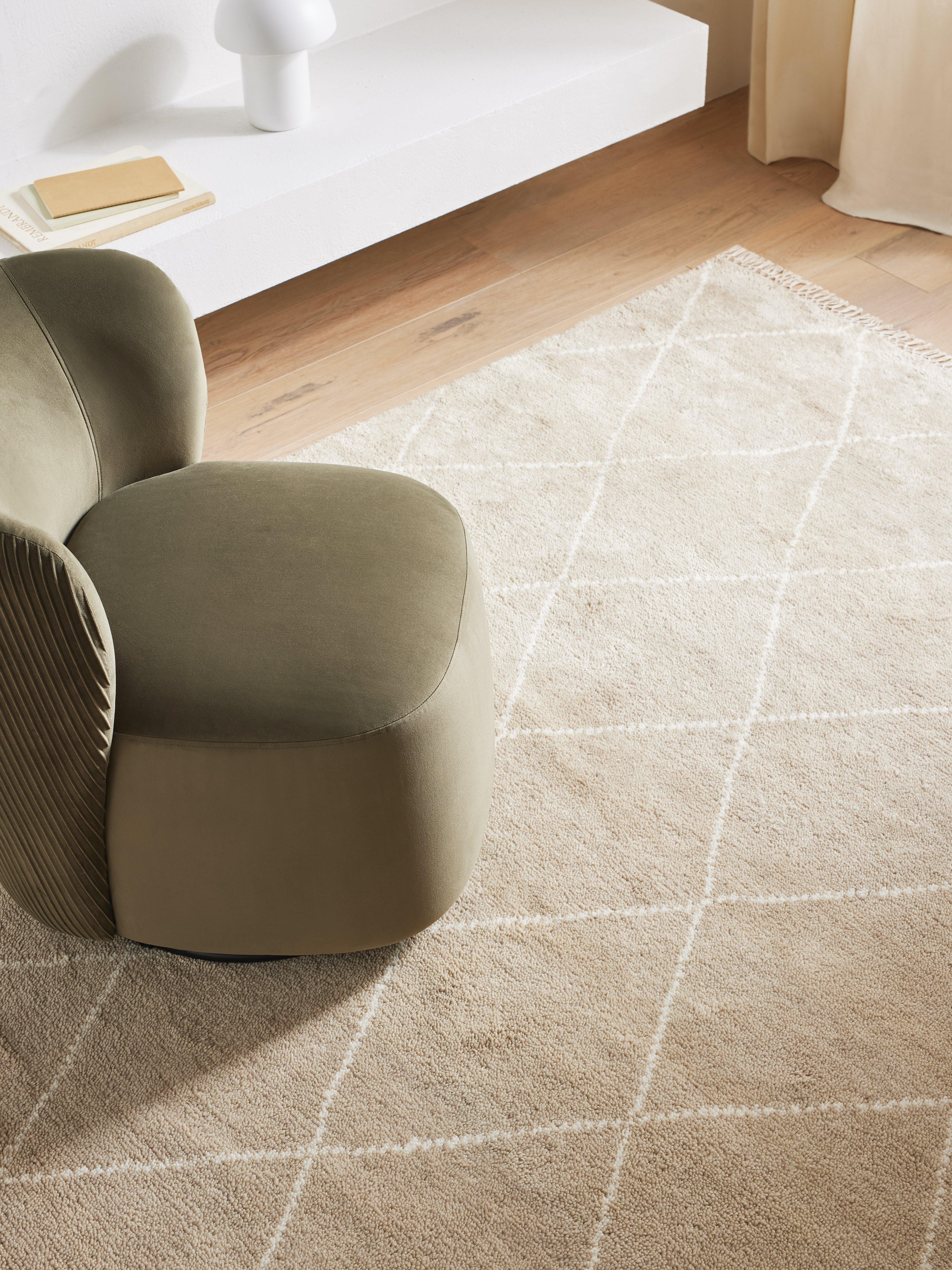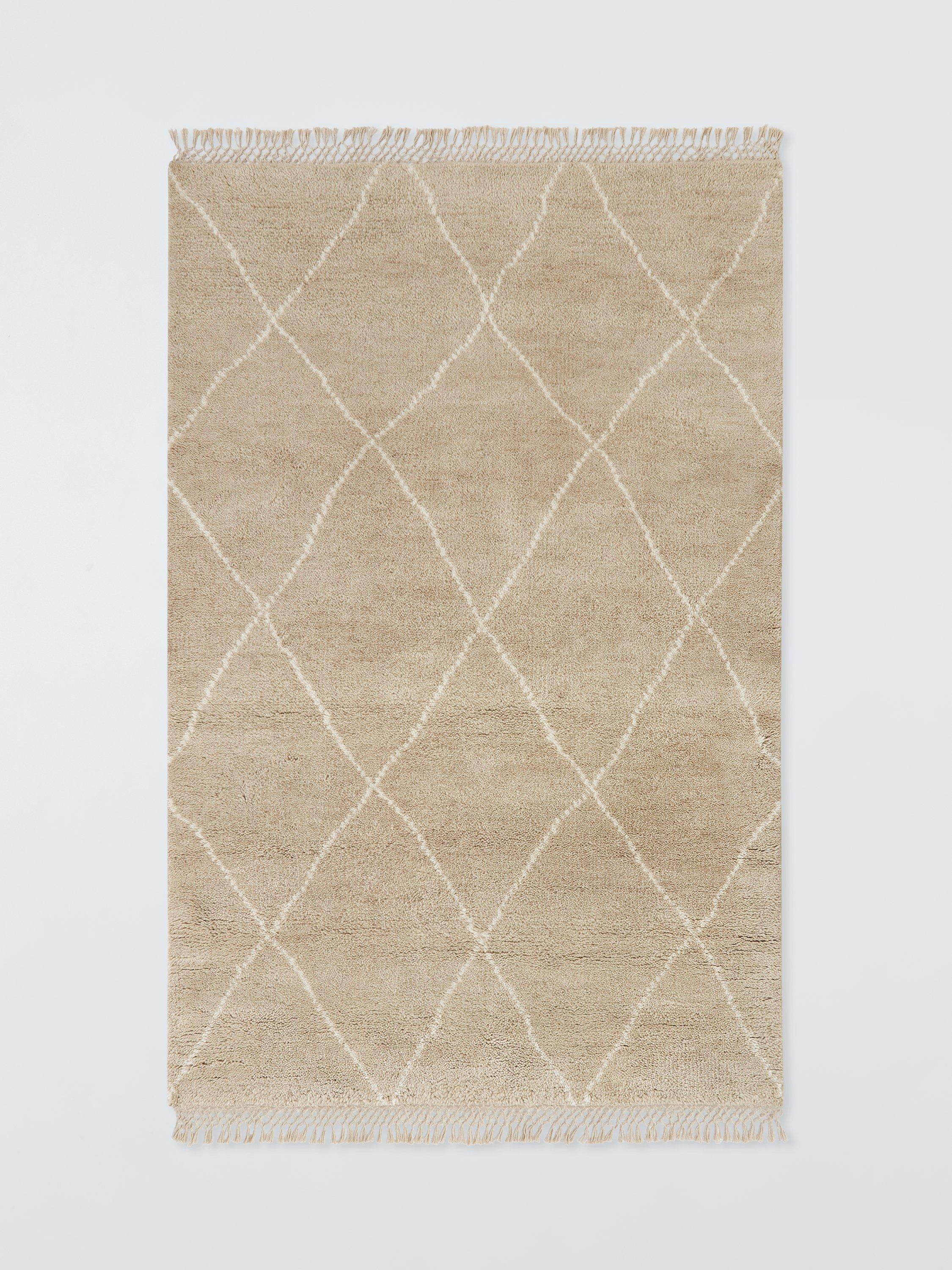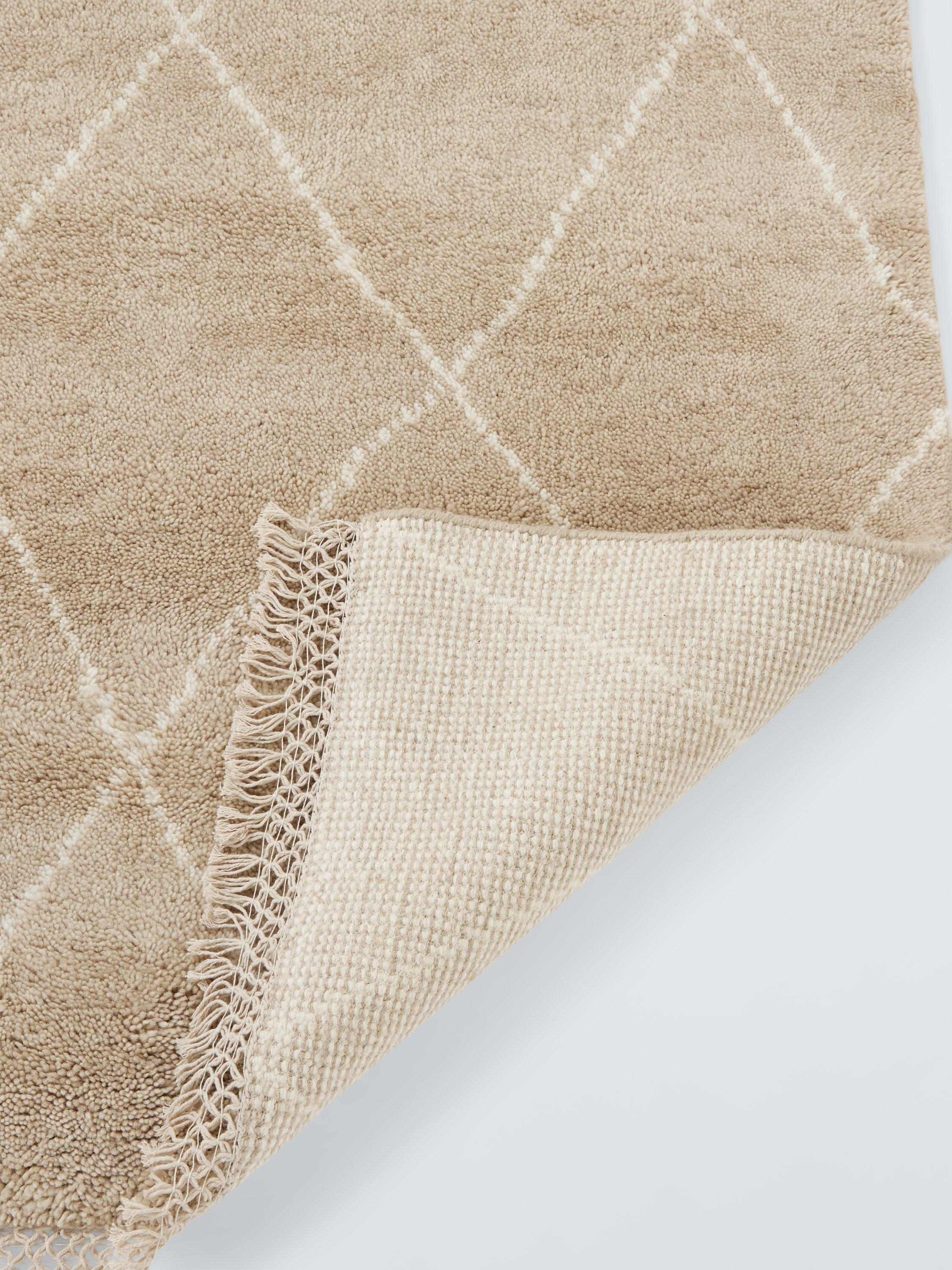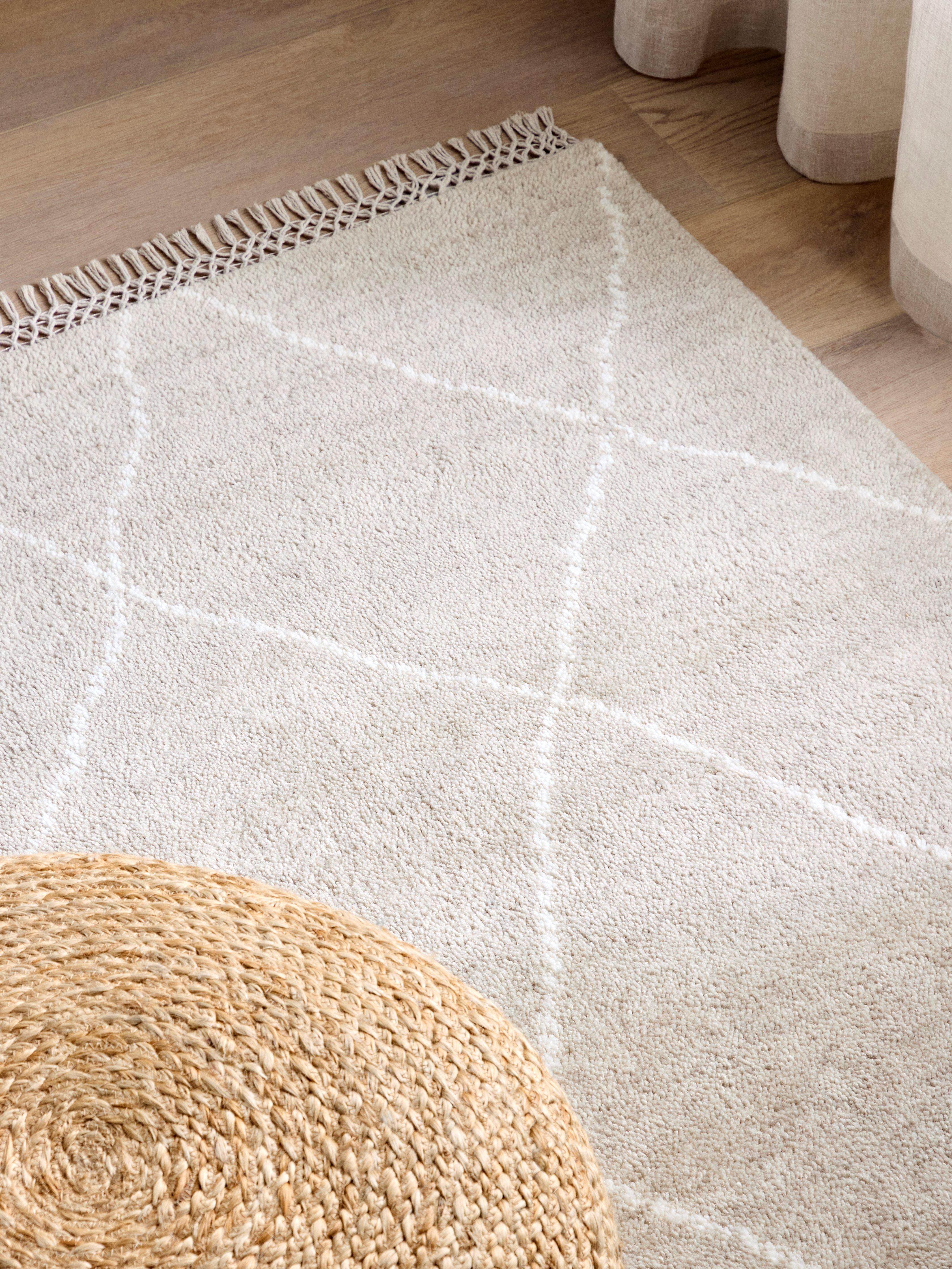 One of the oldest styles of rug design, our in-house design team imagined this floor covering with a timeless diamond Berber-style pattern. Sitting on plush, 100% wool for an inimitably soft feel underfoot, tassels at either end add a relaxed twist to contrast the rigid, geometric pattern.