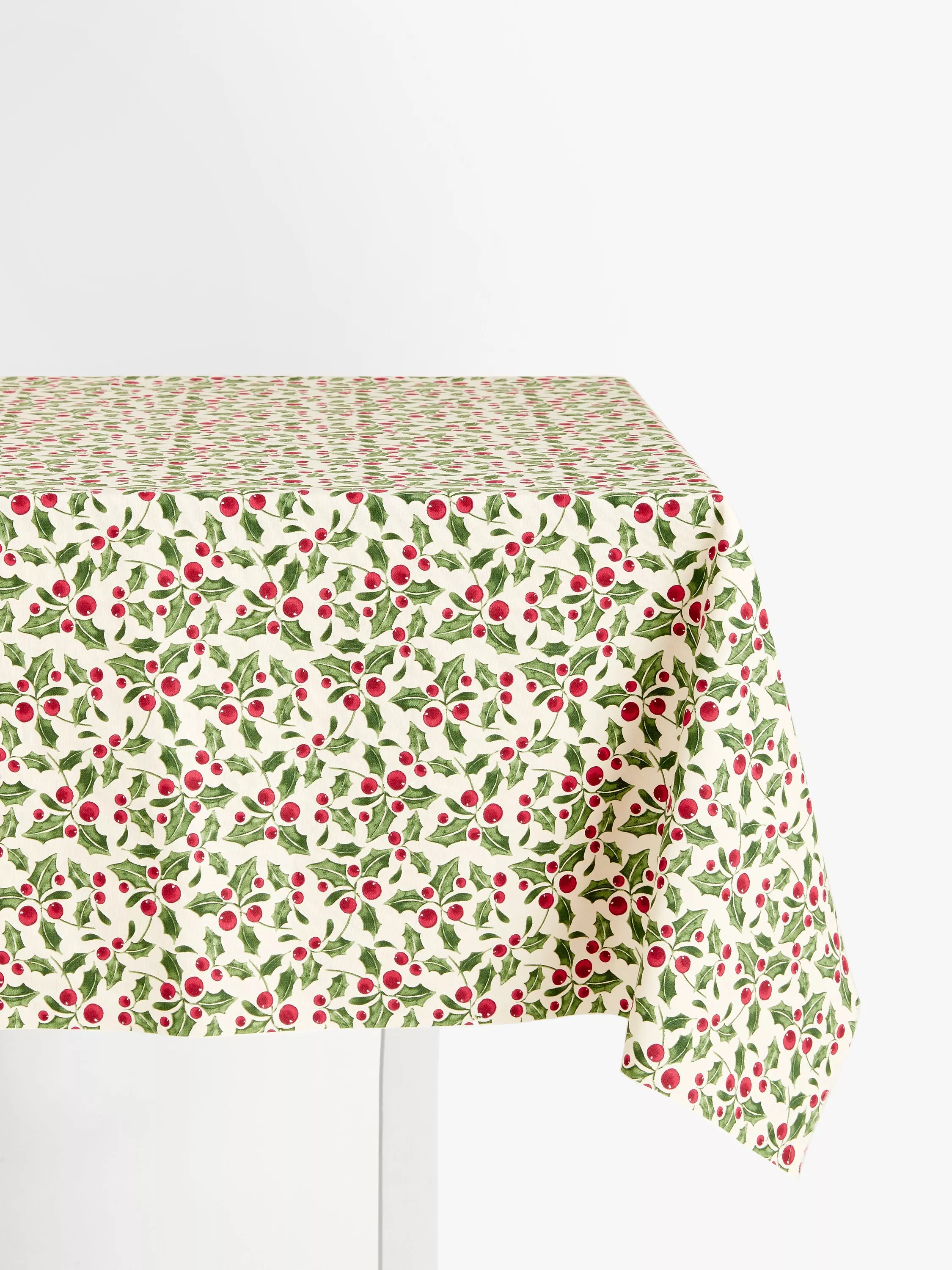 A PVC tablecloth fabric with Christmas holly design and gloss finish.