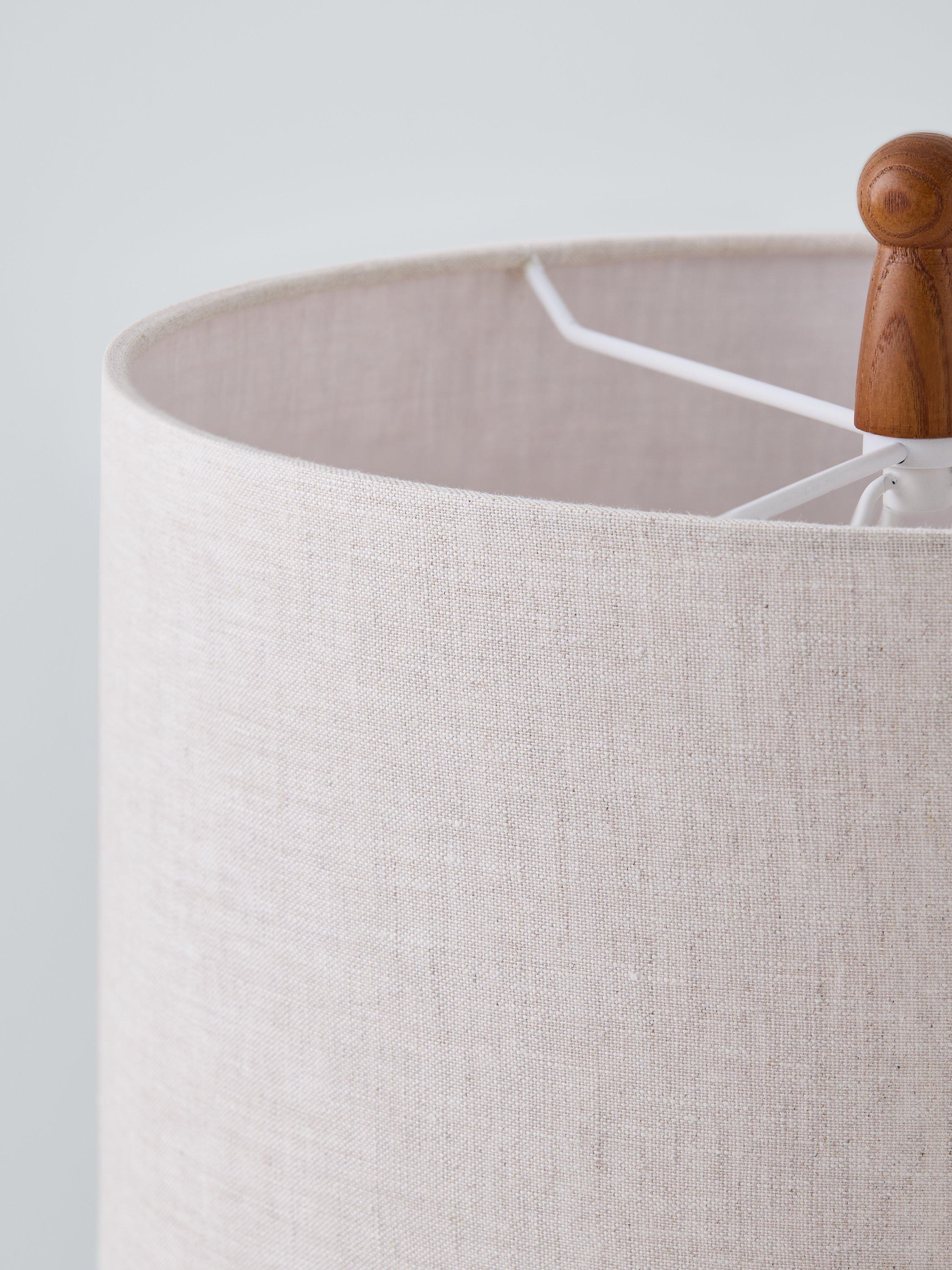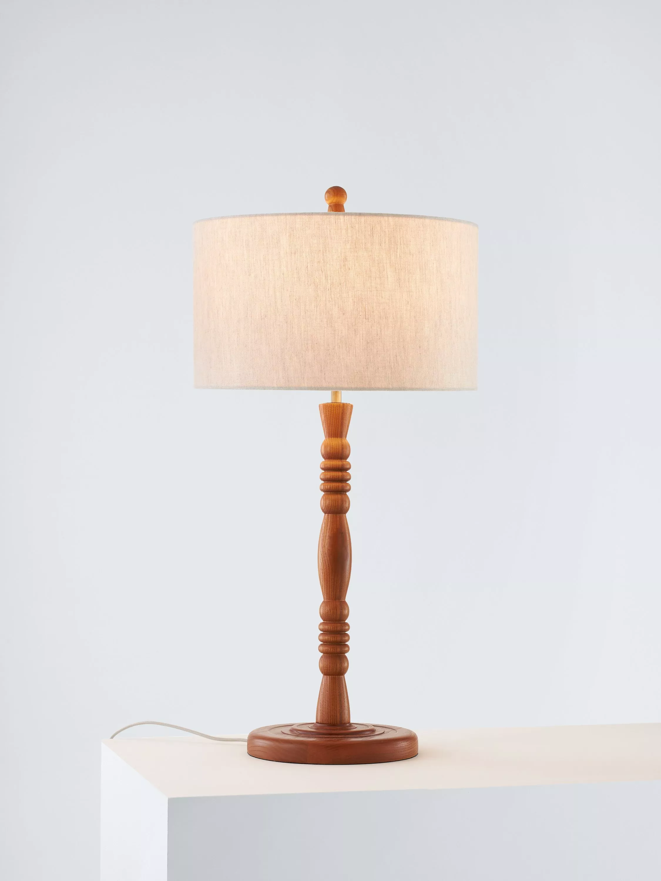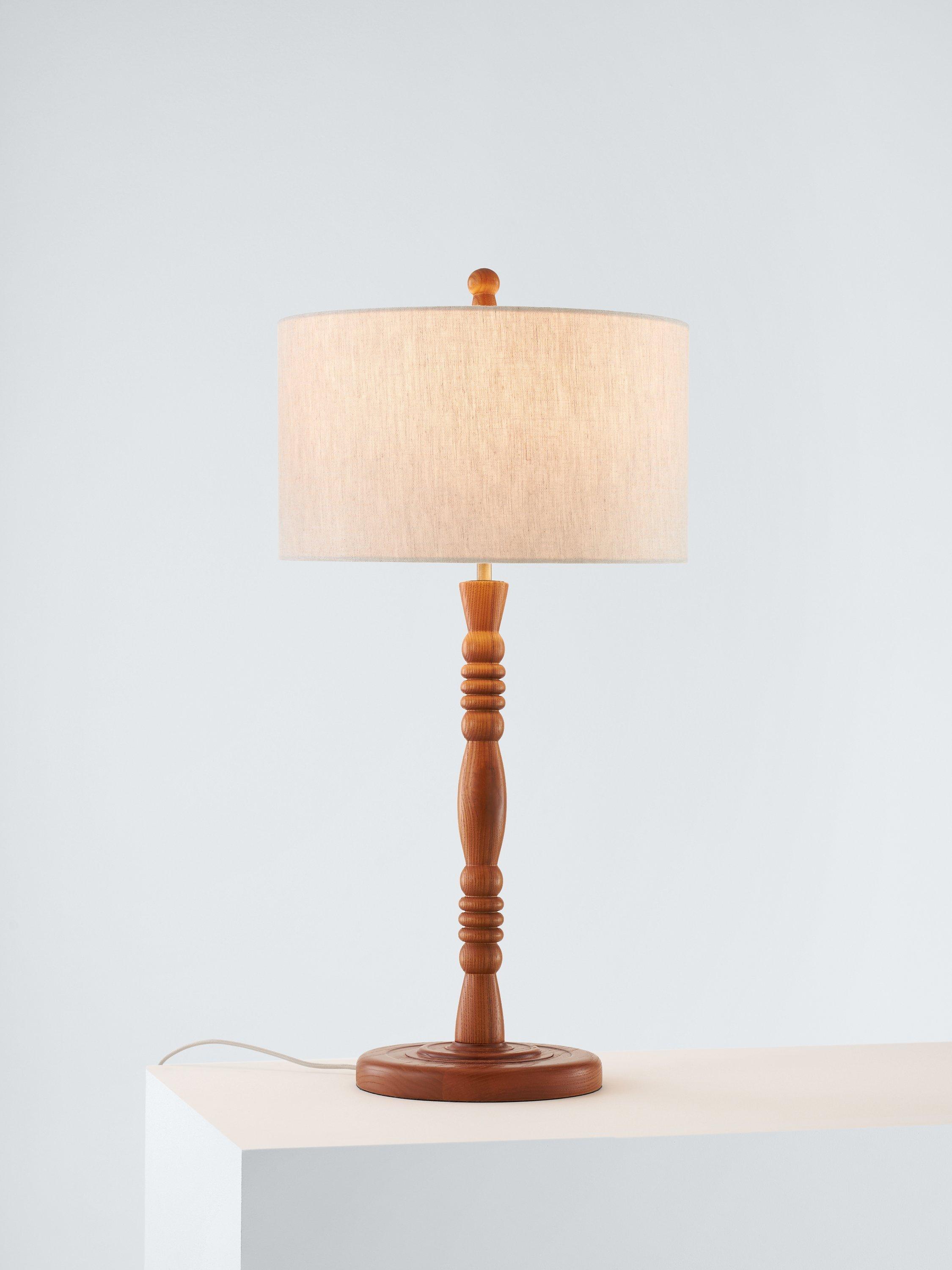 This table lamp is designed with a classic candlestick silhouette. The lamp's stem rises up from a turned, solid ash base and the drum lampshade adds a warm wash of light that suits a variety of living spaces.