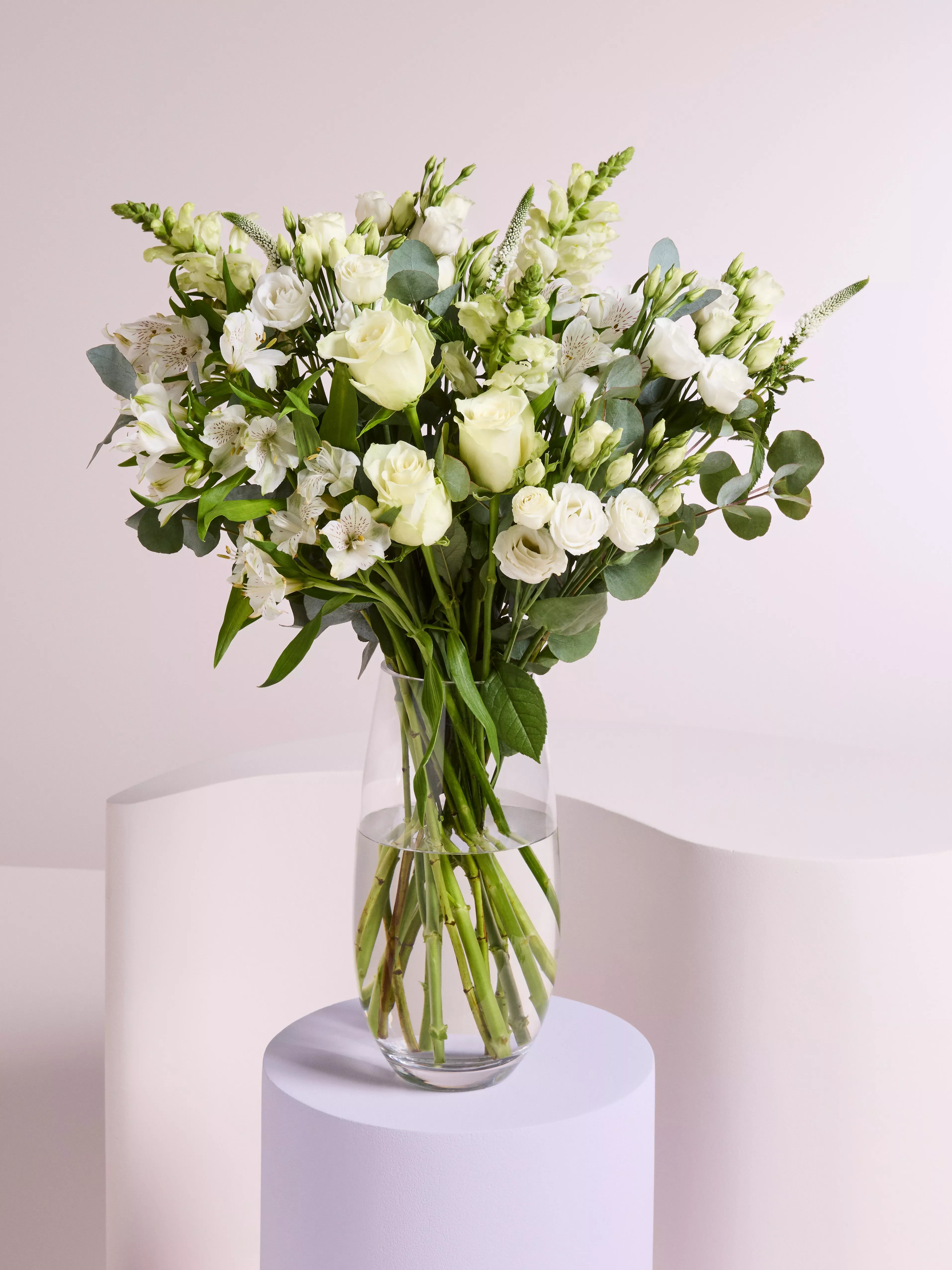 This beautiful hand-tied bouquet includes a classic white mix of lissianthus, antirrhinum and veronica, accompanied by intermediate white roses and alstromeria with soft grey eucalyptus.
