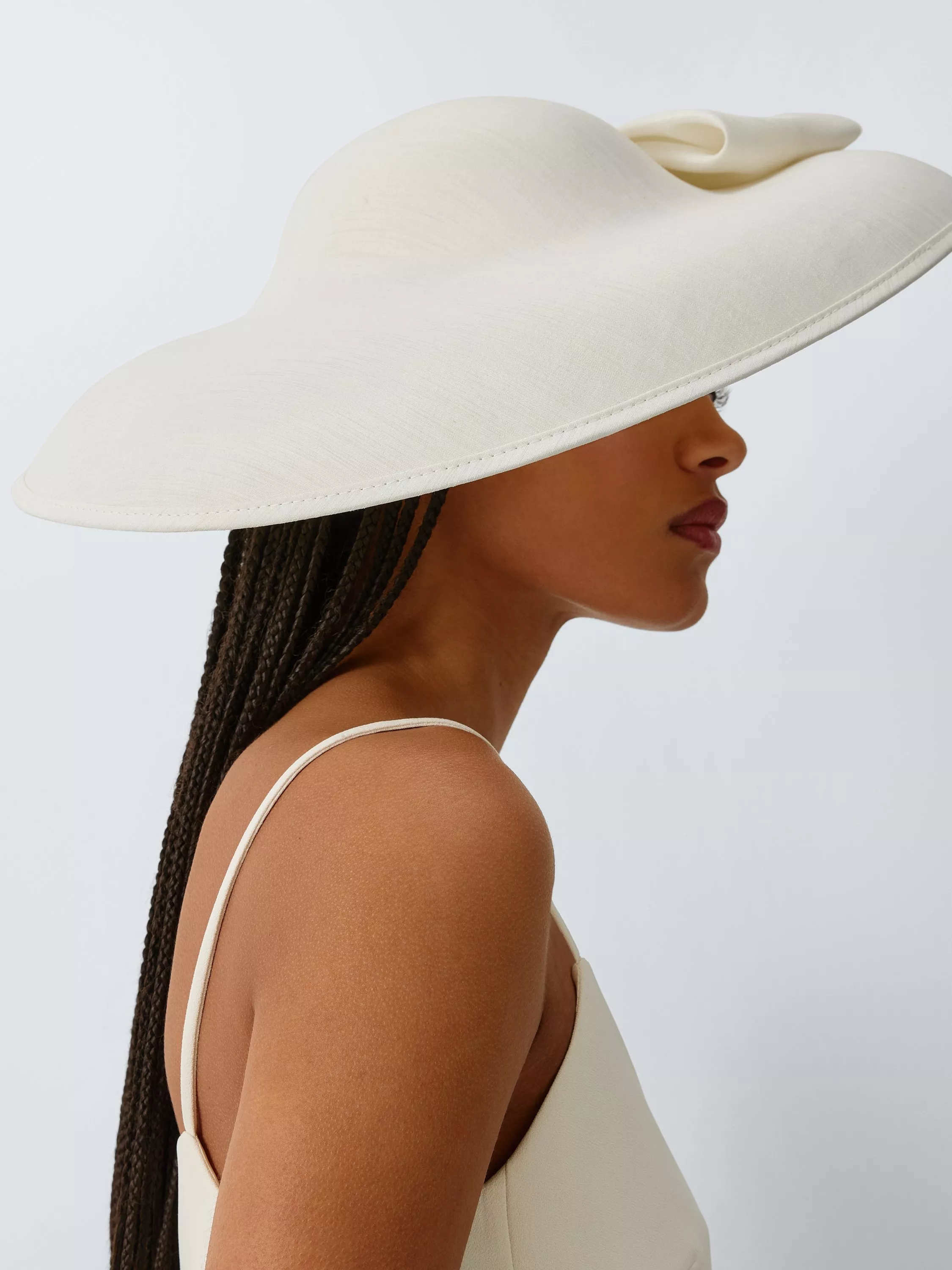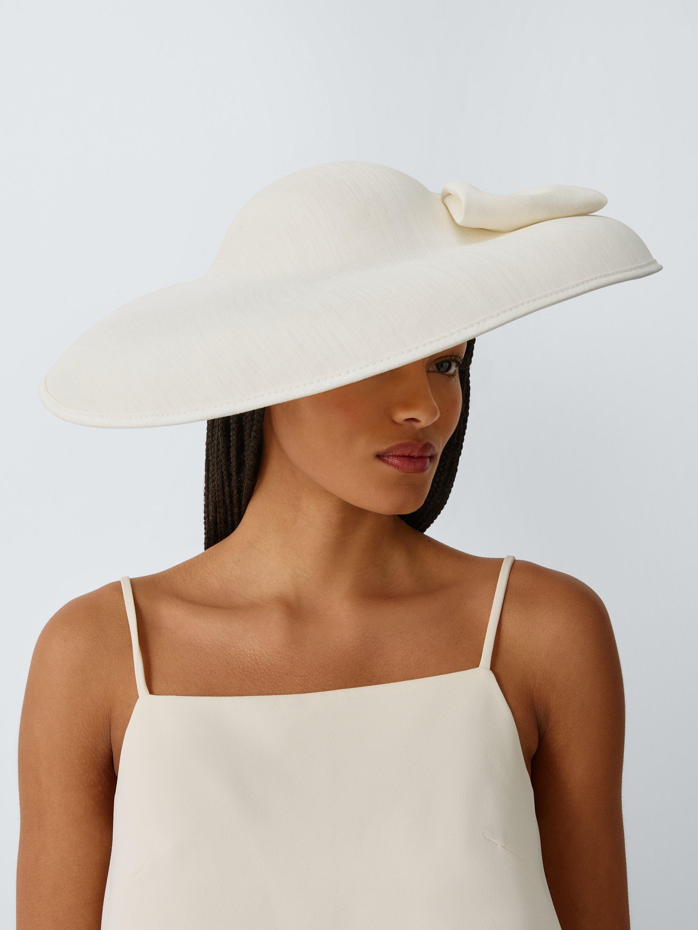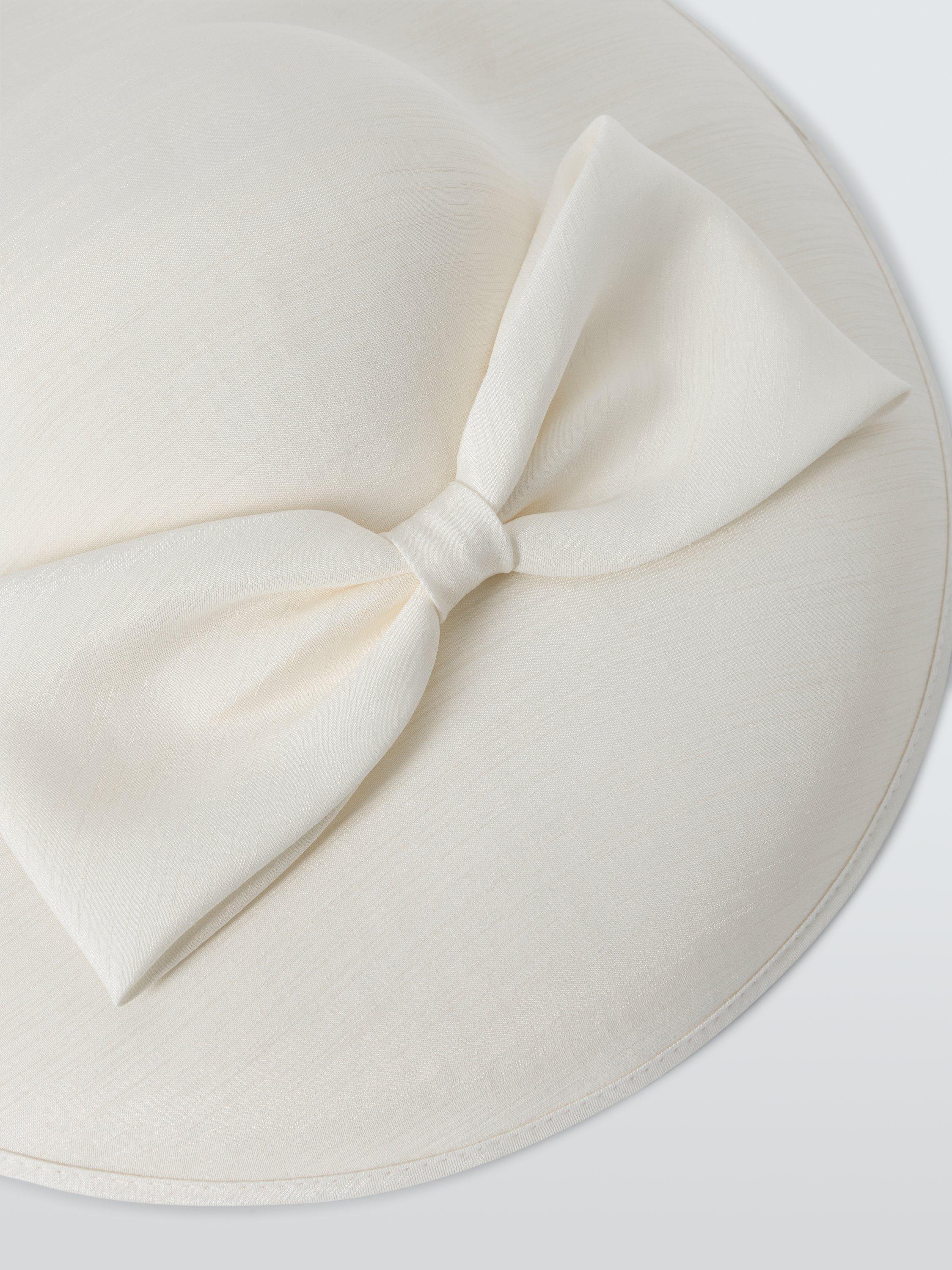 In a solid ivory colour throughout, this downward brim hat with oversized bow embellishment has a refined look.
