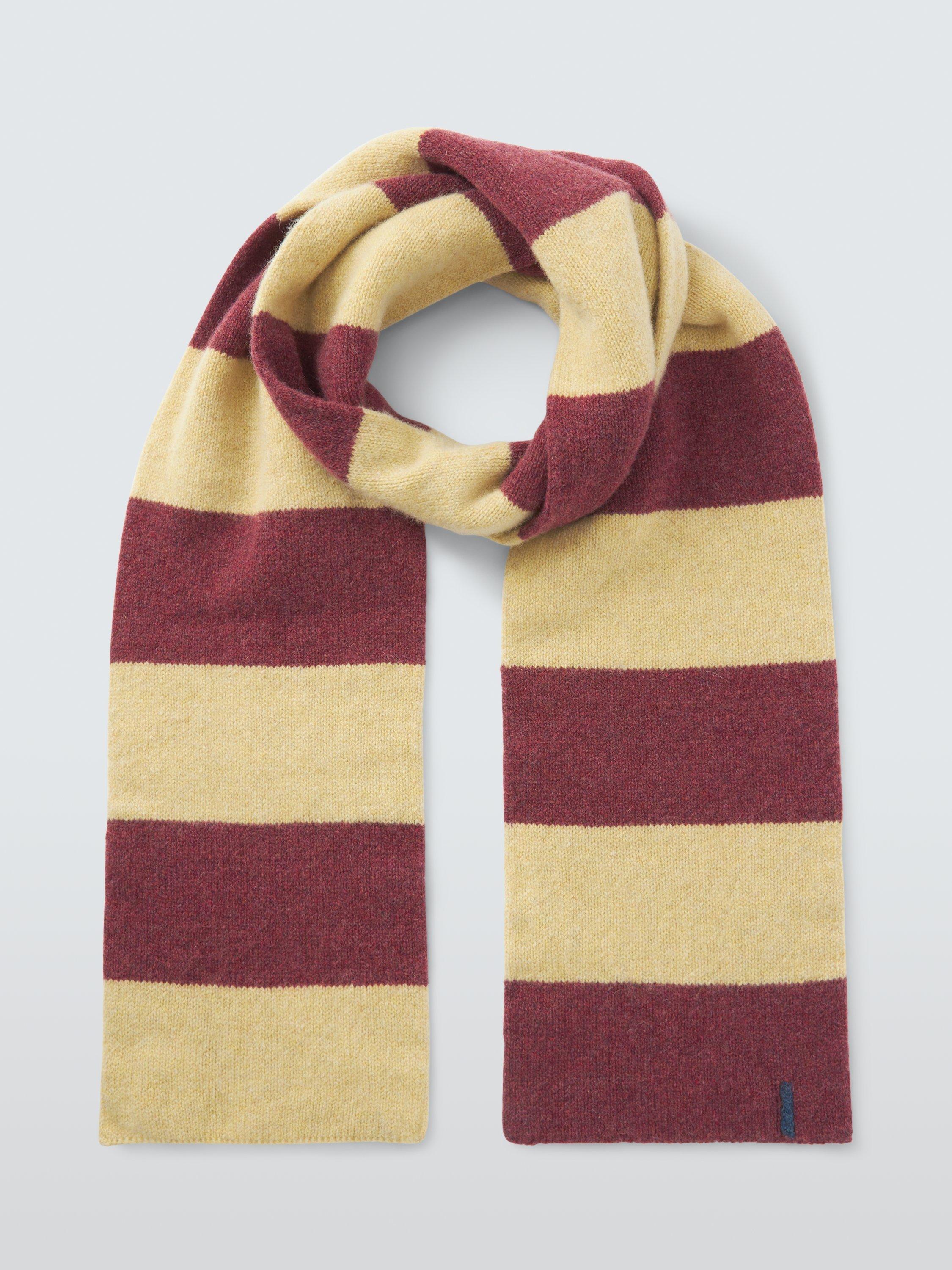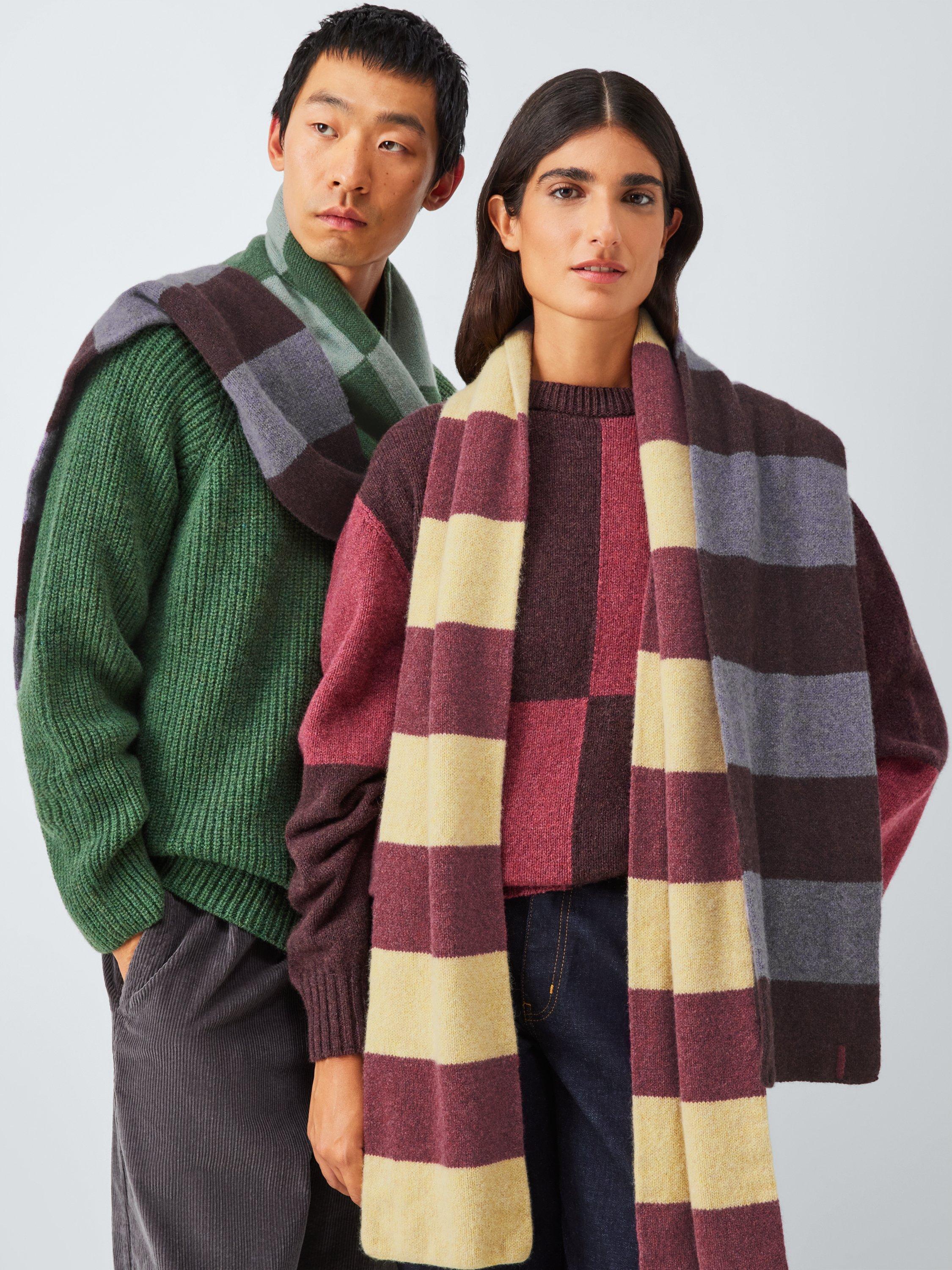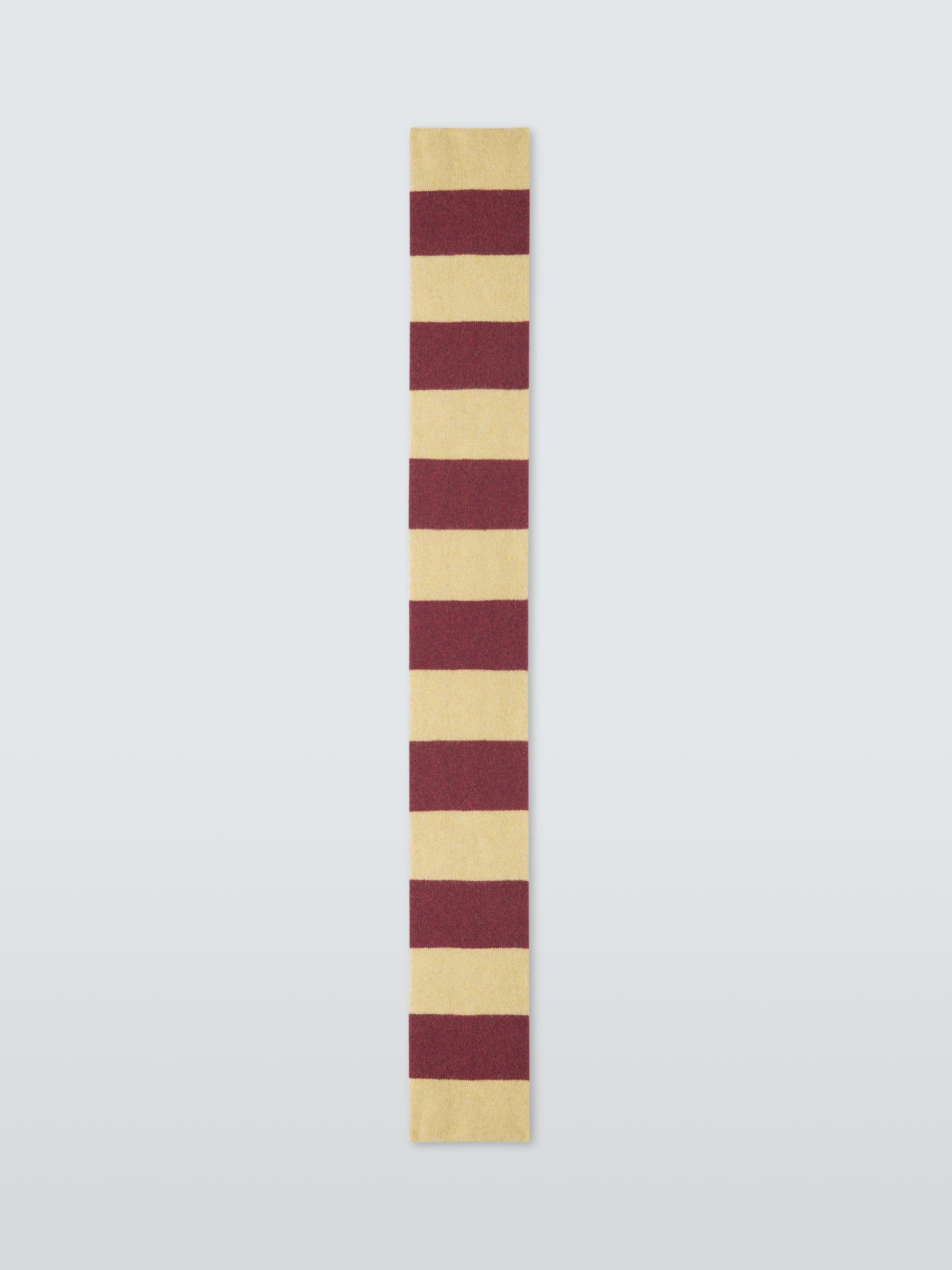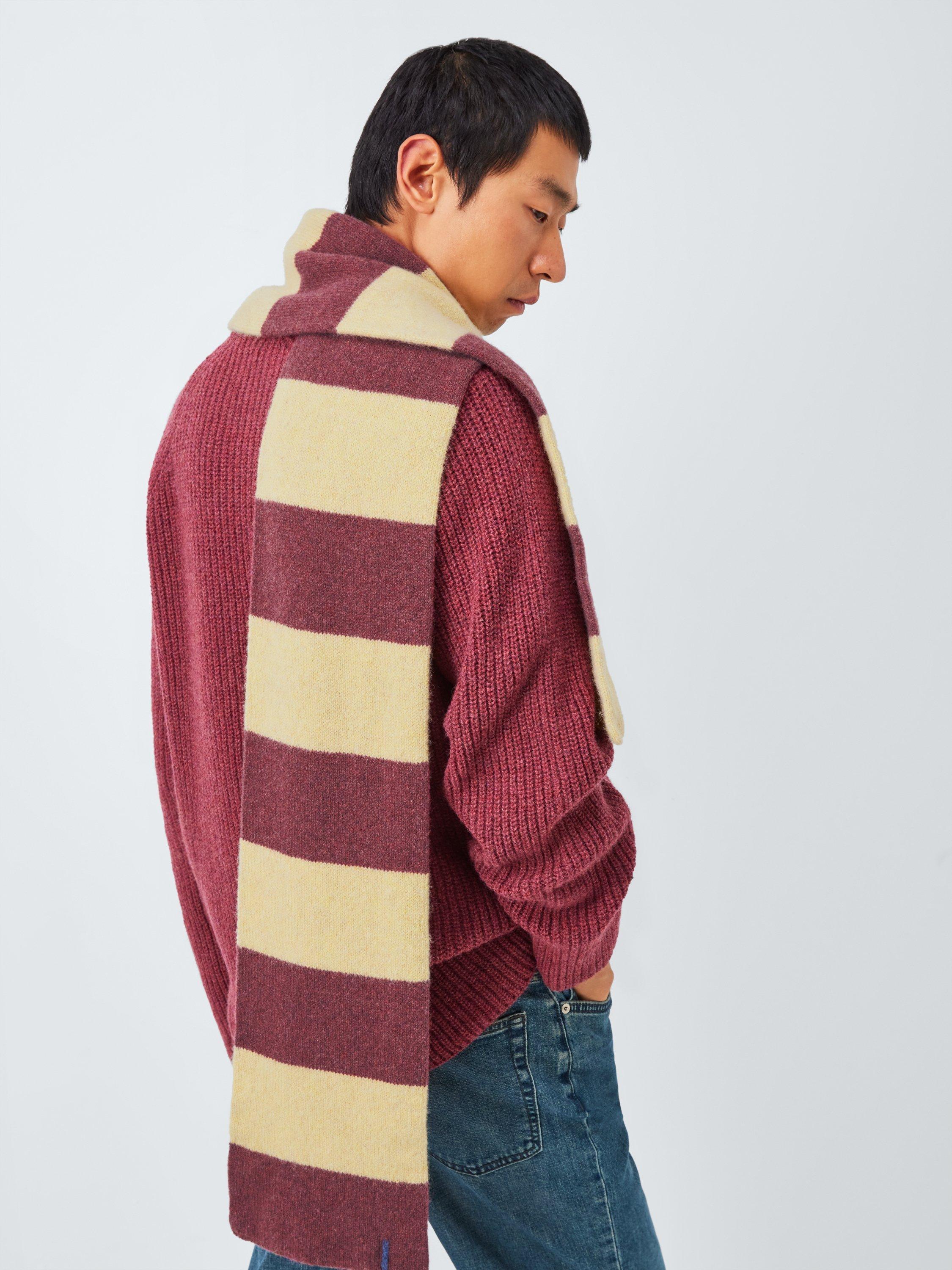 Made in the UK from warming wool, this scarf is defined by bold stripe detailing. It also features a contrasting knitted tab.