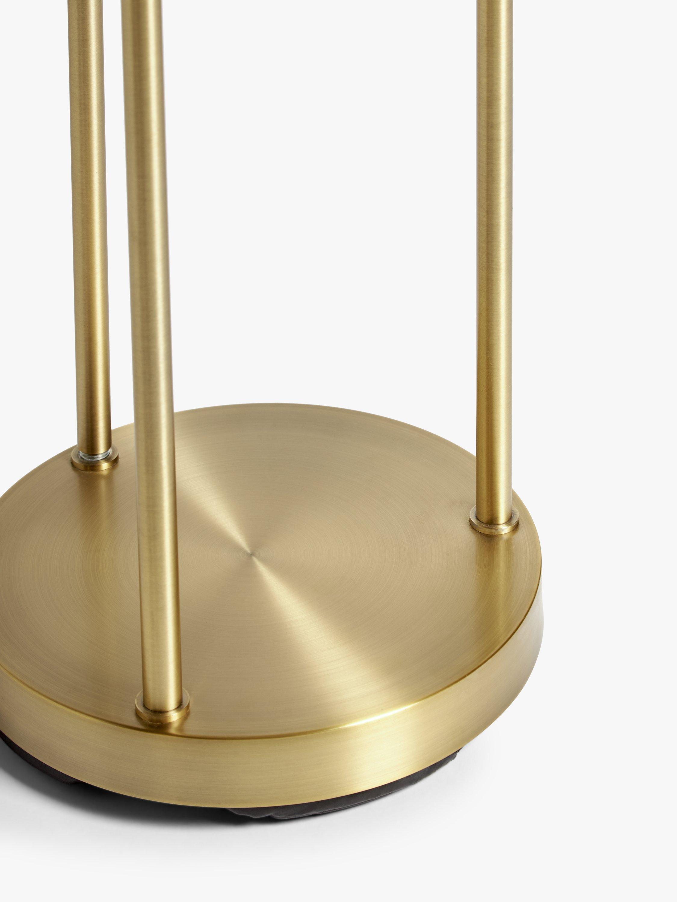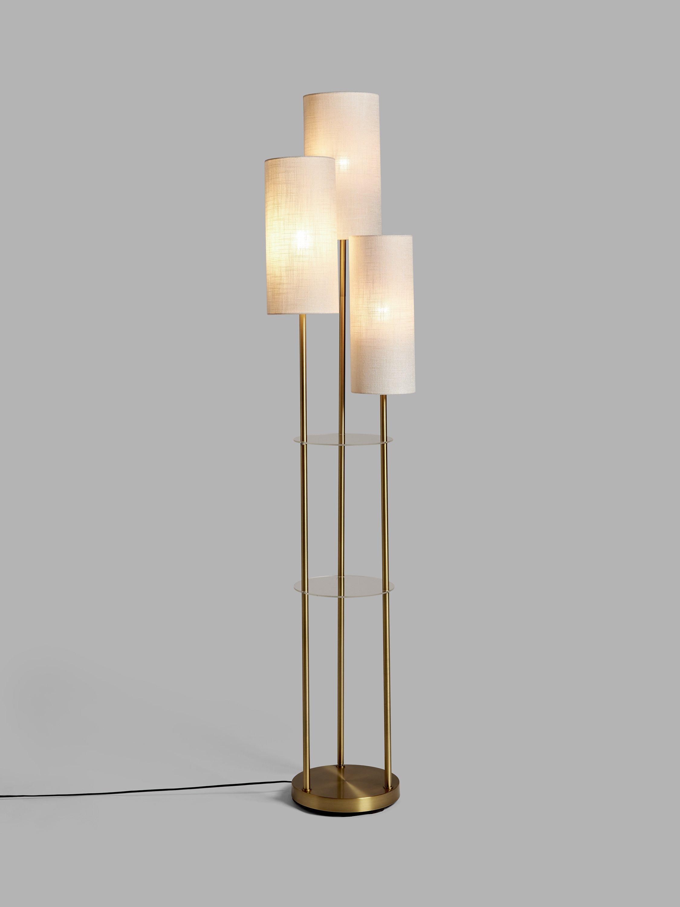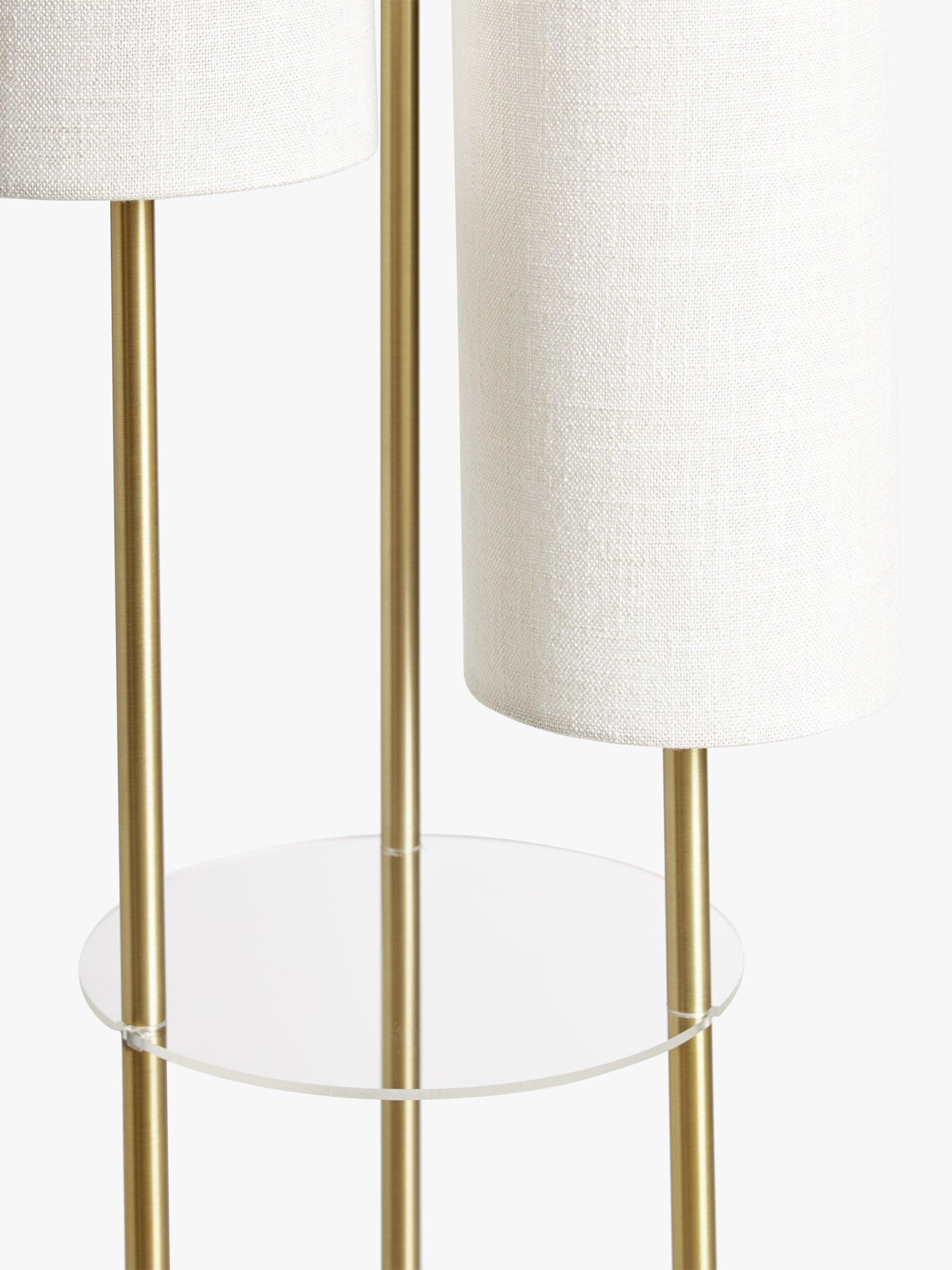 The Cluster Trio floor lamp provides plenty of light and offers extra storage to your space. Three brass poles secured in a round base, each with a white linen cylindrical shade. The poles also support two clear acrylic shelves for display or storage purposes. Finished with a foot switch on a black cord.