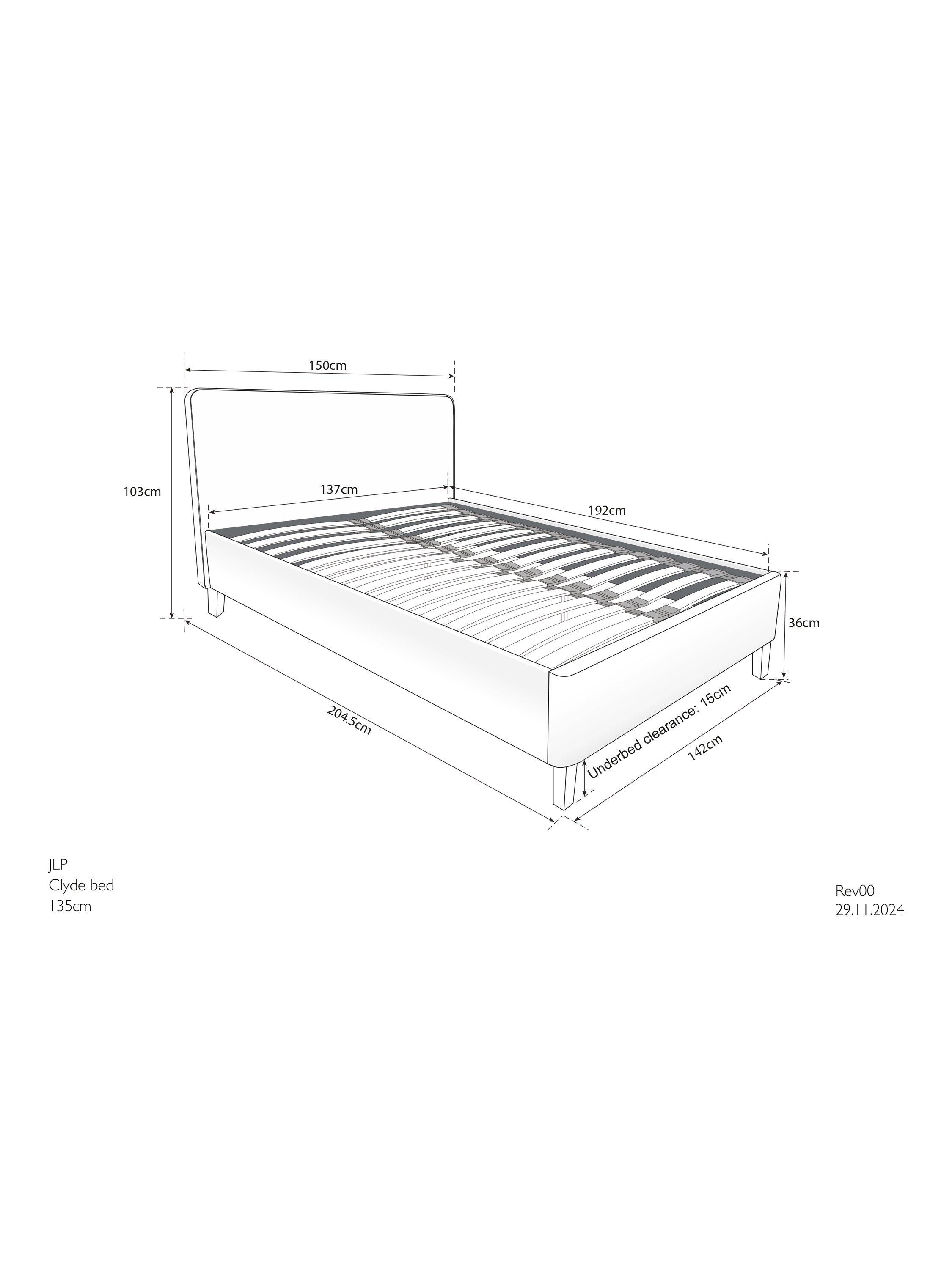 Beautifully simple, impressively well made and available at a price you'll love. Our modern Clyde bed frame has a gently curved shape, with a wide headboard and sturdy wooden legs. It's a design that will keep your bedroom feeling serene and calm. Sprung slats in the base ensure the perfect support for a great night's sleep.