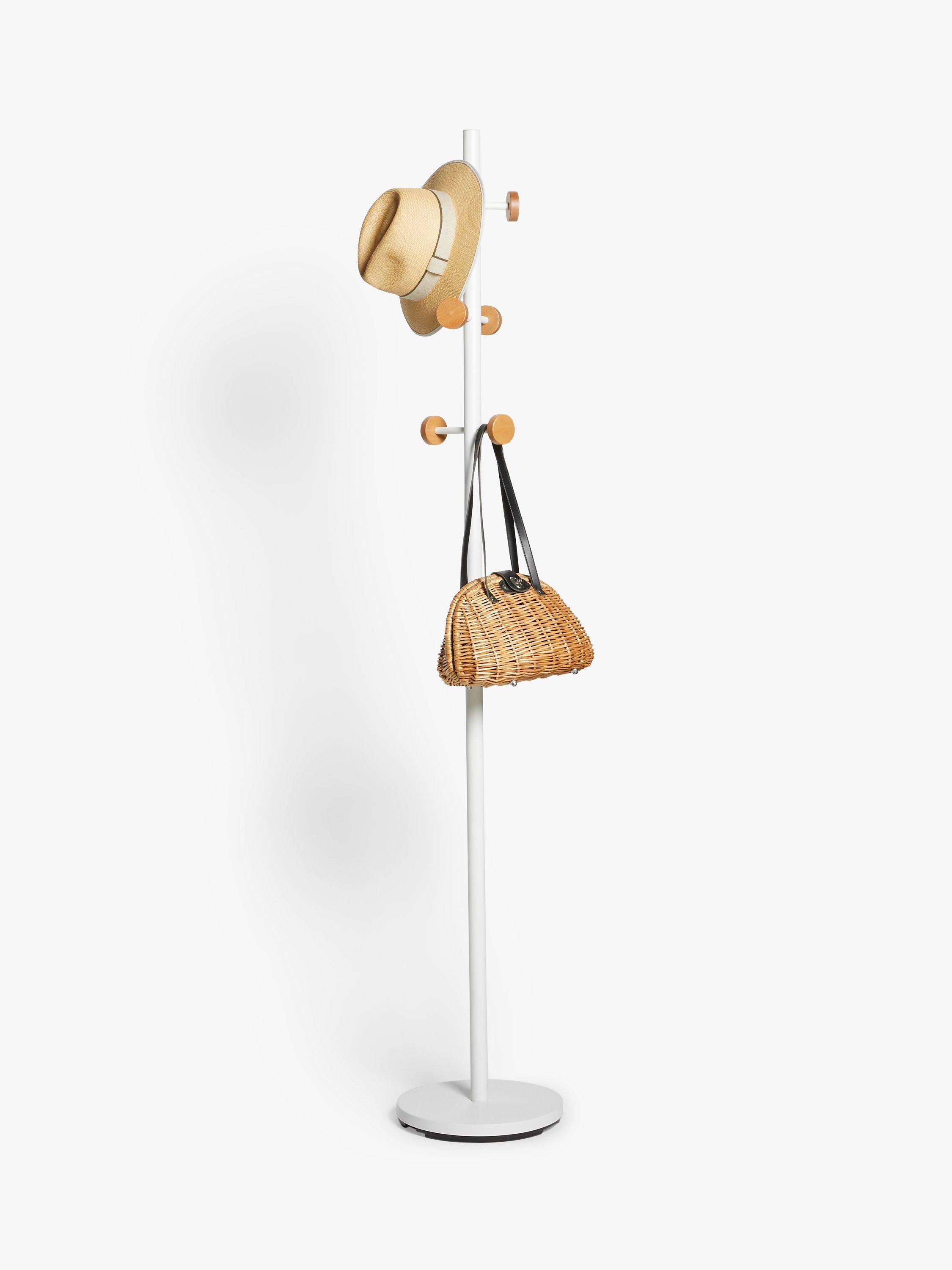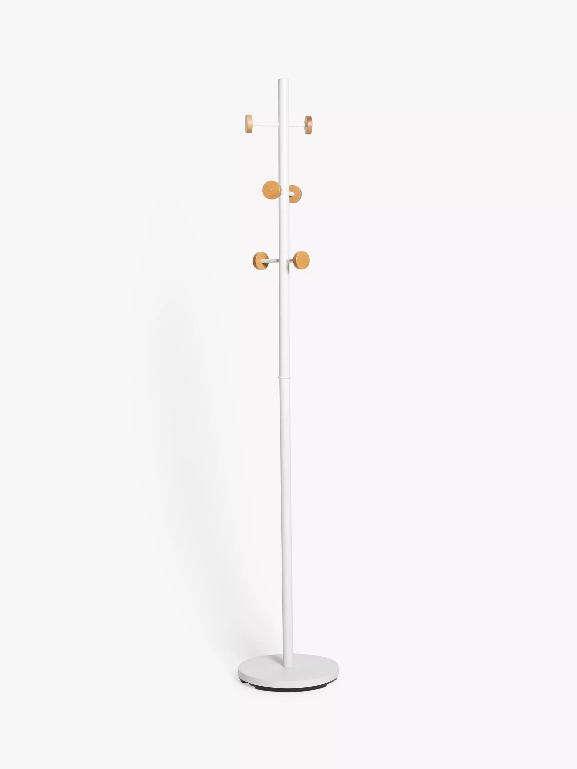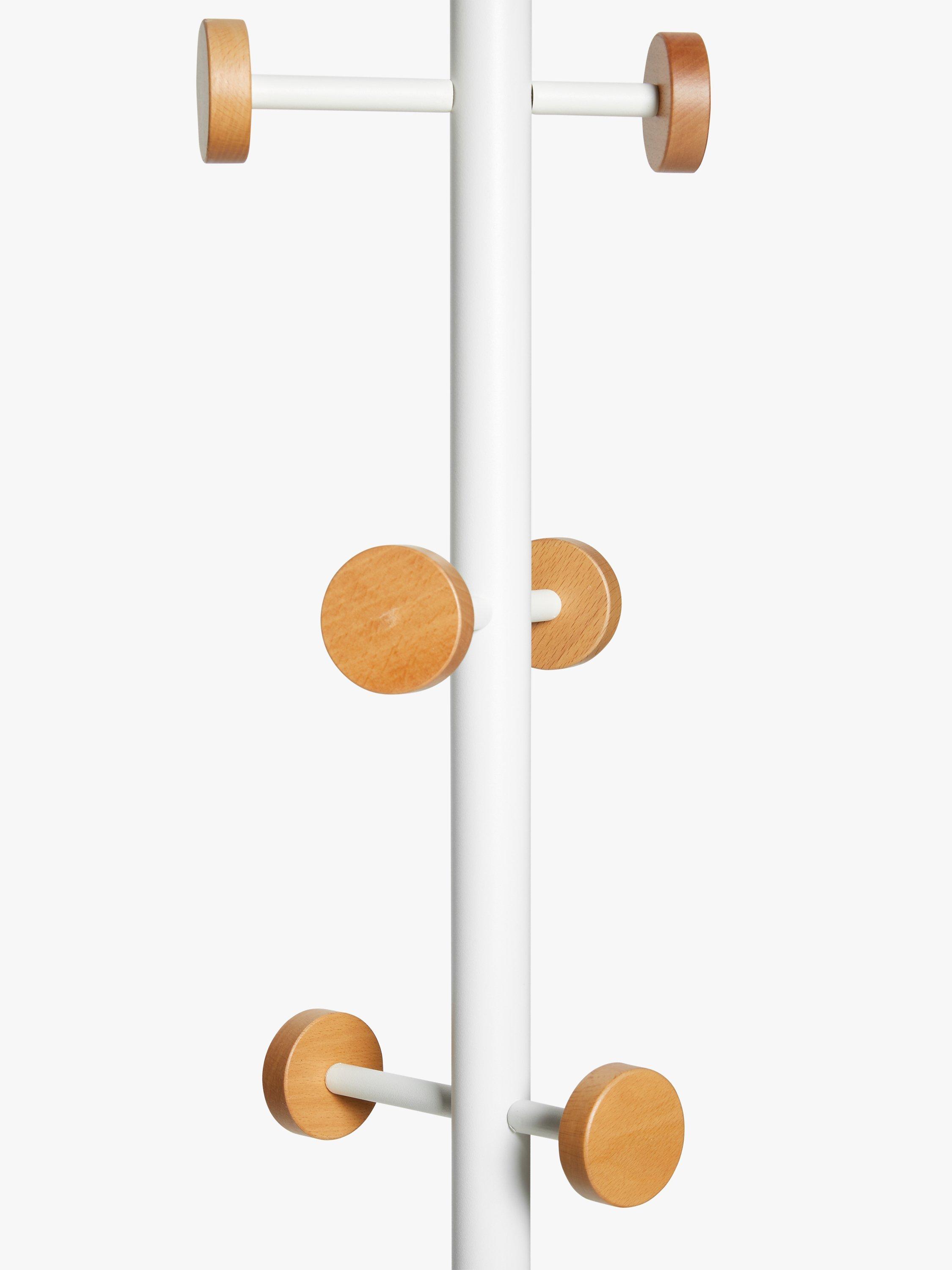 This modern coat stand looks great in a home office or airy hallway and comes with 6 wood disc-ended hooks for hanging coats, handbags and other accessories.