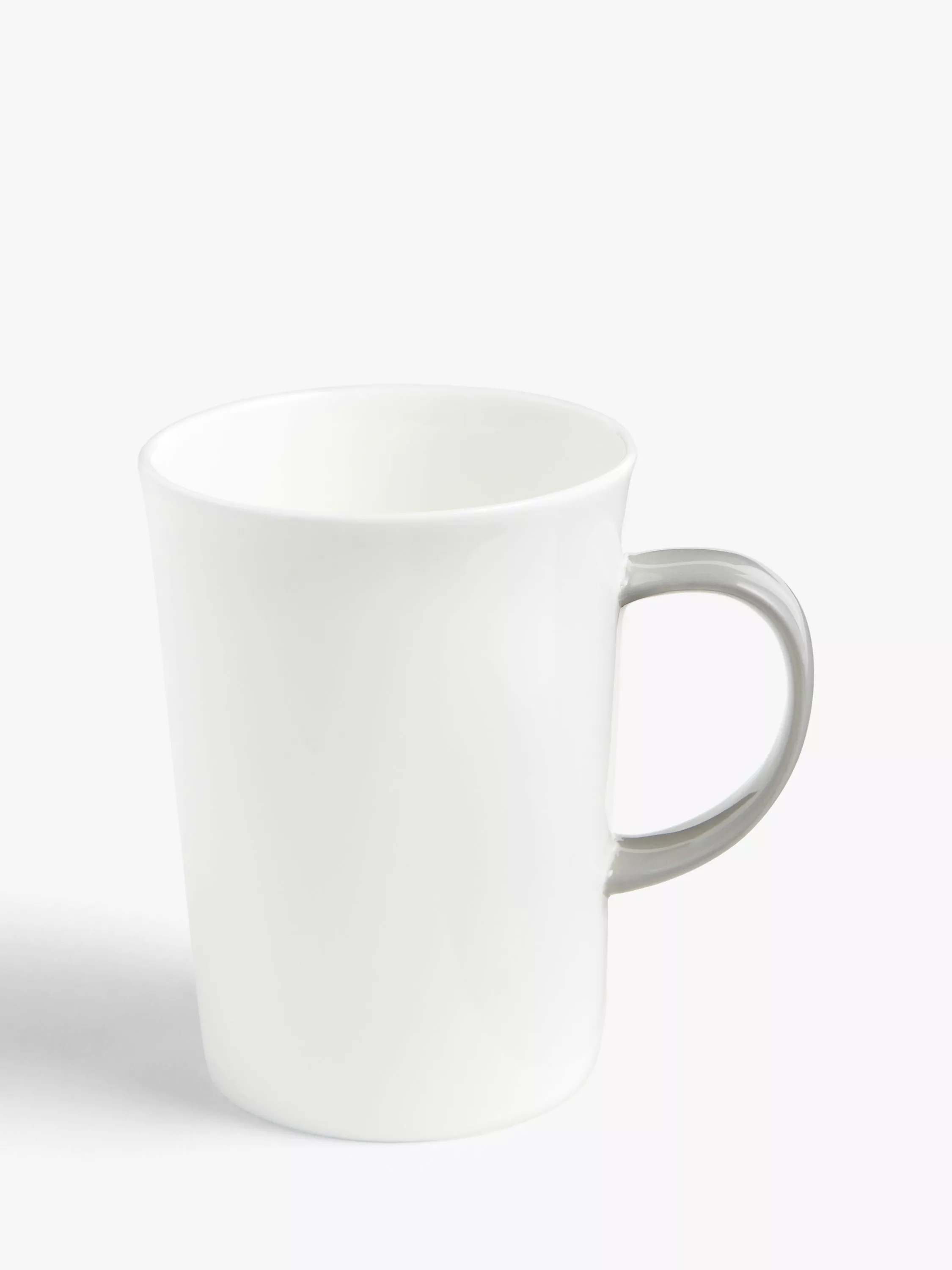 A tall bone china mug with a colourful handle. The mug is dishwasher and microwave safe for easy everyday use.