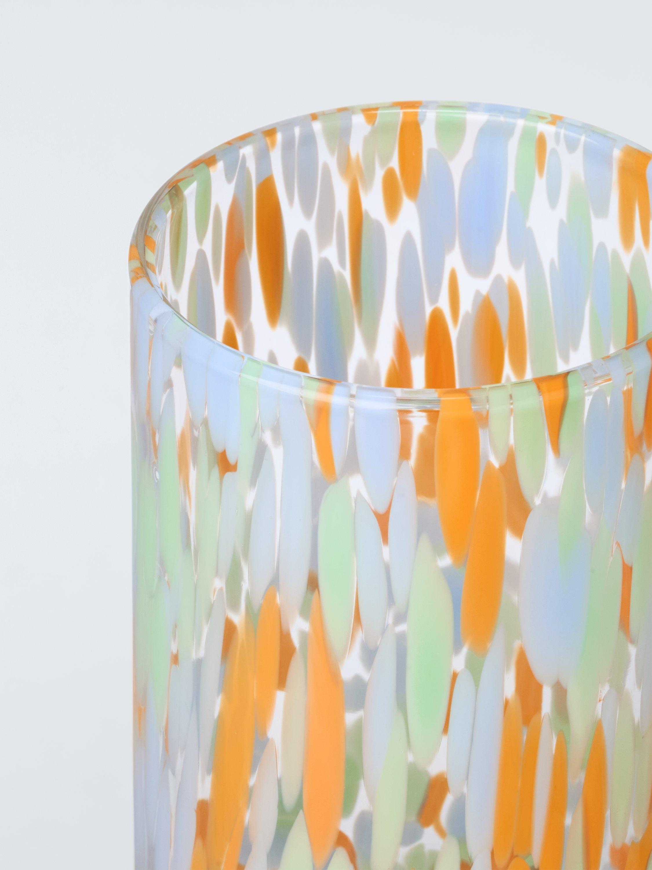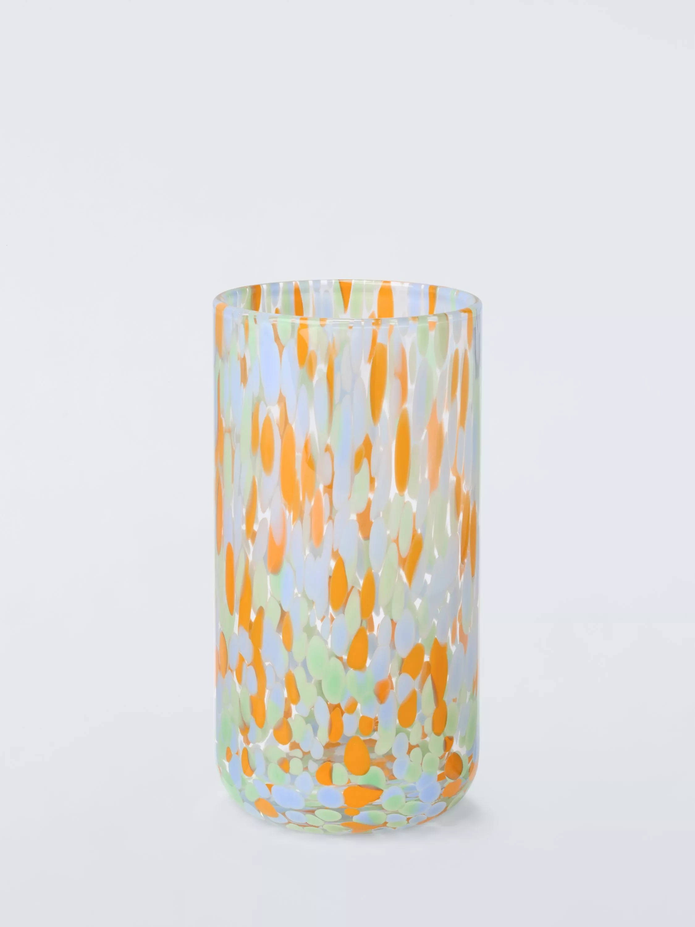 Highball glass with a decorative confetti-style pattern. Handmade with a technique that creates subtle variations from piece to piece, making each item unique.
