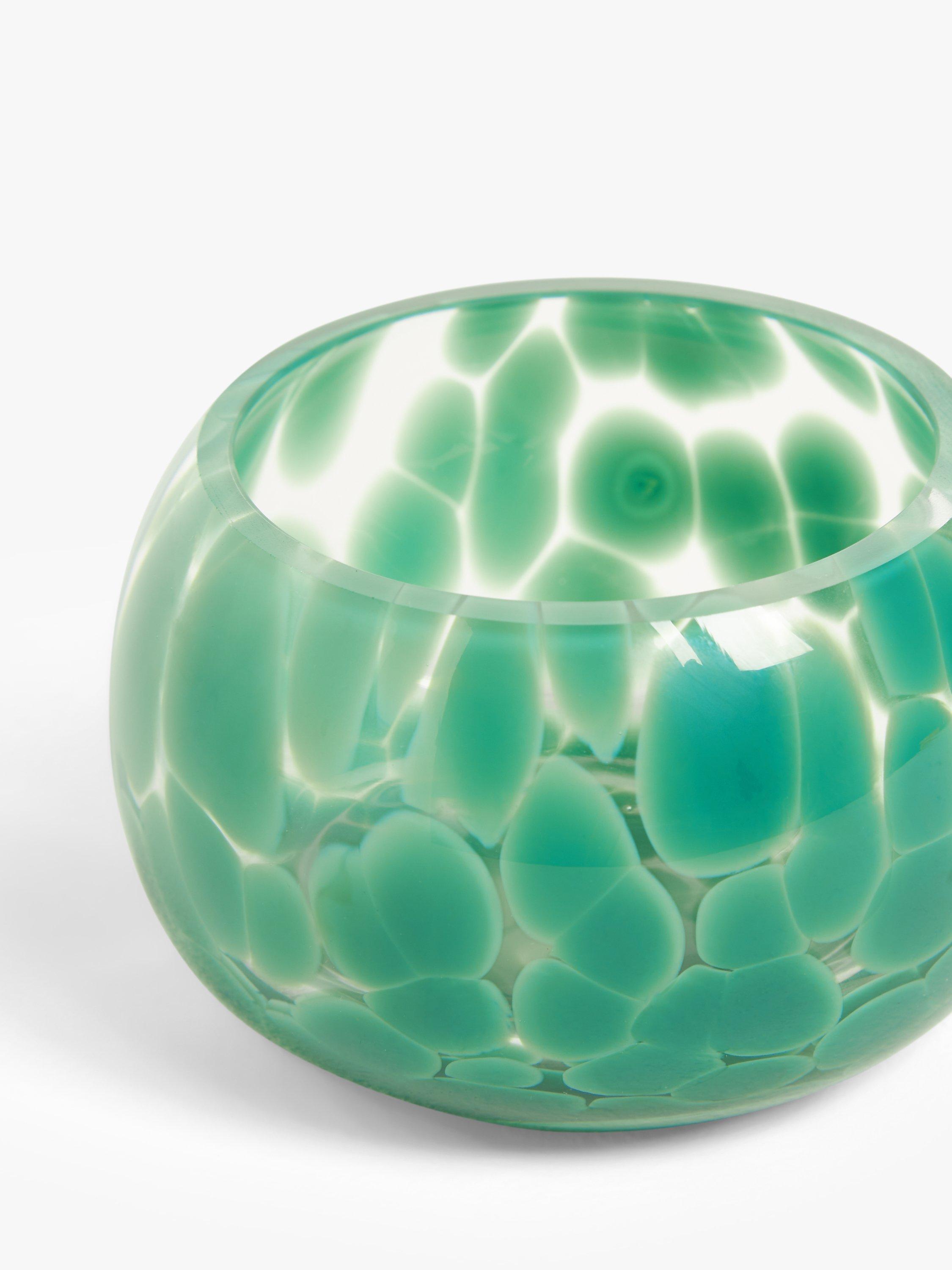 A contemporary glass tealight holder in an abstract, confetti style.