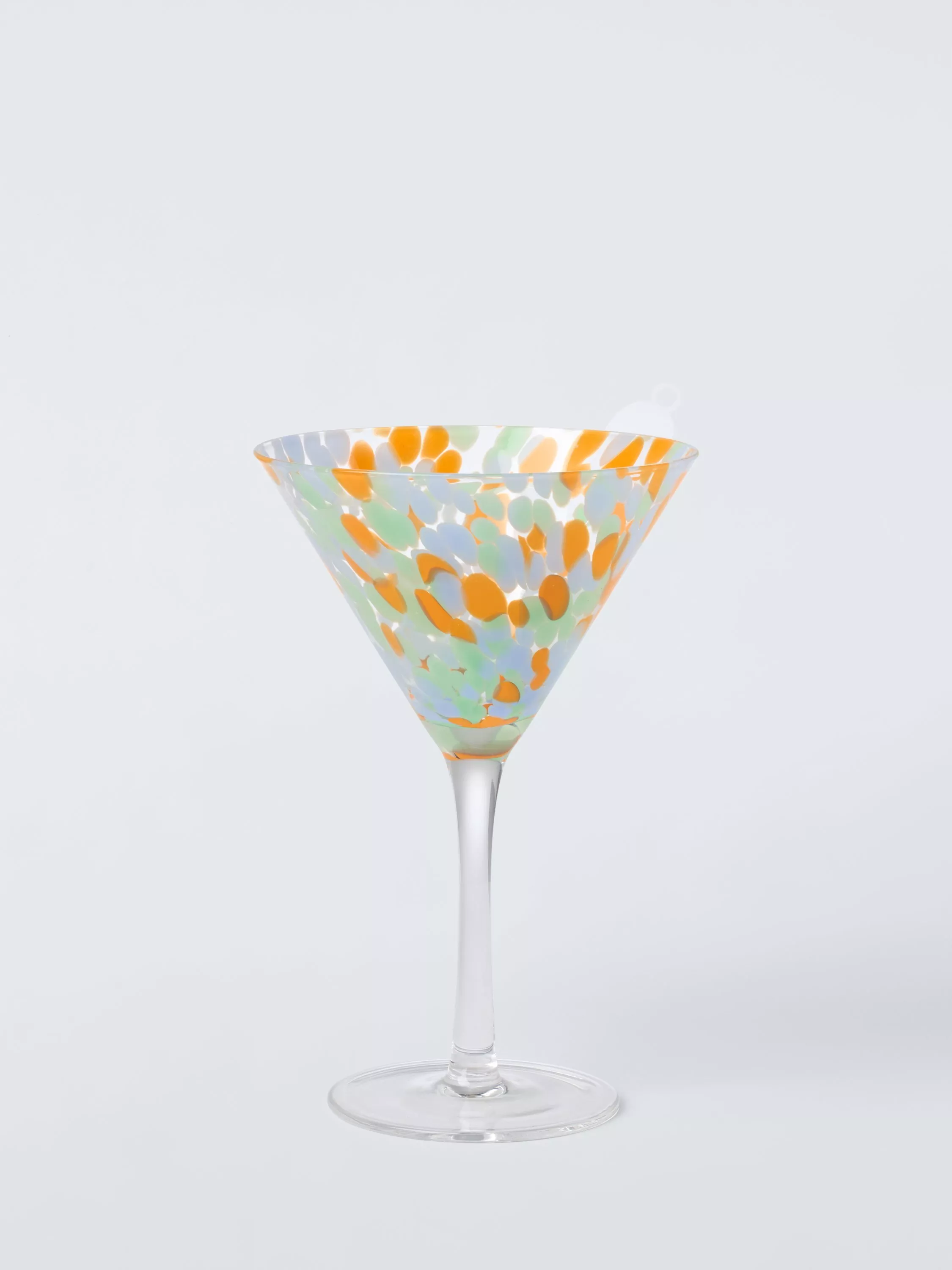 Stemmed Martini cocktail glass. The decorative confetti-style pattern is handmade with a technique that creates subtle variations from piece to piece, making each item unique.