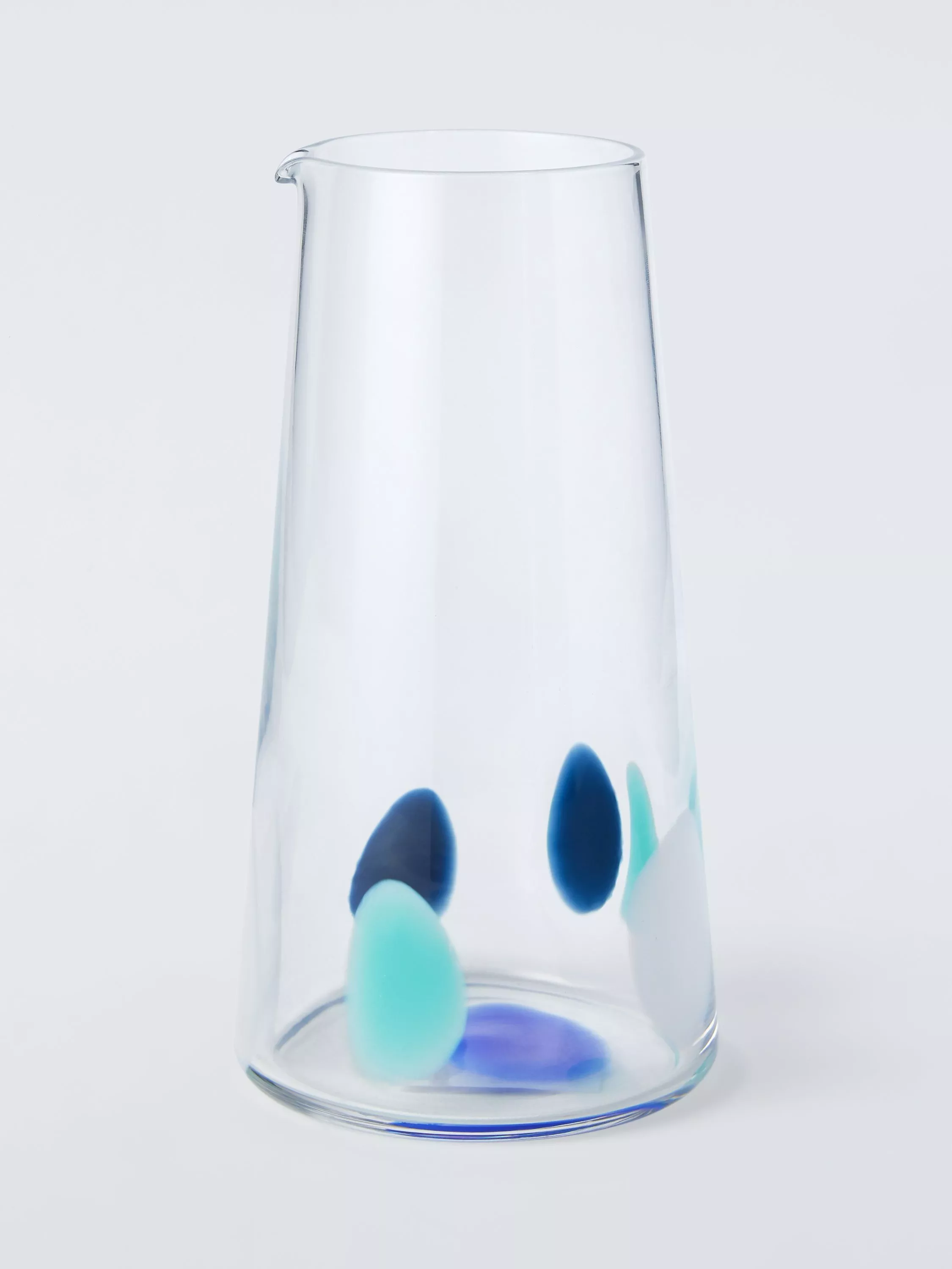 Carafe with a decorative confetti-style design on the glass. The pattern is handmade with a technique that creates subtle variations from piece to piece, making each item unique.