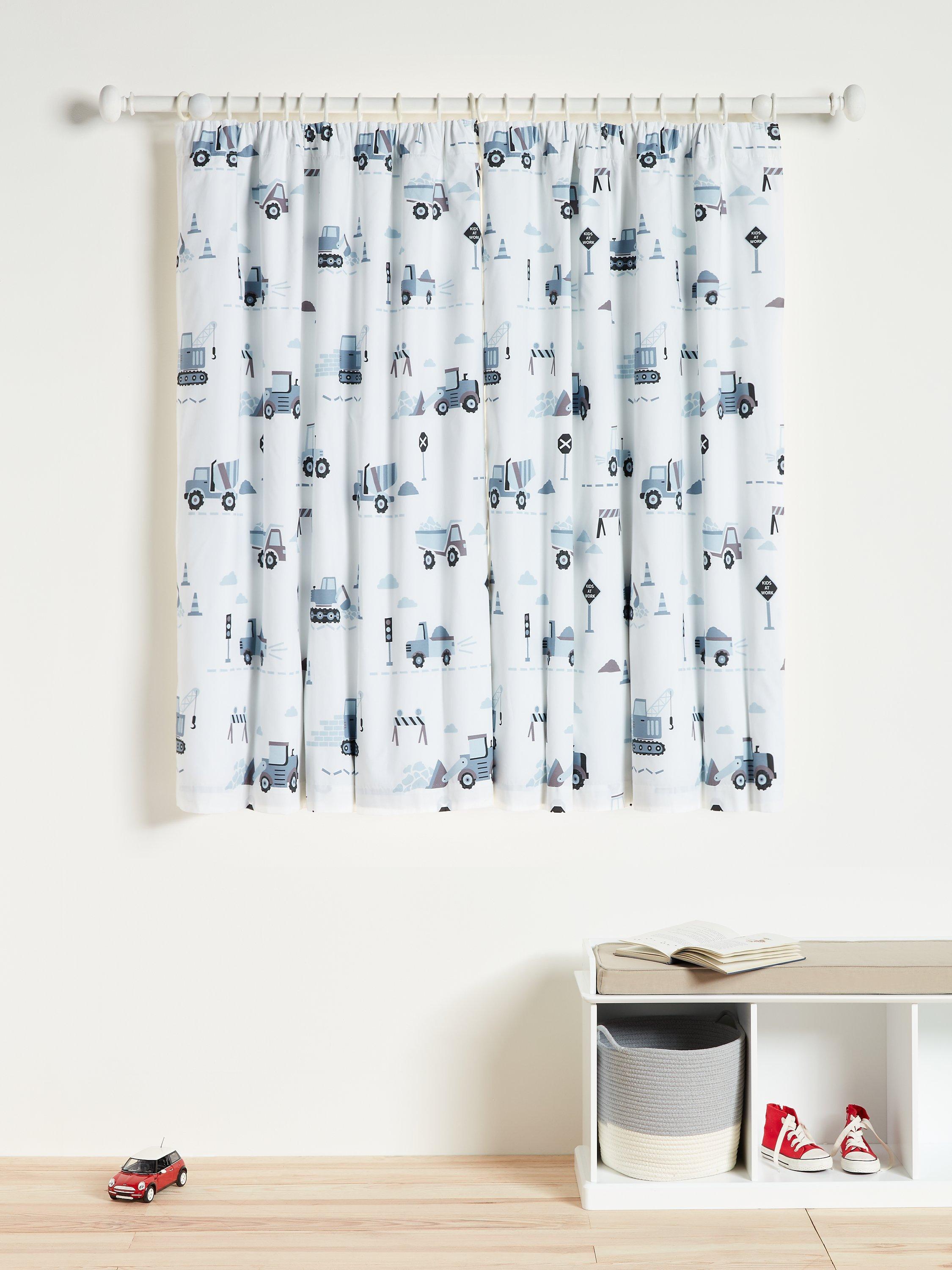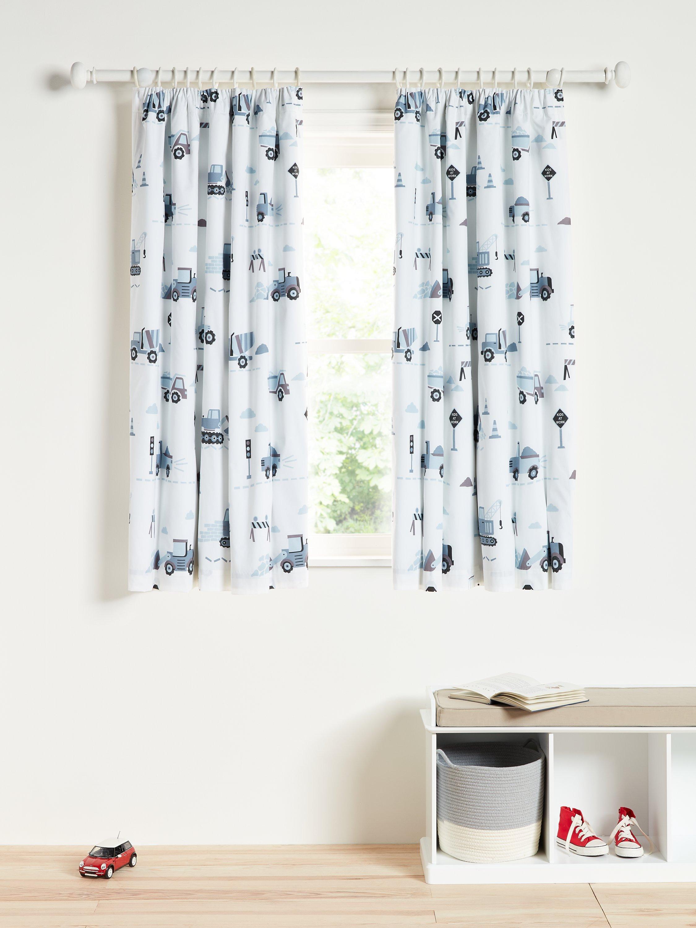 Made from pure cotton with an effective blackout coating, this pair of children's curtains are designed with a busy construction scene print in warm shades of blues. The blackout coating helps to block out distracting sun beams or street lights and the pencil pleat design gives them a smart appearance when hung. The width dimension refers to the width of each individual curtain in the pair.