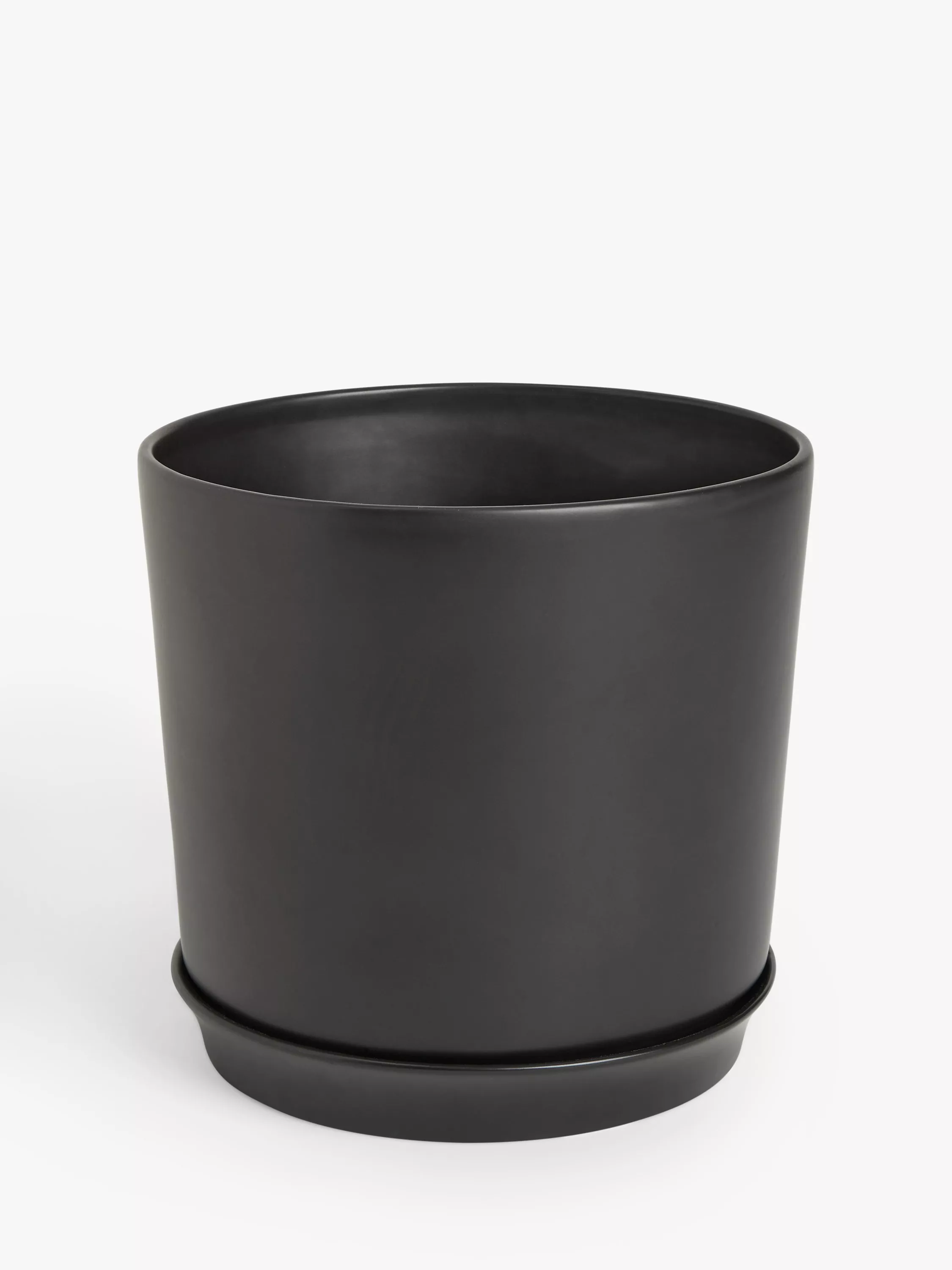 Glazed stoneware plant pot with a drainage hole and matching saucer, making it suitable for both indoor and outdoor use.