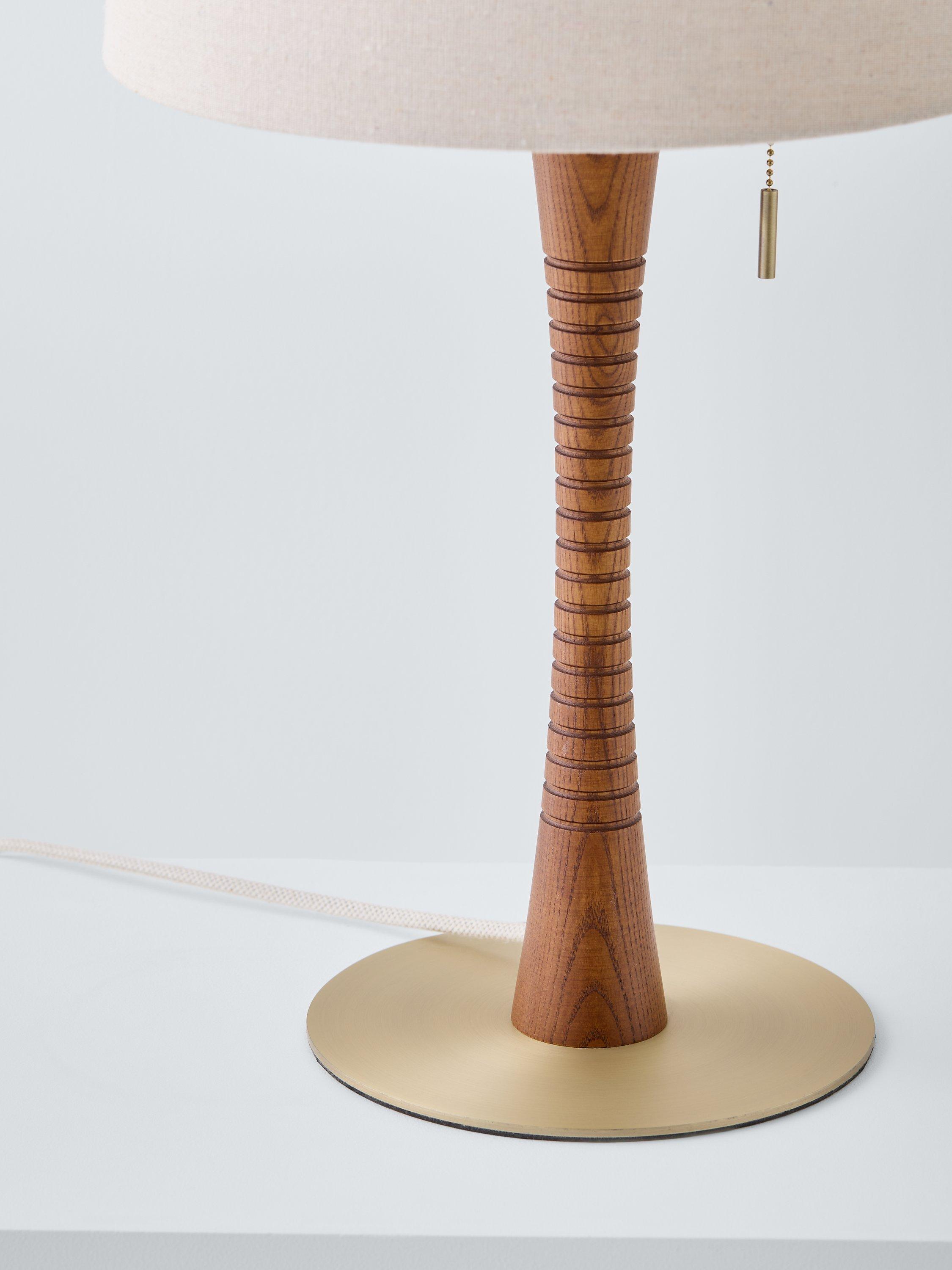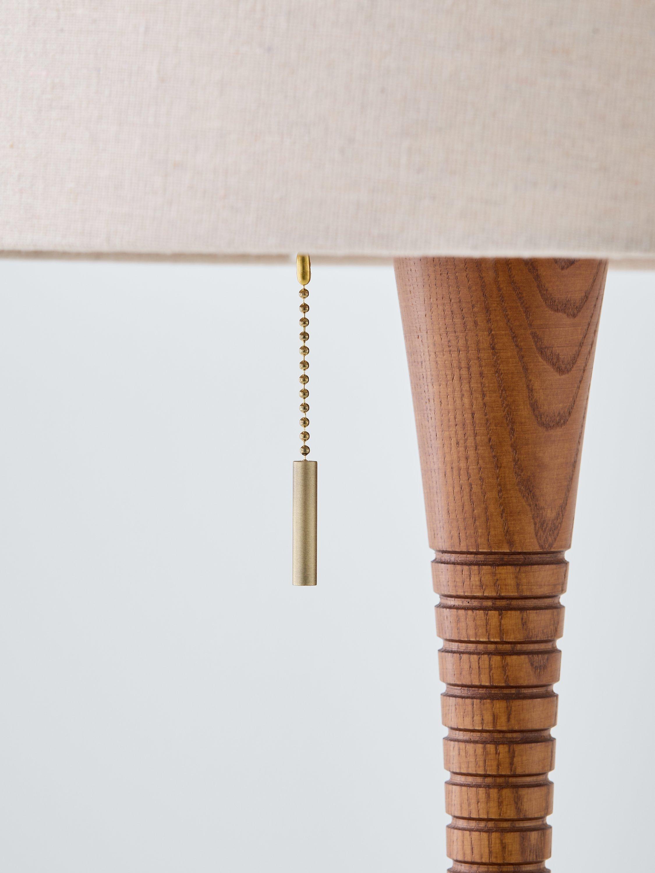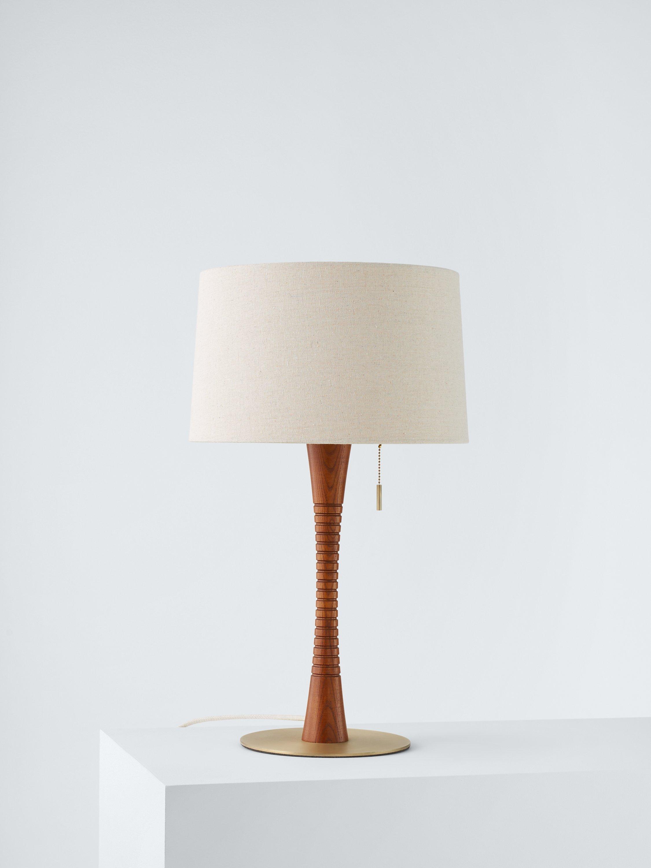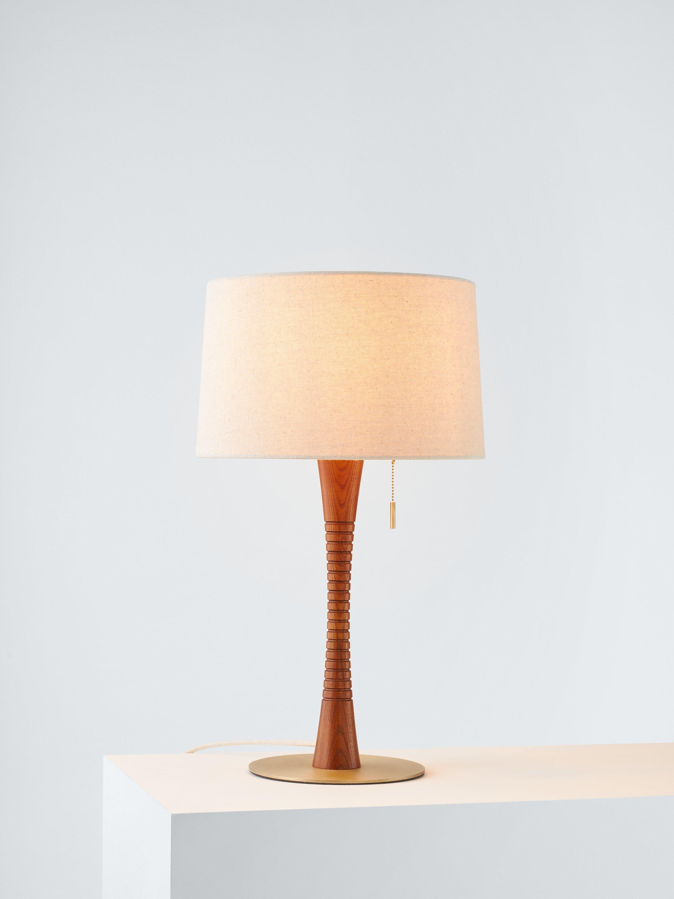 The Contour table lamp looks fabulous with its mid-century styling and intricate detailed rib stem. Finished in matte antique brass with a walnut stain and an oatmeal linen shade, the Contour makes it easy to add a luxurious feel to any room in the home.