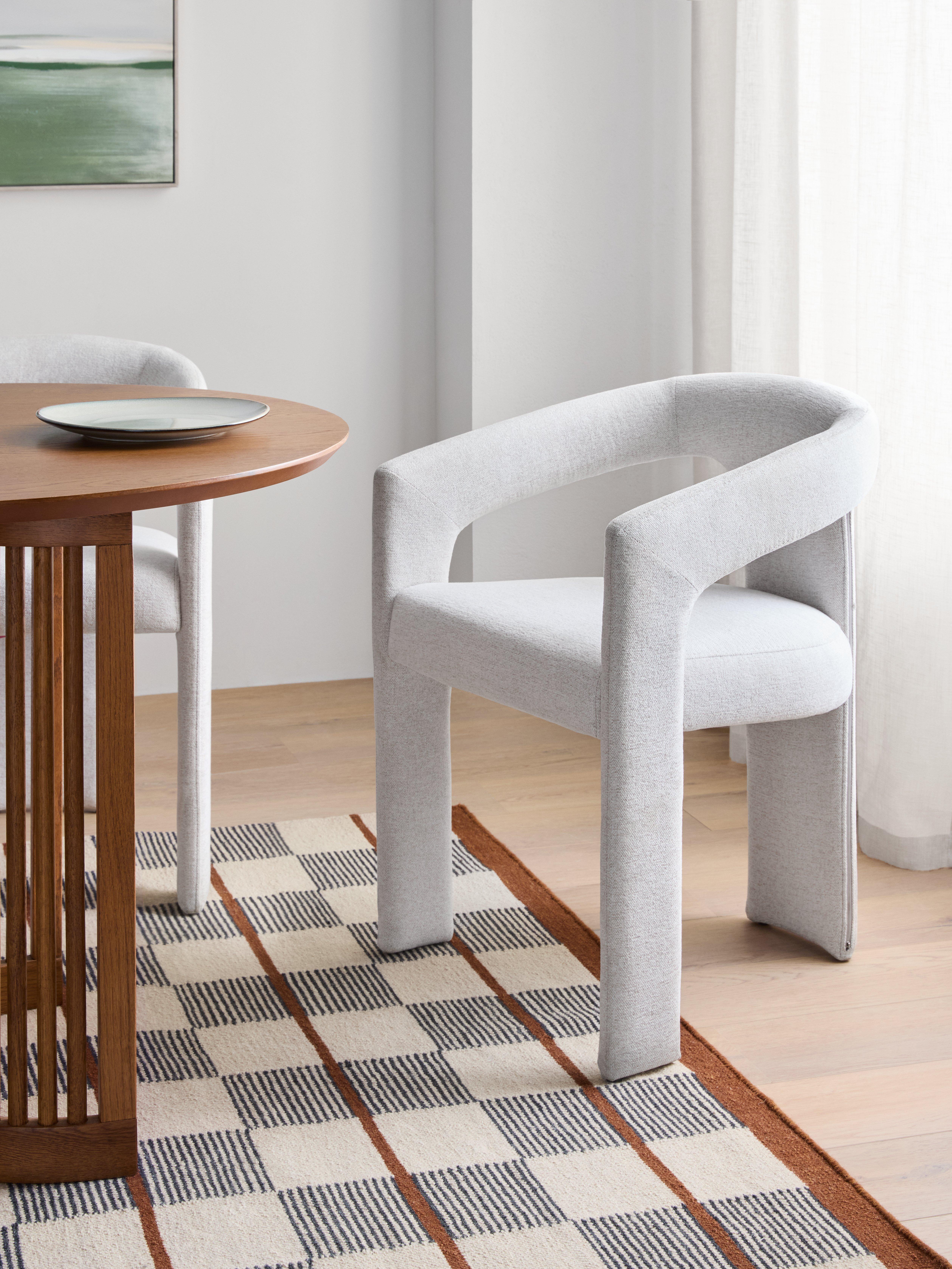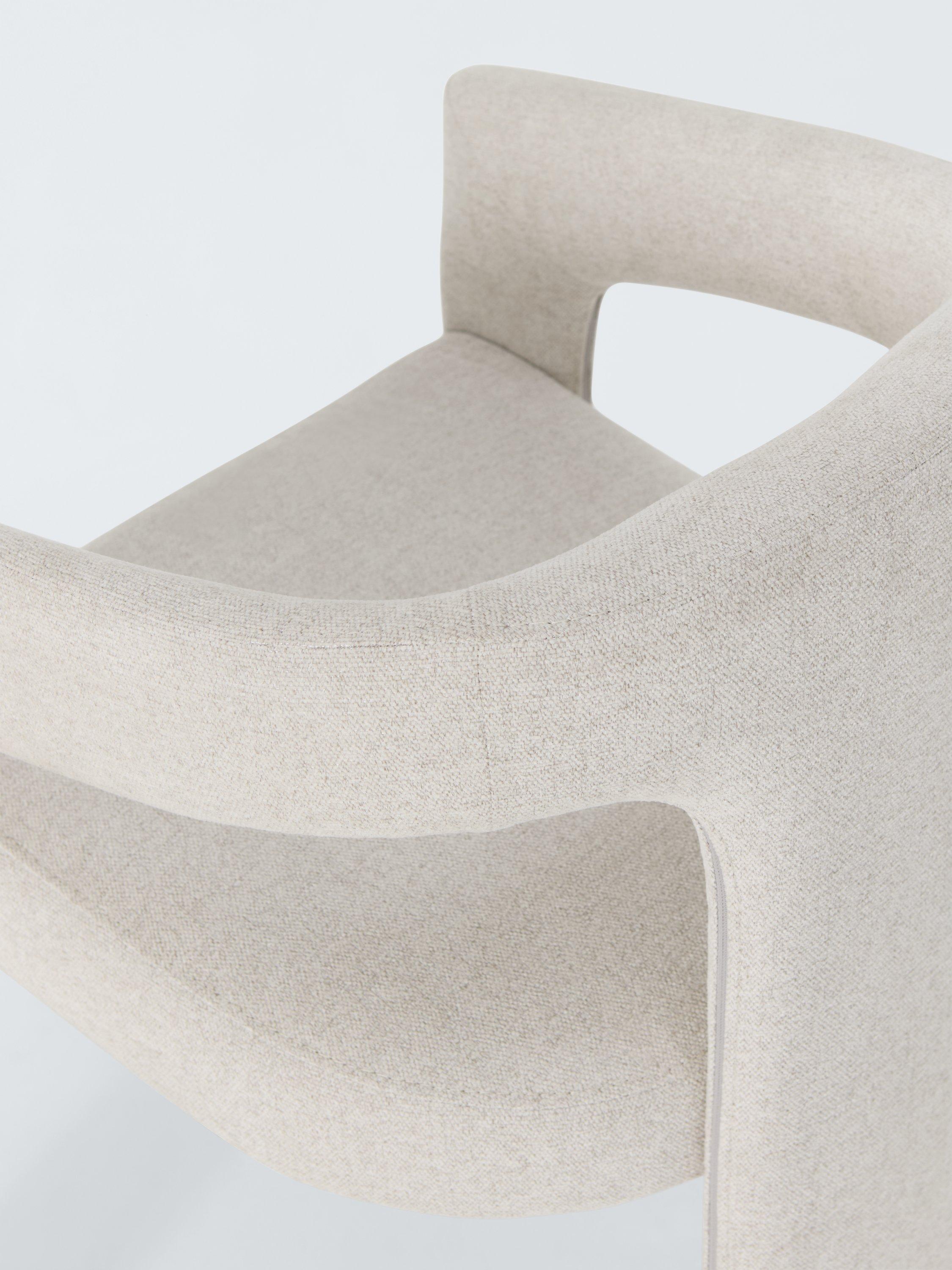 This elegant chair features a soft natural fabric upholstery that enhances its timeless design. With a gently curved backrest and sturdy construction, it offers both style and comfort. The minimalist silhouette makes it a versatile choice - perfect for dining areas, offices, or lounges seeking a sophisticated yet functional seating option.