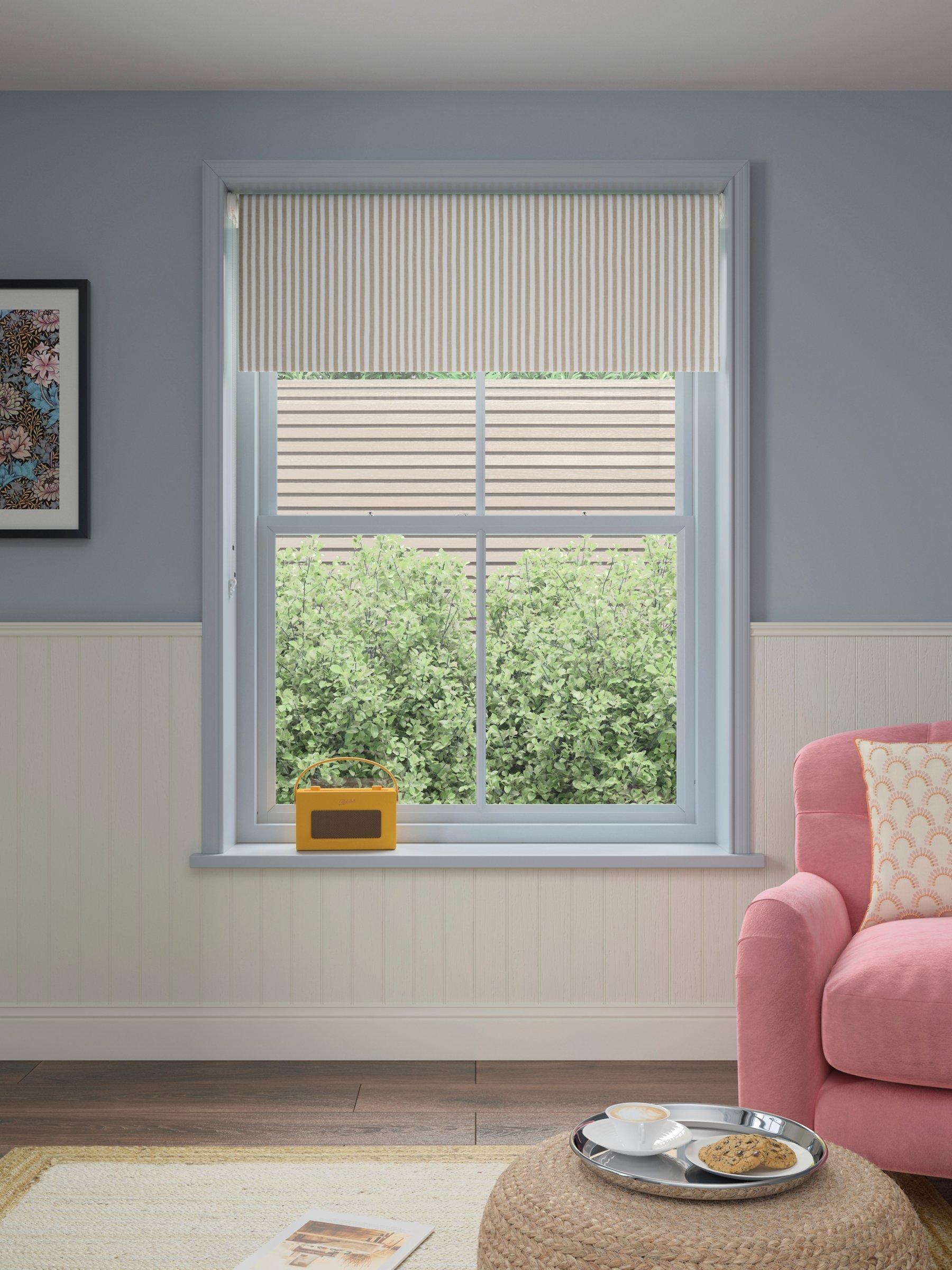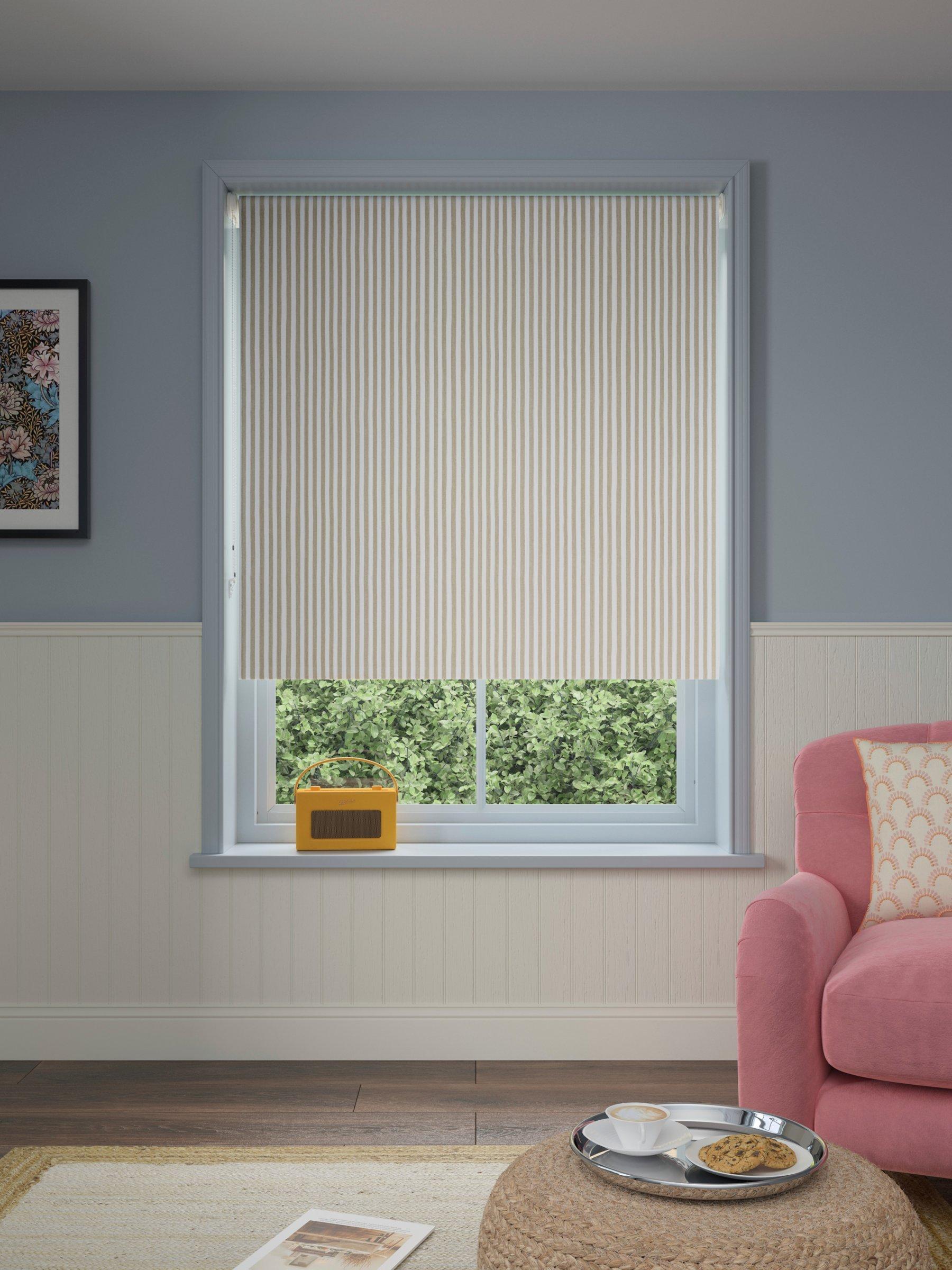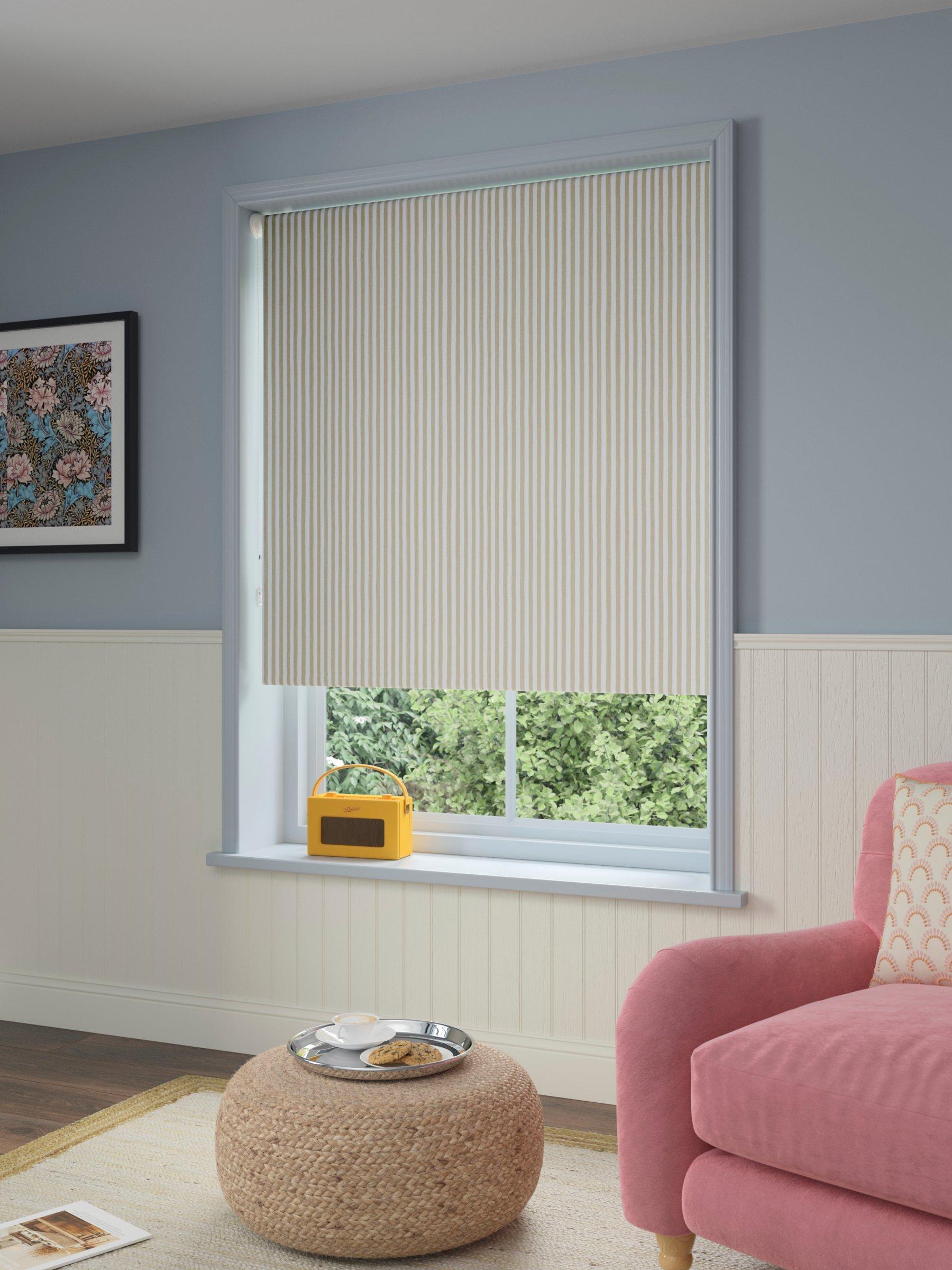 Our roller blind showcases a classic stripe. It has a blackout coating to block out the light, helping you sleep for longer.