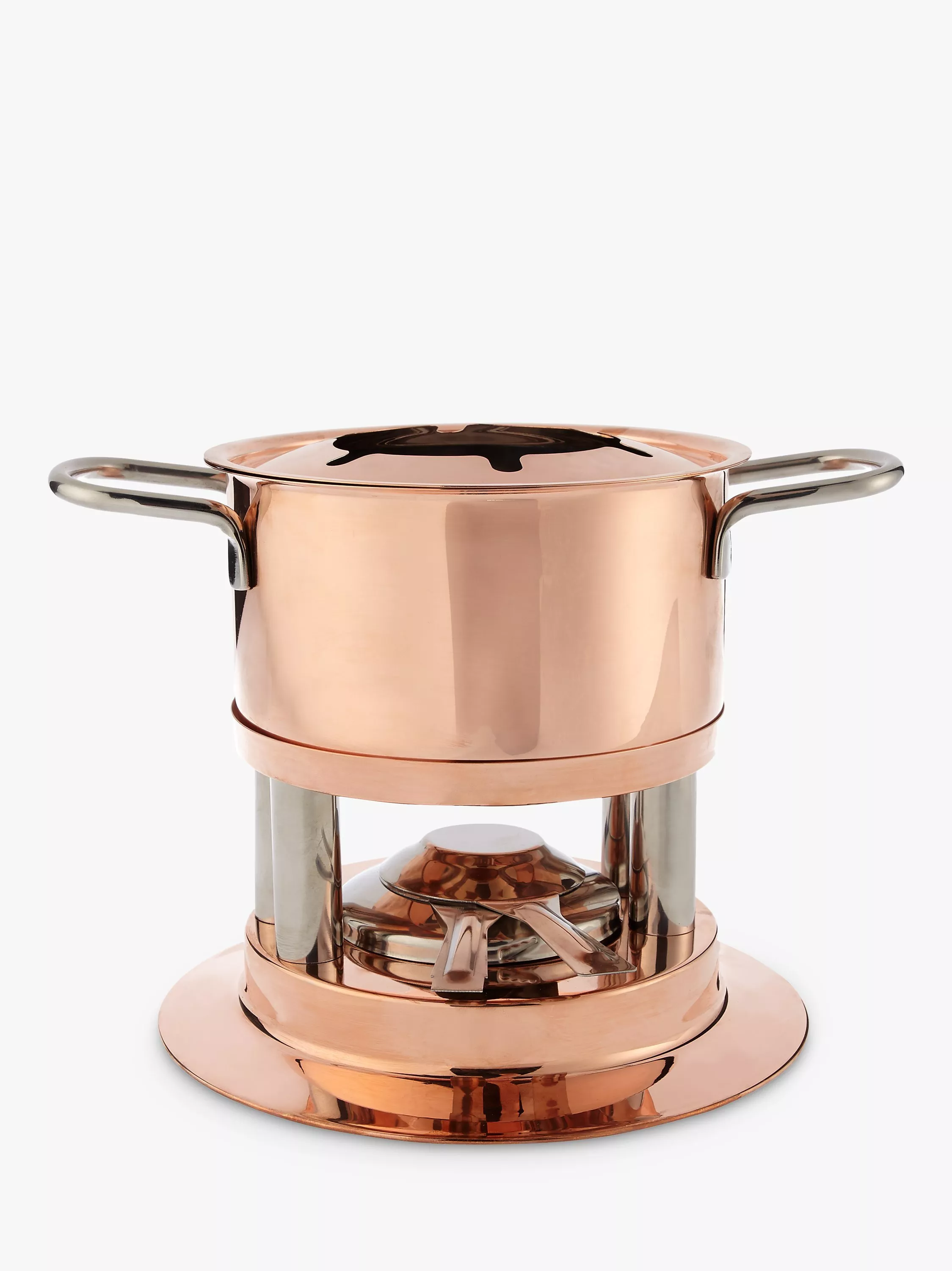 A beautiful copper fondue set, perfect for warming, shareable meals with friends and family. This ten-piece set includes: a copper-plated stainless steel cover, a copper-plated stainless steel cylinder and stand/base, a burner and six serving forks with chrome-plated plastic heads.