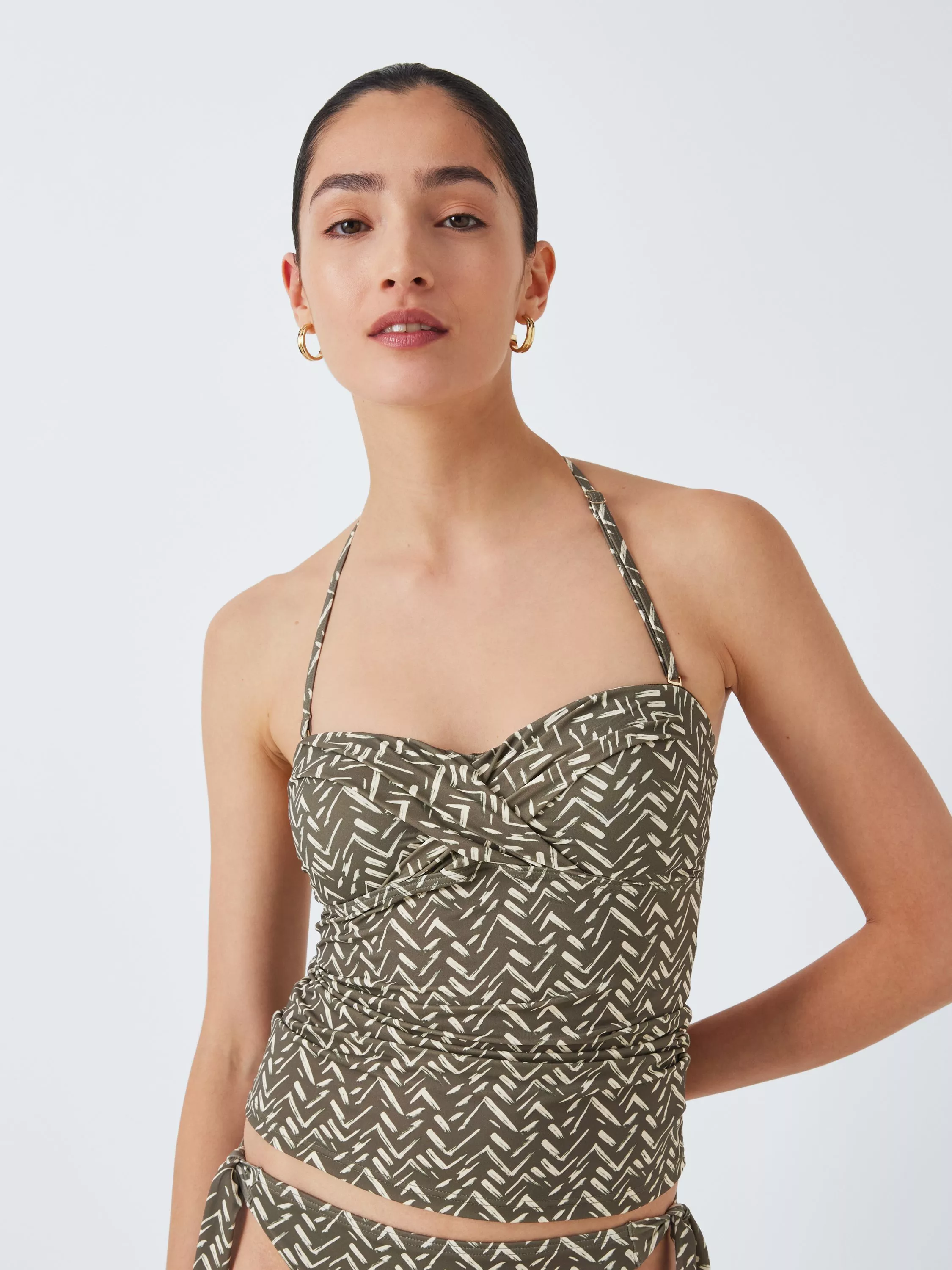A fully lined tankini top with a detachable strap so you can switch between a halterneck and strapless style. Crossed fabric at the centre front creates shaping around the bust and ruching across the tummy gives a cinched-in effect.