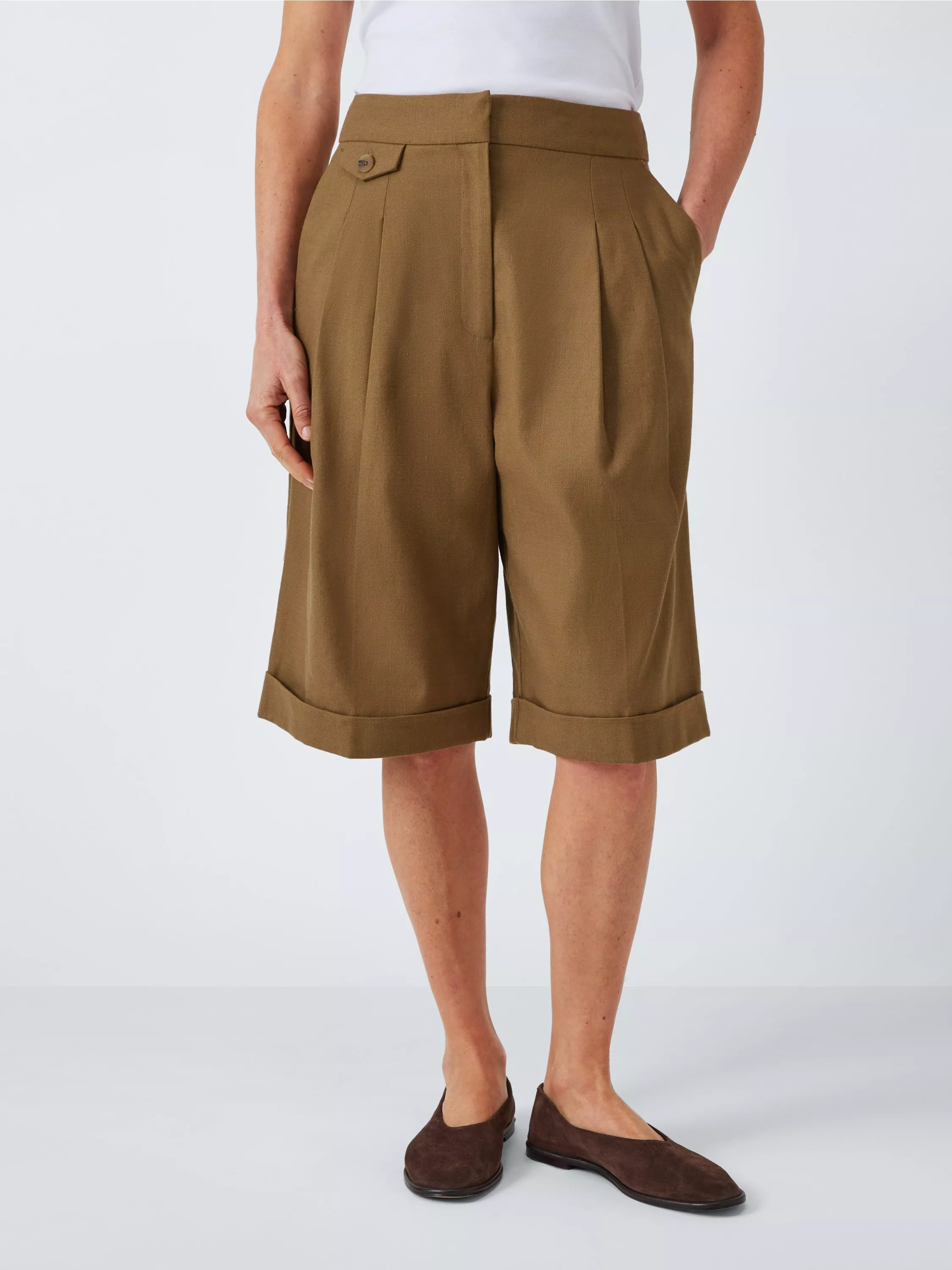 Bermuda shorts woven from a lightweight and breathable cotton and linen blend for warmer months. Styled with a pleat detail, turn-up hems, a back welt pocket, side pockets and faux tortoiseshell buttons. Fastens with a clasp and zip fly. Team with the matching jacket and waistcoat.