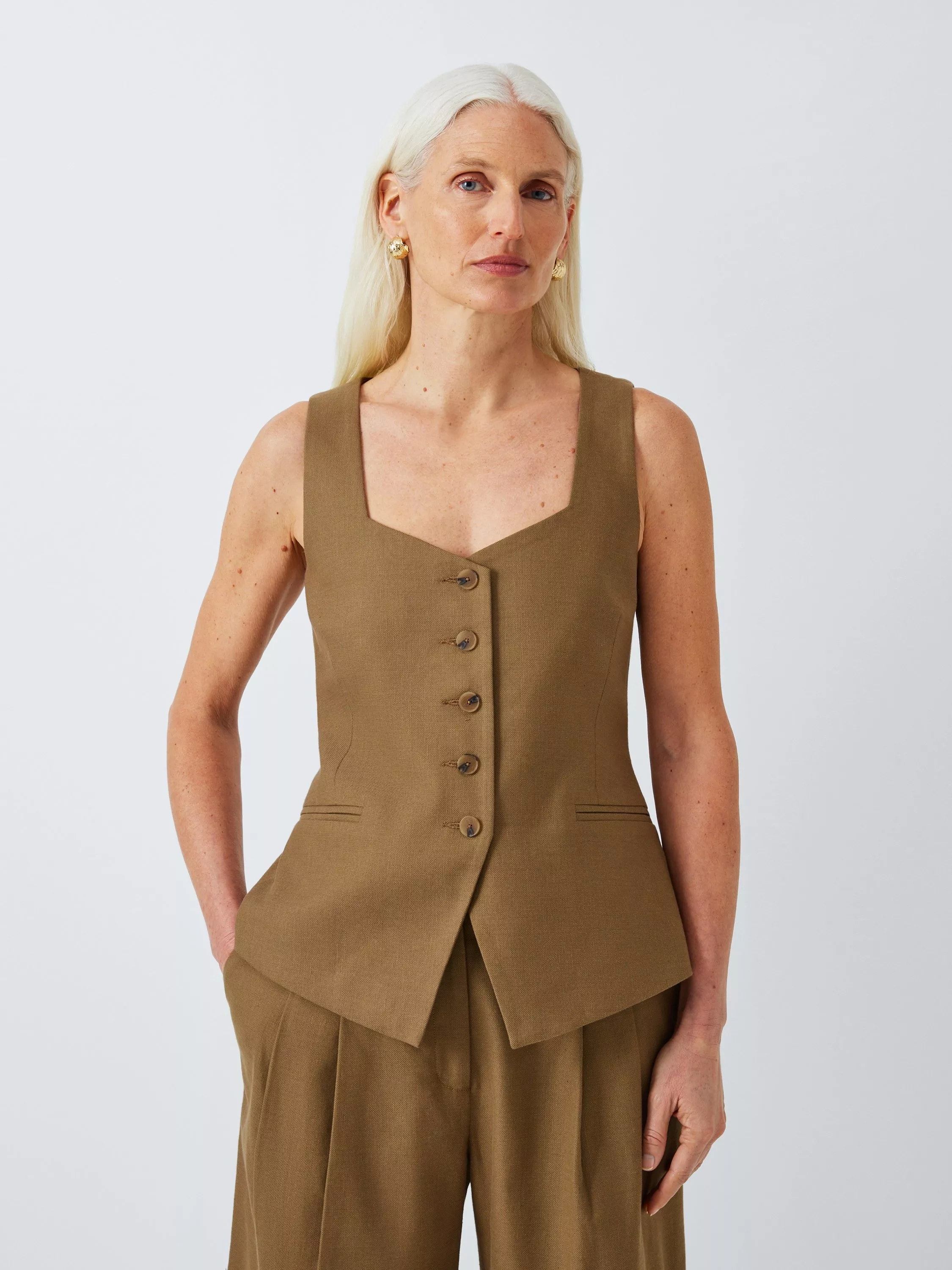 Suit waistcoat woven from a lightweight and breathable cotton and linen blend for warmer months. Styled with a square neckline, welt pockets and five faux tortoiseshell buttons down the front, and lined for comfort. Team with the matching jacket and Bermuda shorts.