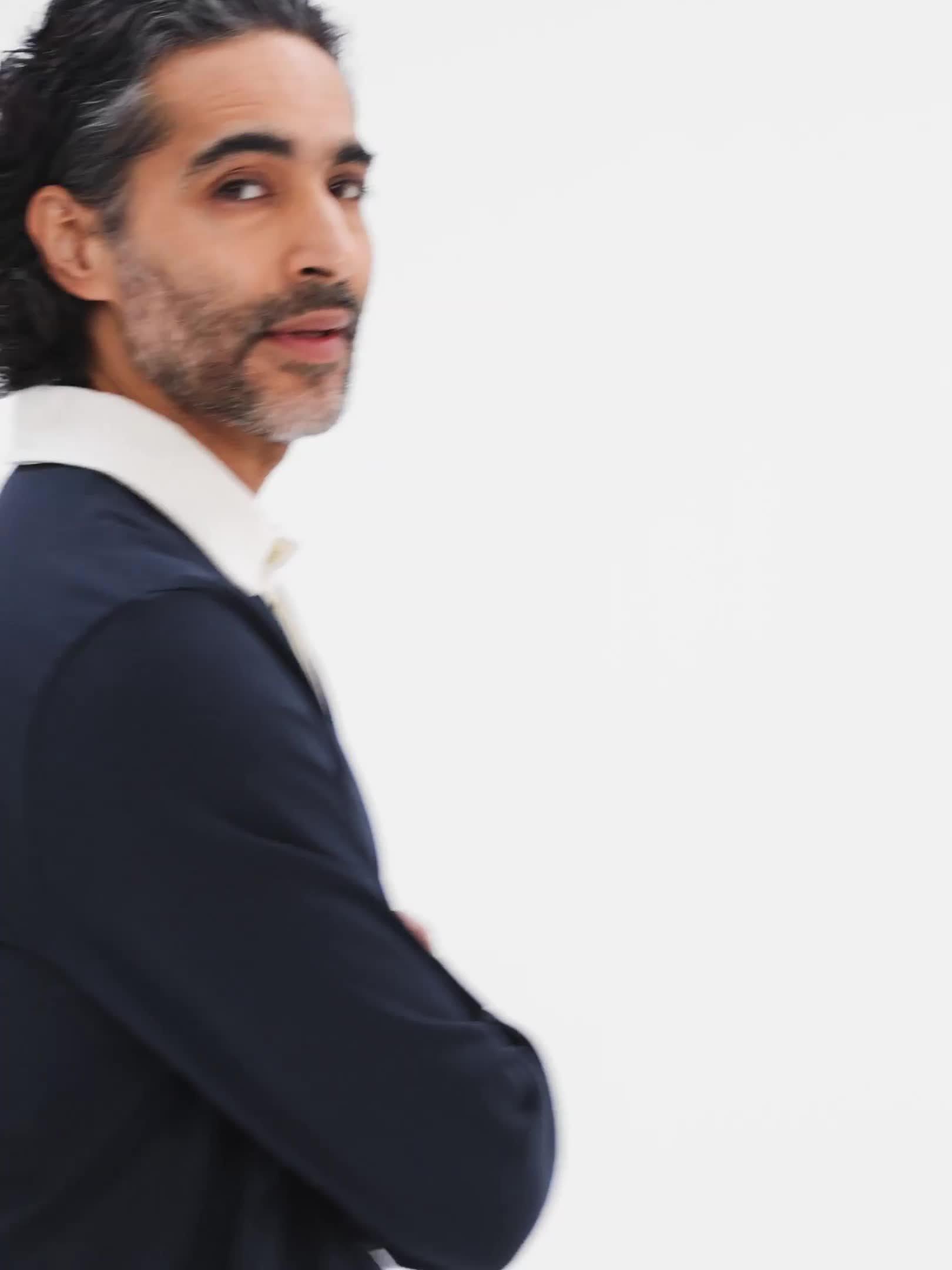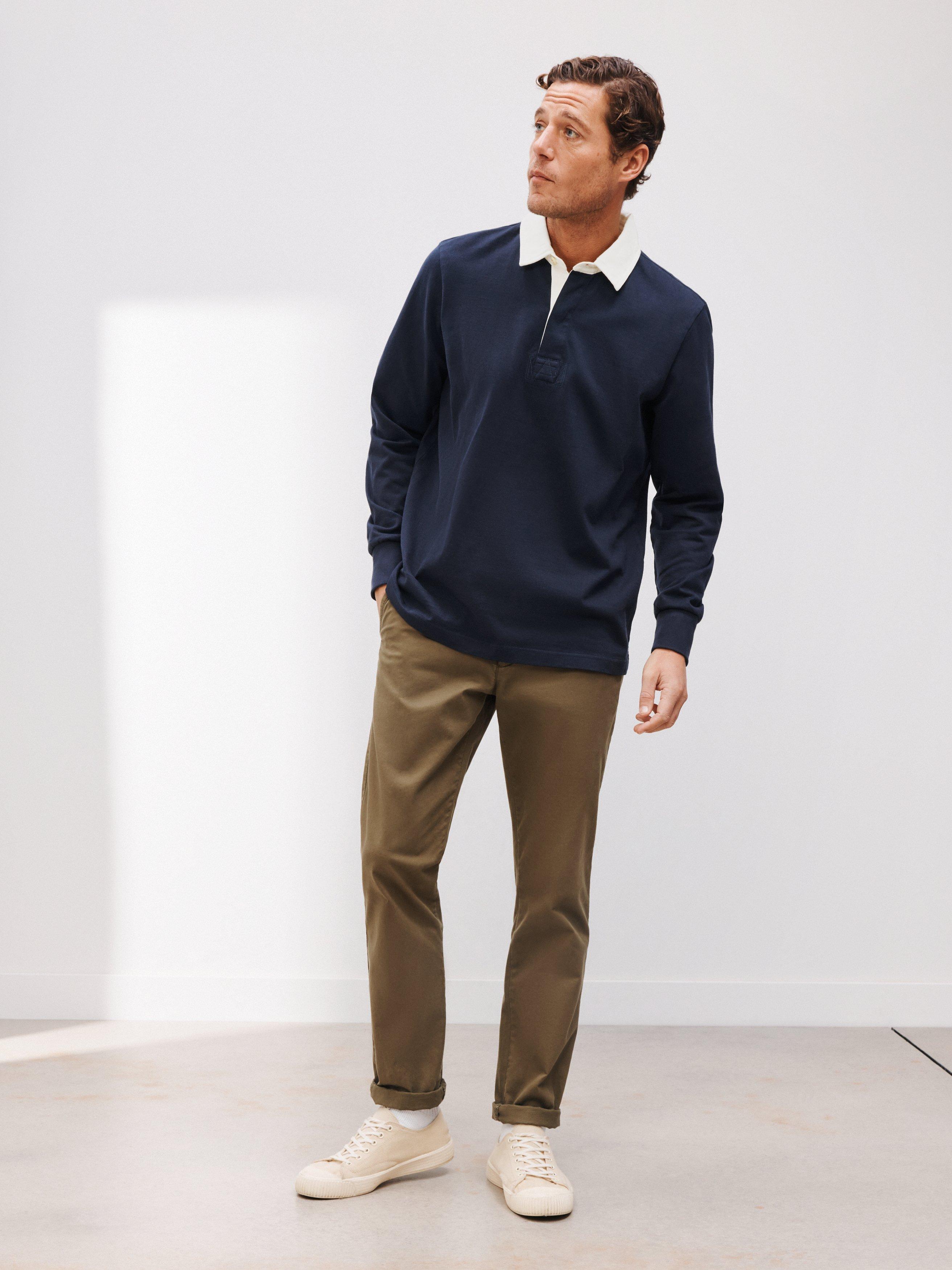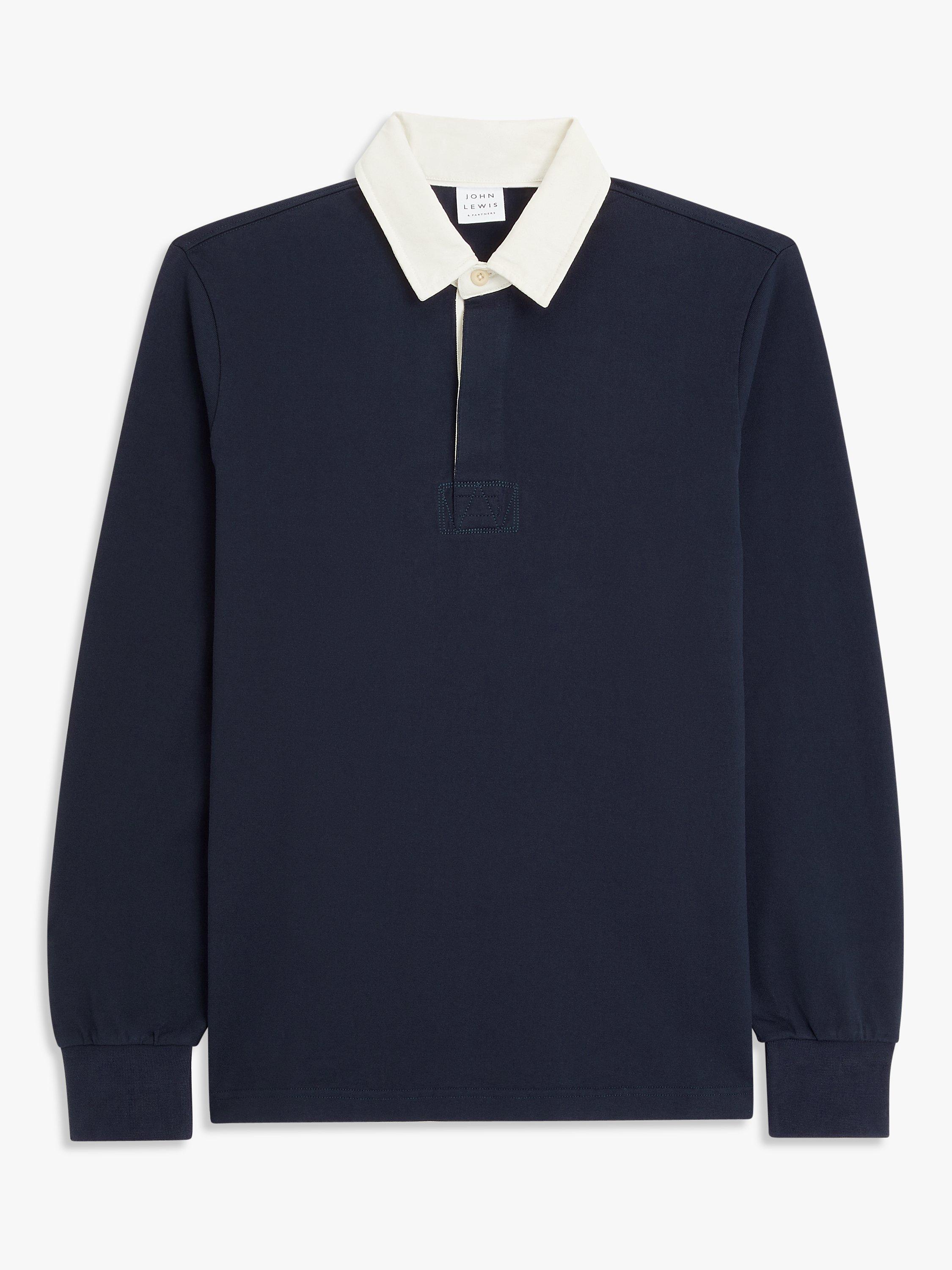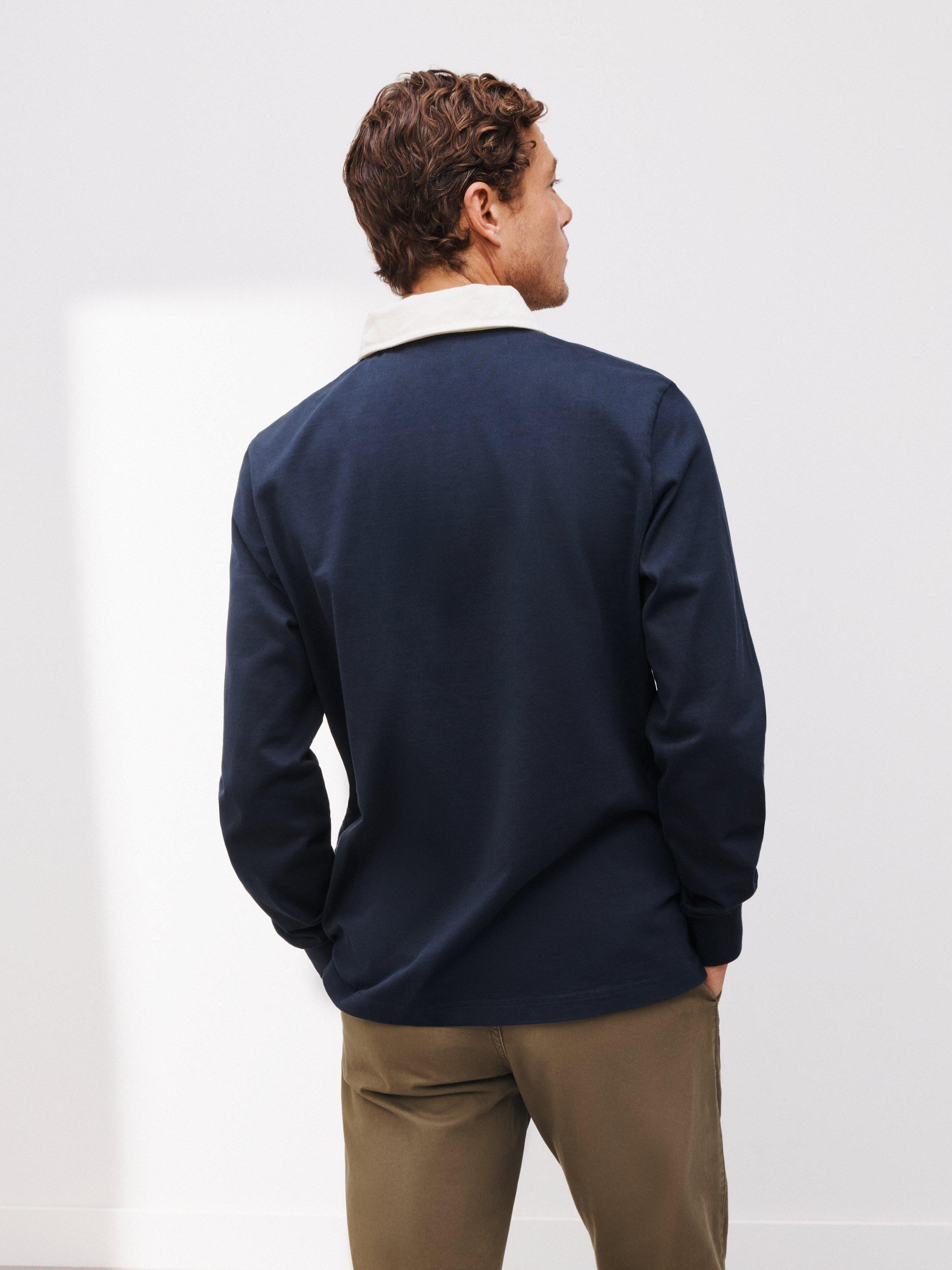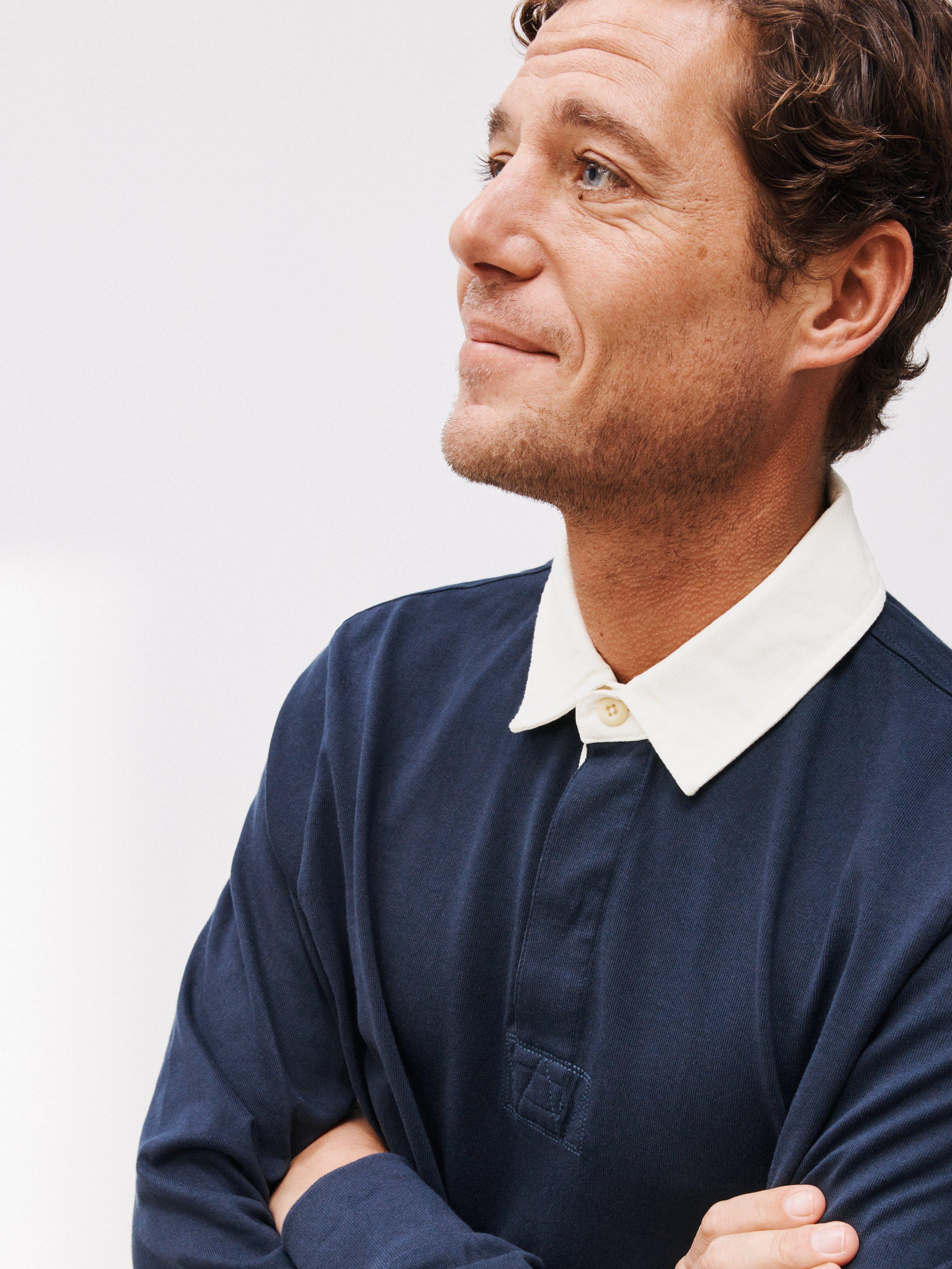 The ecru-coloured collar fastens with natural corozo nut buttons and contrasts the navy jersey base of the shirt in its colour as well as being a slightly different fabric.