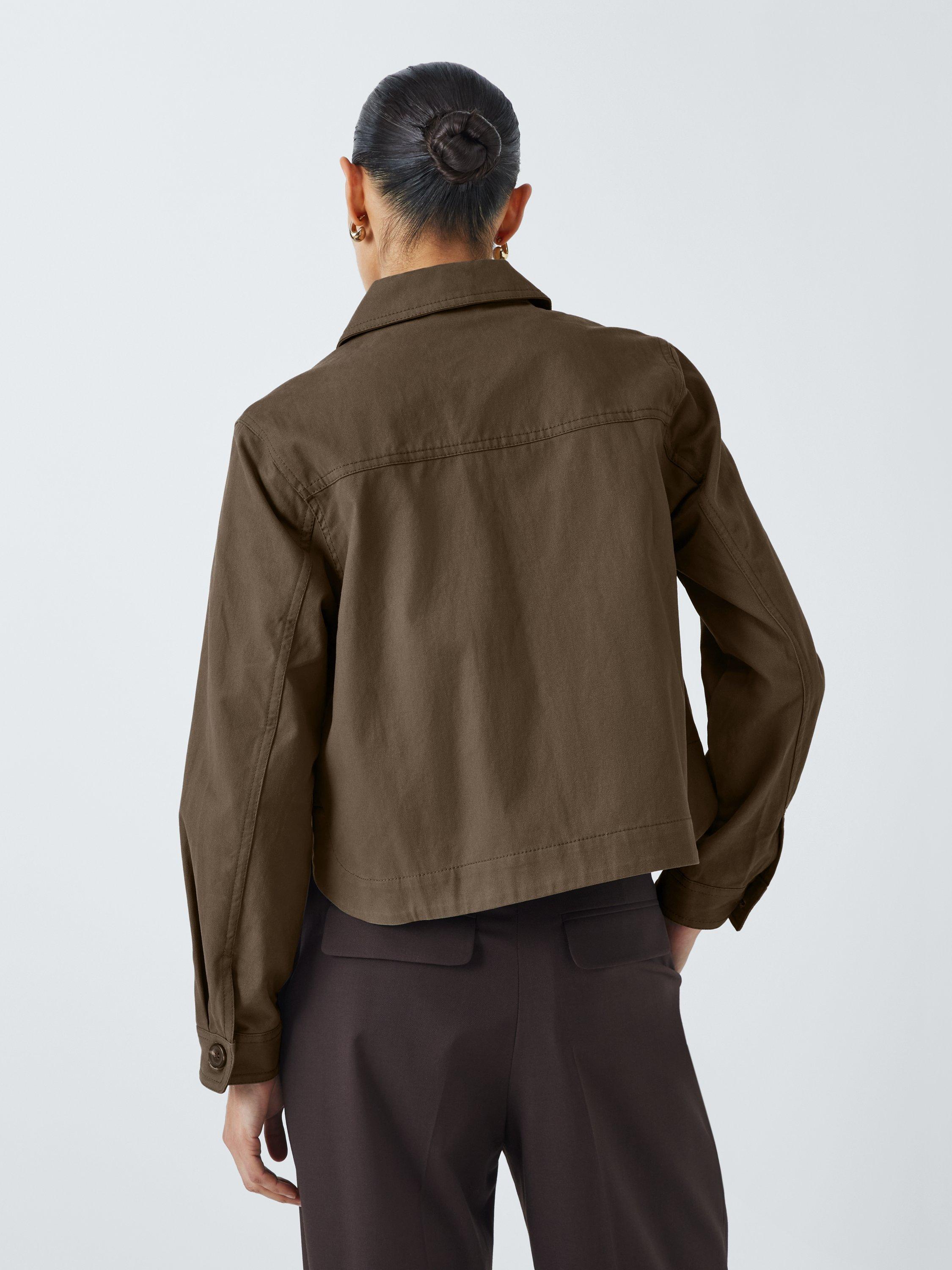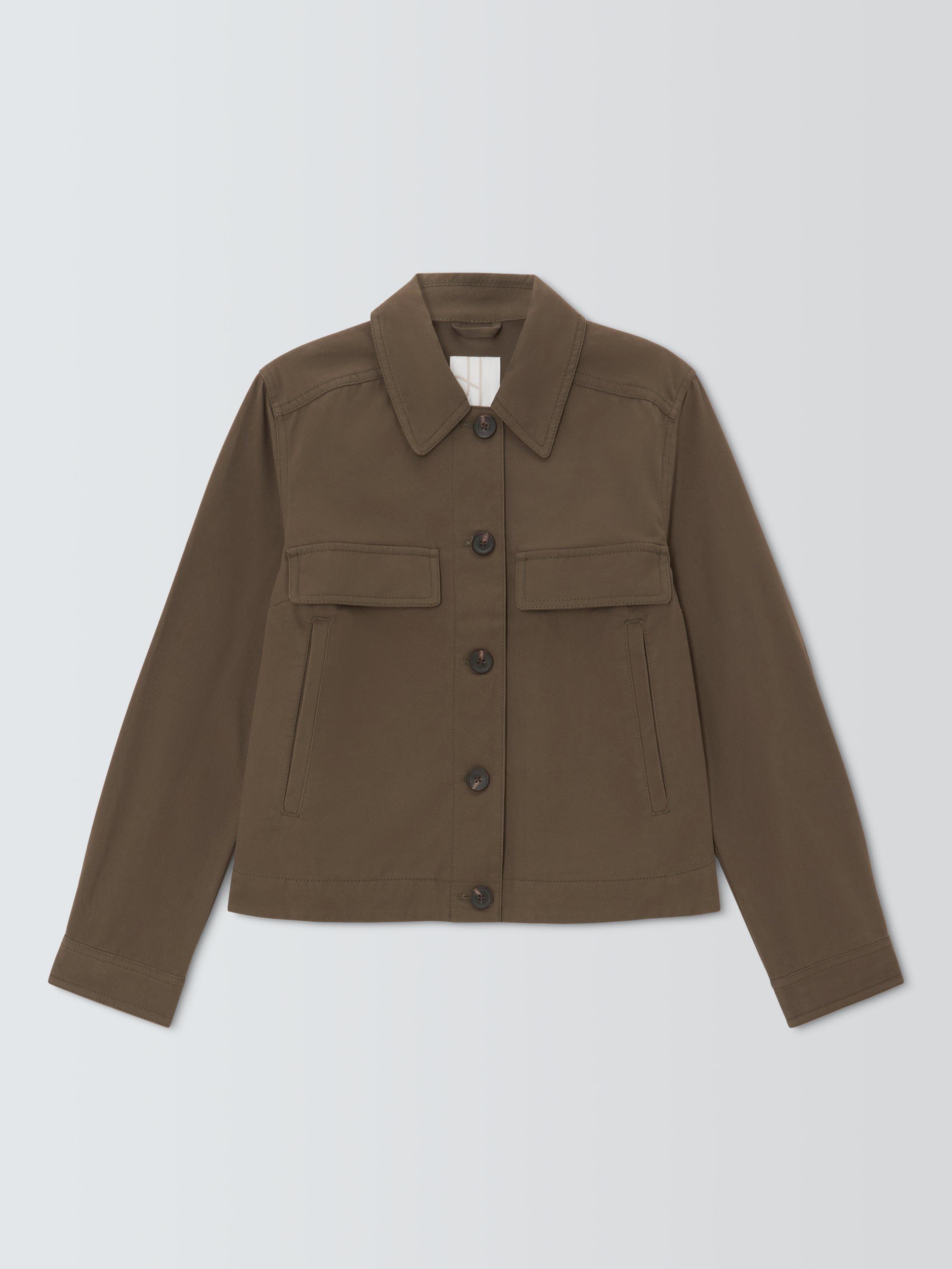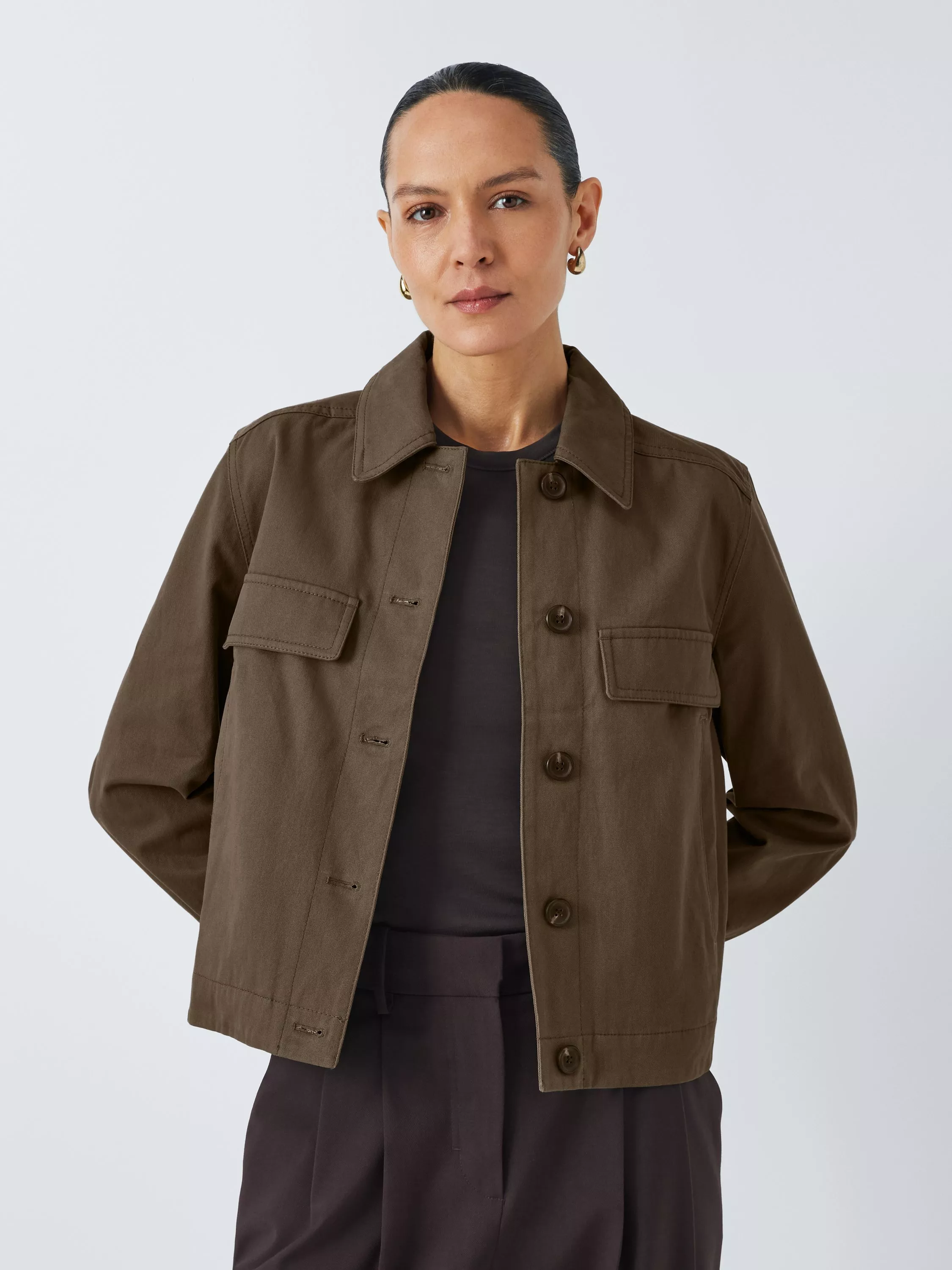 Jacket made of a sturdy cotton twill fabric with a collar, two flap pockets at the chest and two handwarmer pockets. Fastens down the front with mock horn buttons.