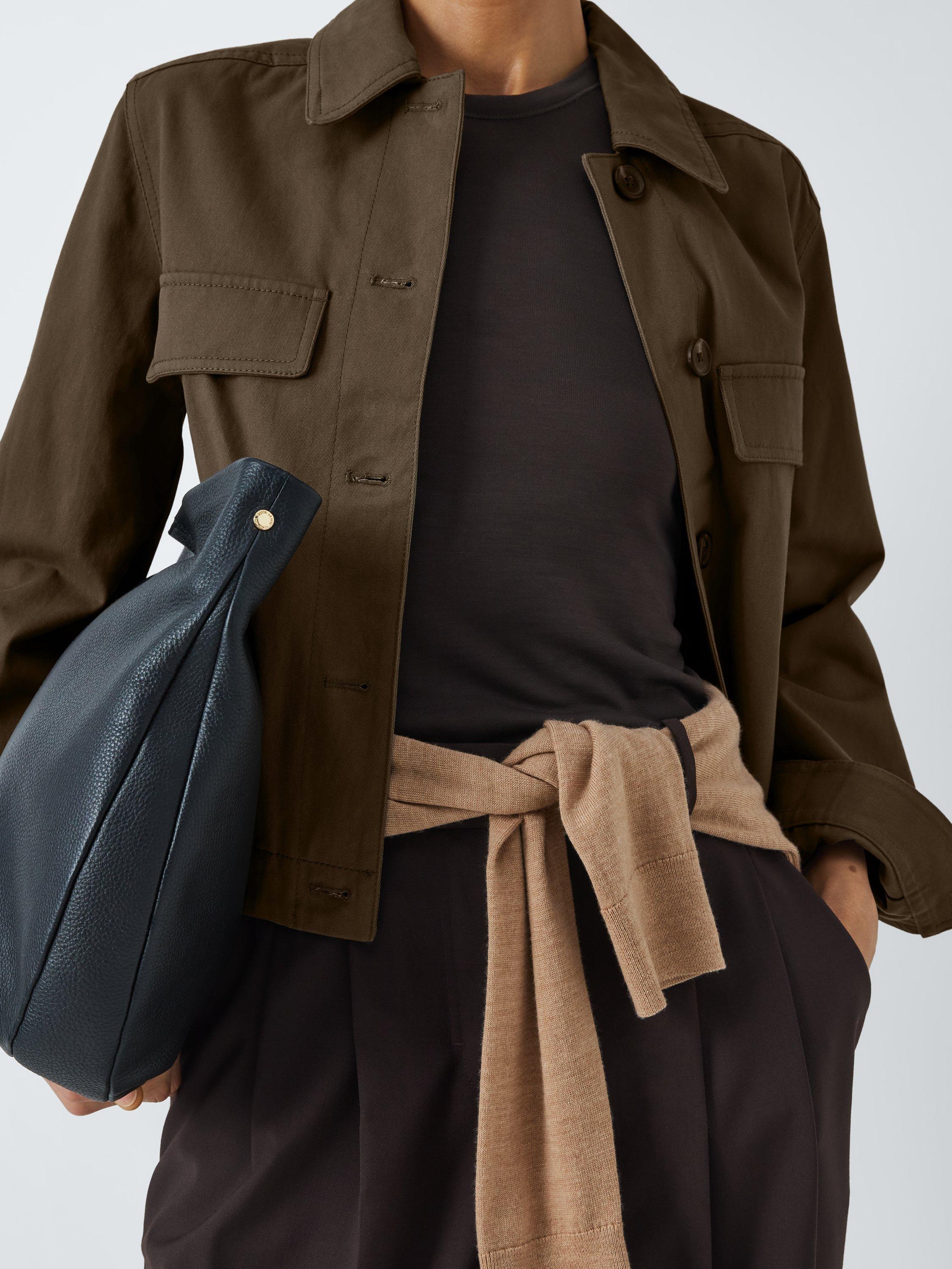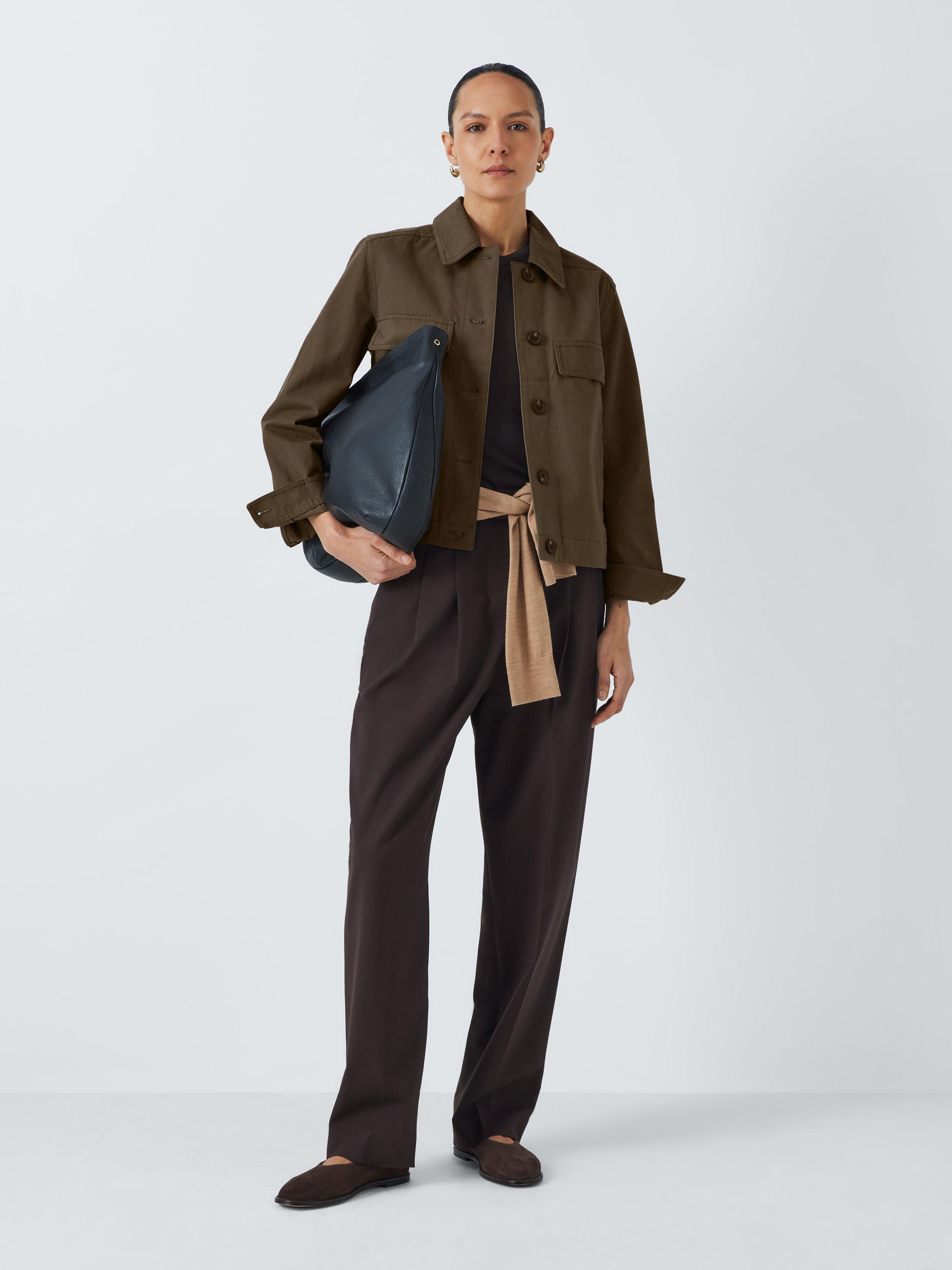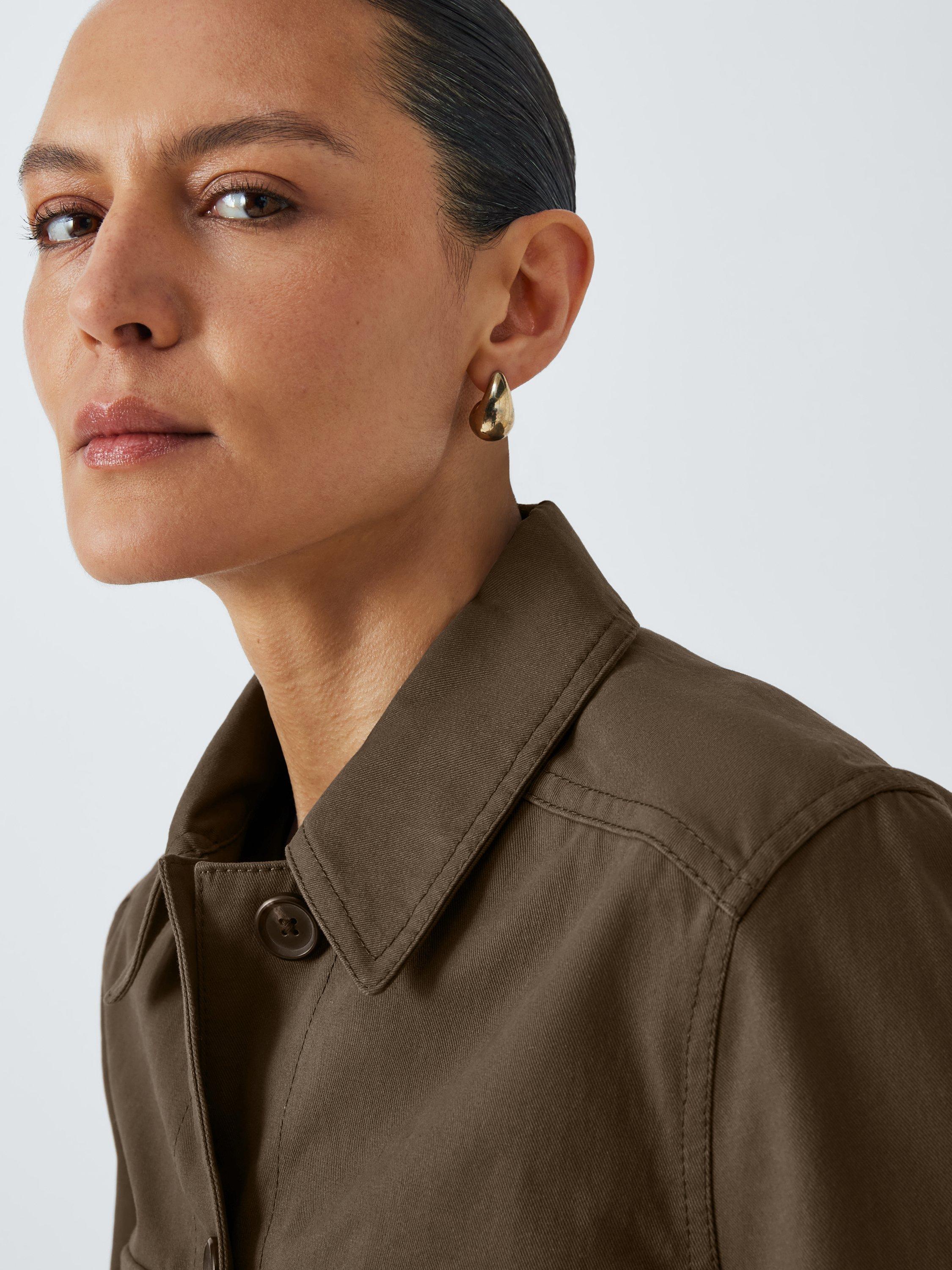 Jacket made of a sturdy cotton twill fabric with a collar, two flap pockets at the chest and two handwarmer pockets. Fastens down the front with mock horn buttons.