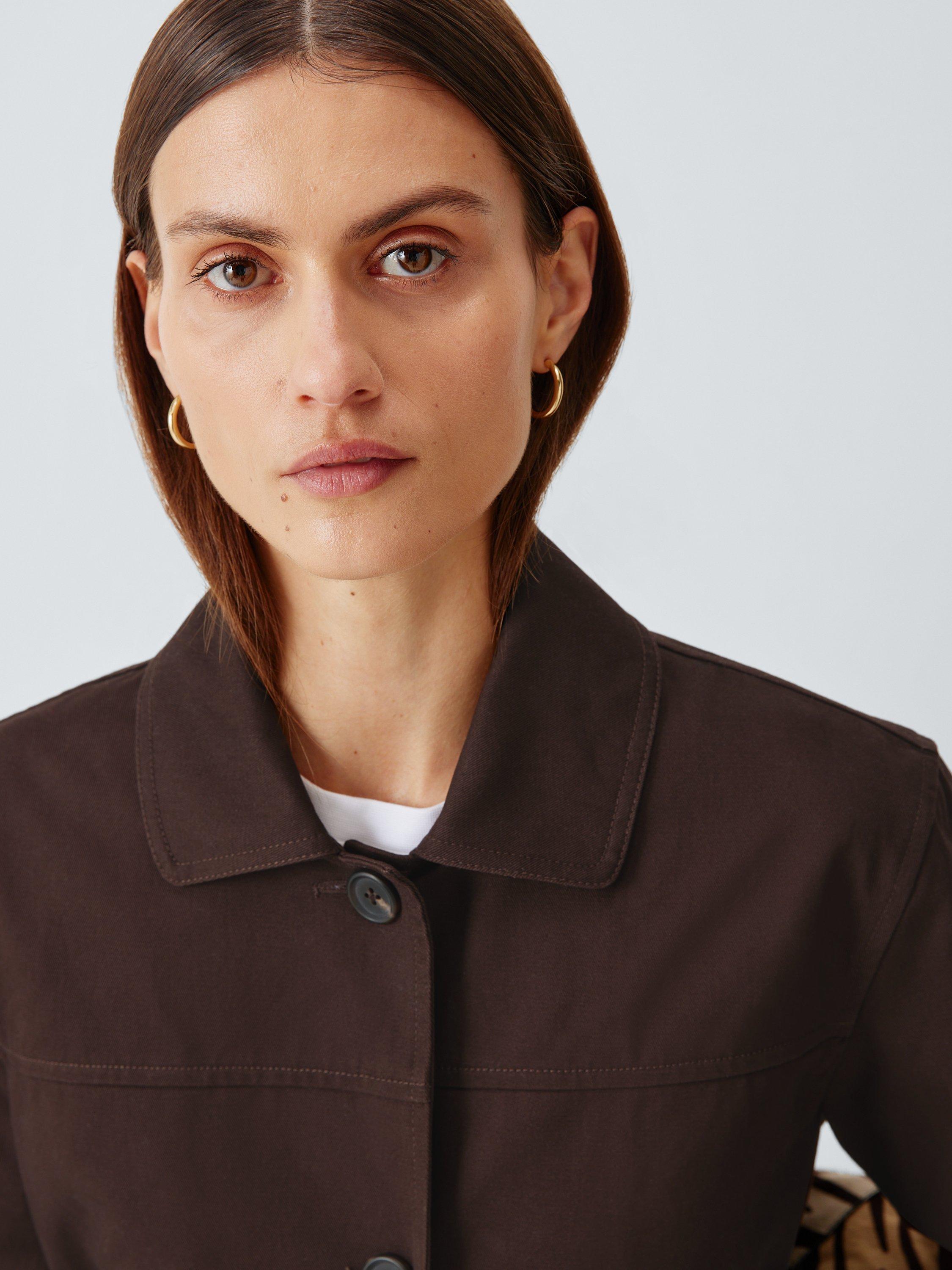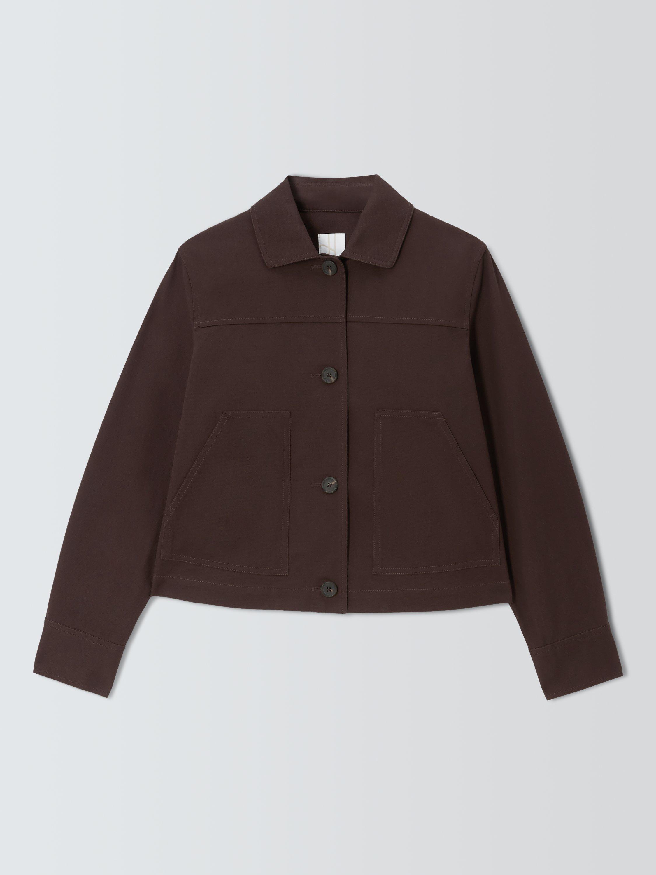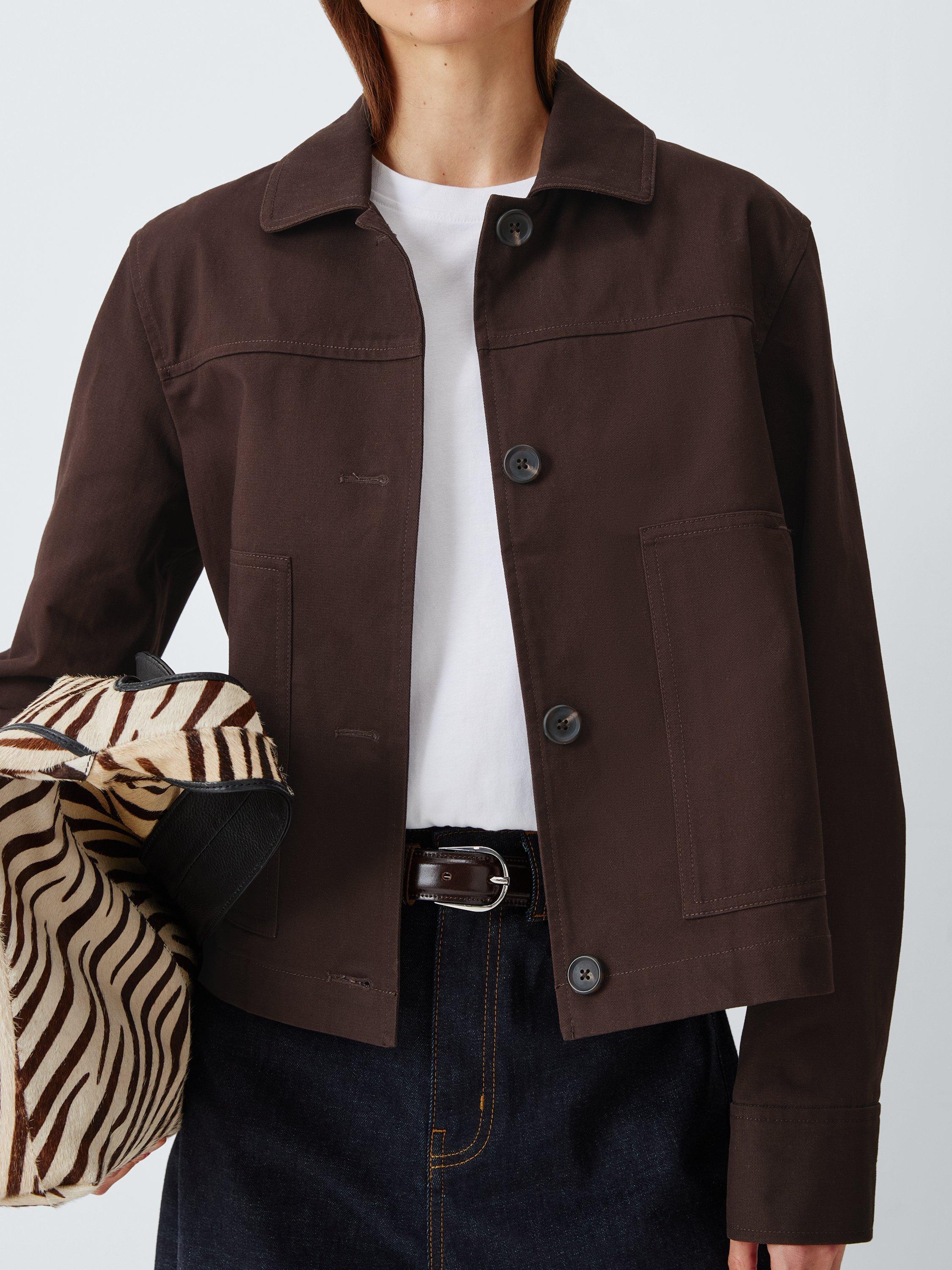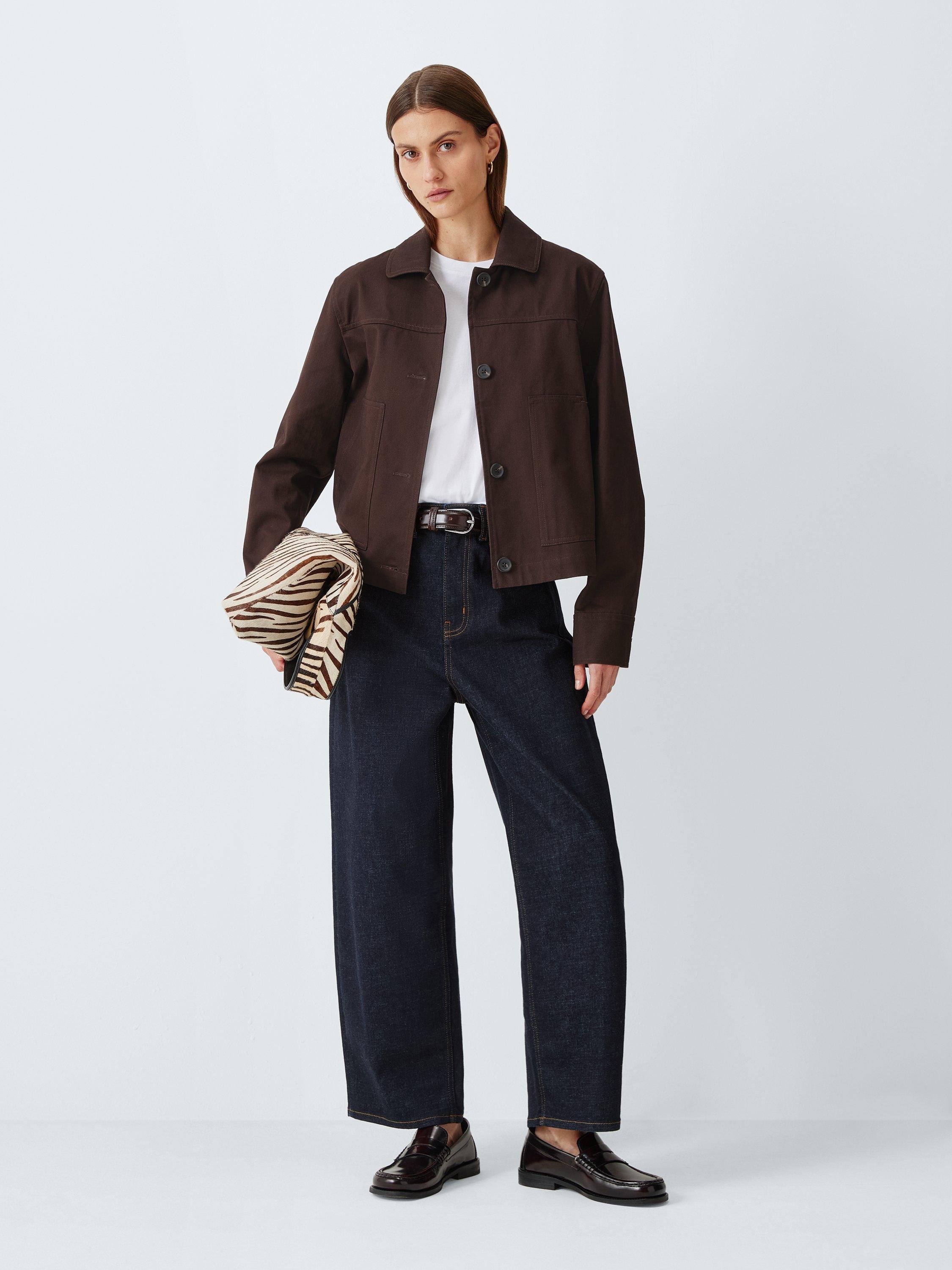 A versatile layer for your outerwear collection, this utility jacket is designed with a clean-lined silhouette. It features a classic pointed collar and a structured button-through front with contrasting dark buttons. The large front patch pockets provide a functional element, while the cropped length and panelled detailing offer a contemporary, boxy fit that is ideal for transitional styling.