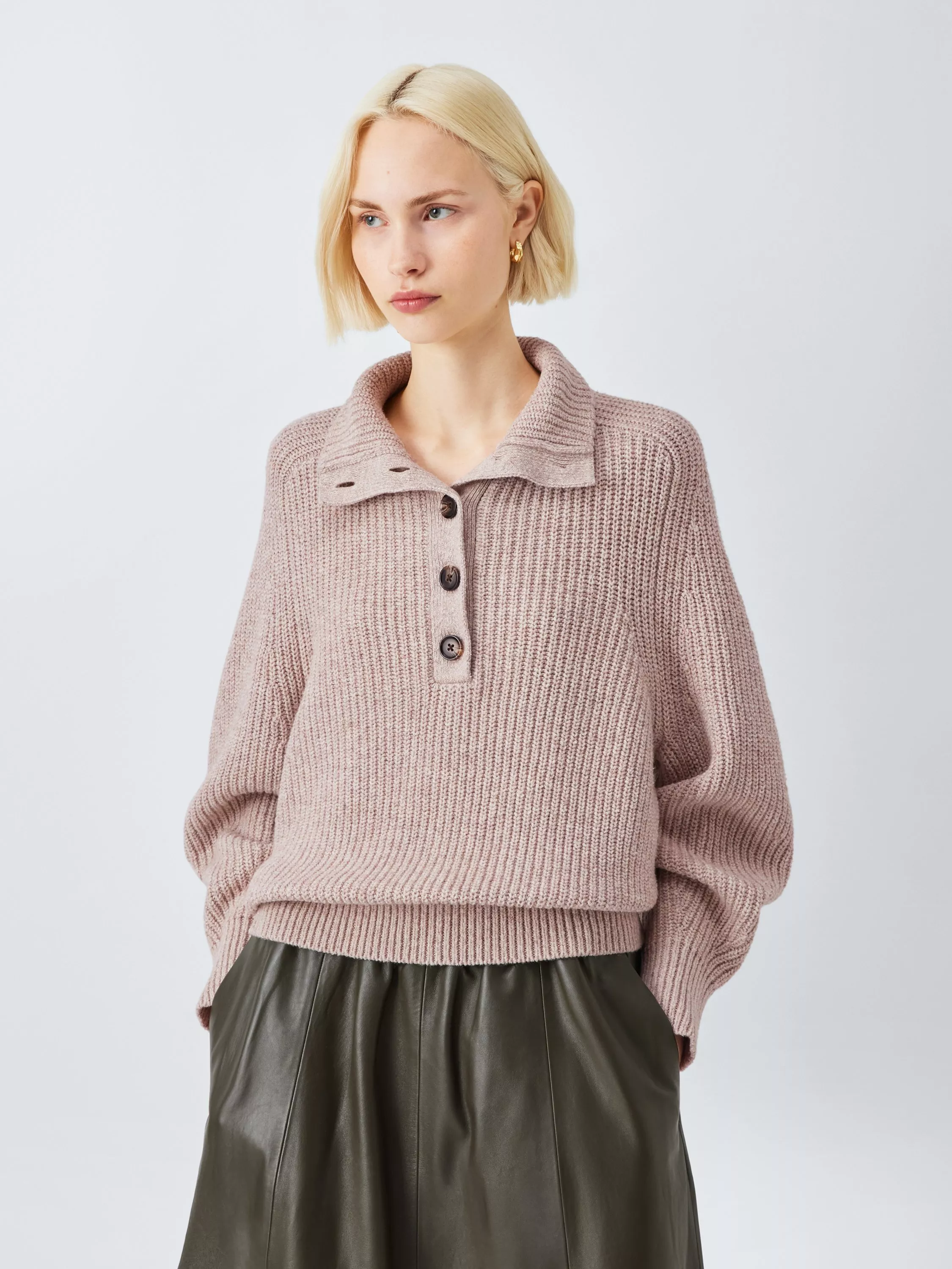 A cosy yet versatile layer. This ribbed knit jumper is made of a soft blend of cotton with luxurious wool, which is naturally temperature regulating. The high neck features five buttons, making it a versatile layer for your transseasonal wardrobe.