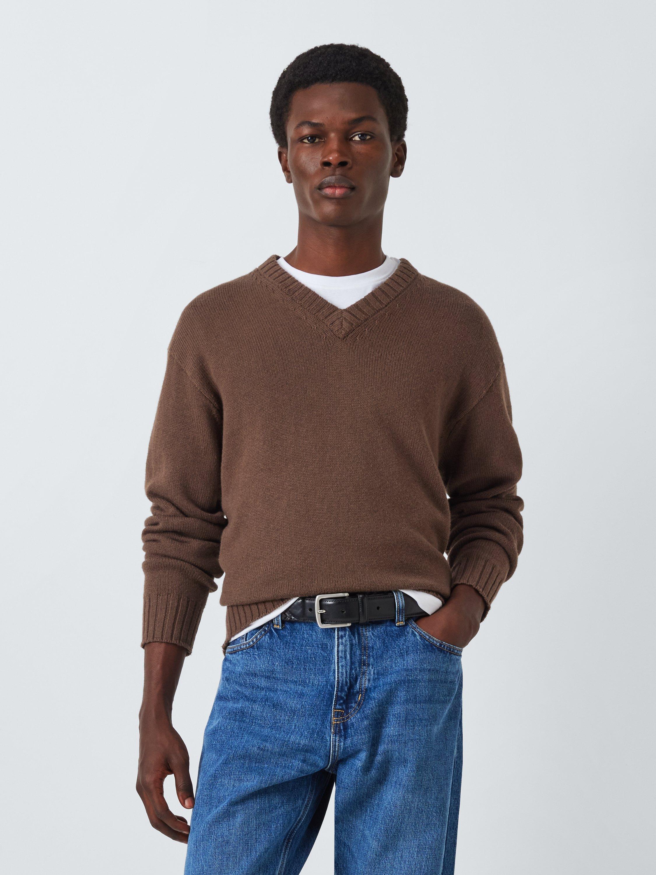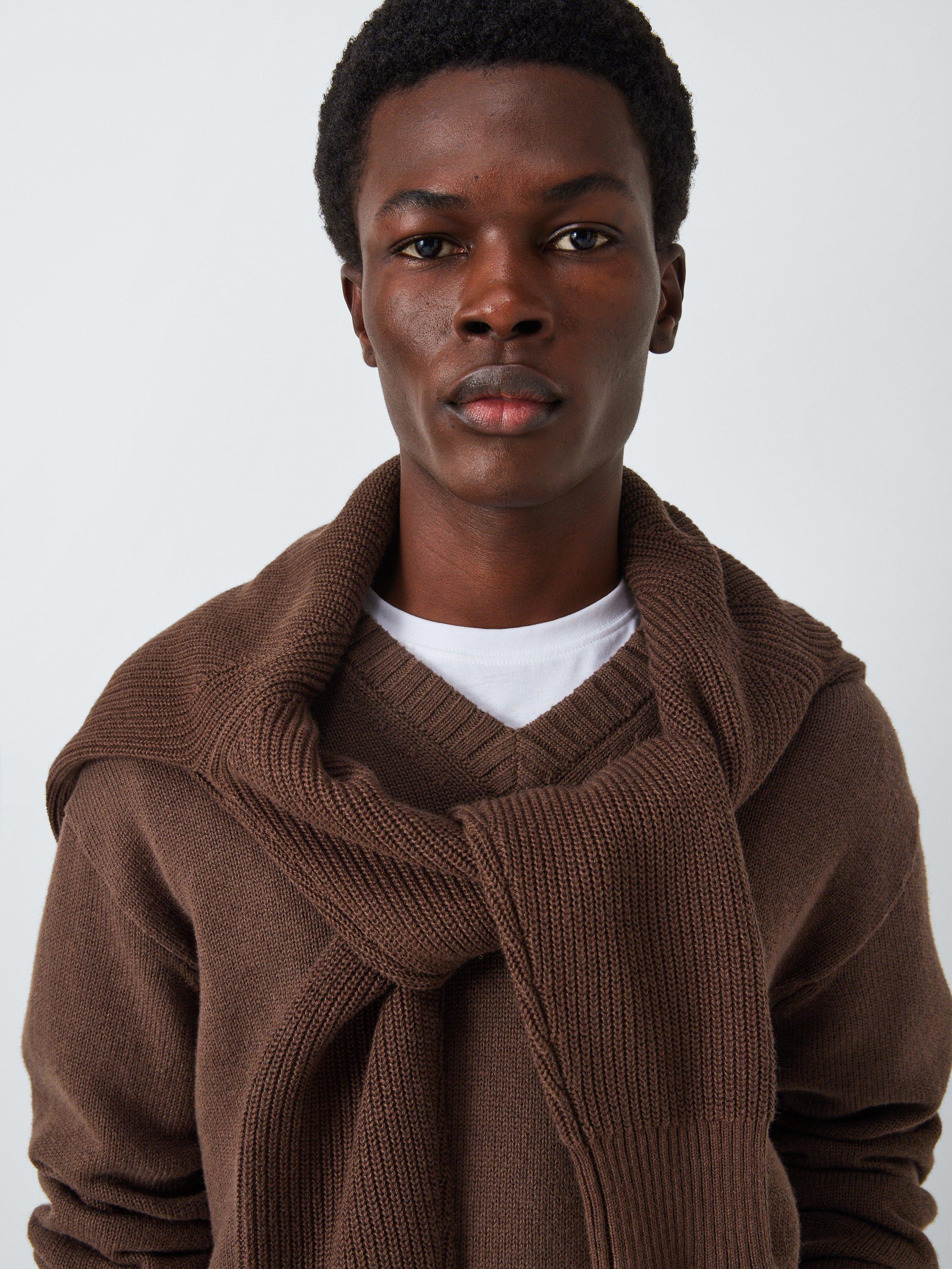 V-neck jumper in a soft cotton and wool blend fabric, styled with ribbed cuffs and hem, and a tubular ribbed collar. Great for light layering.