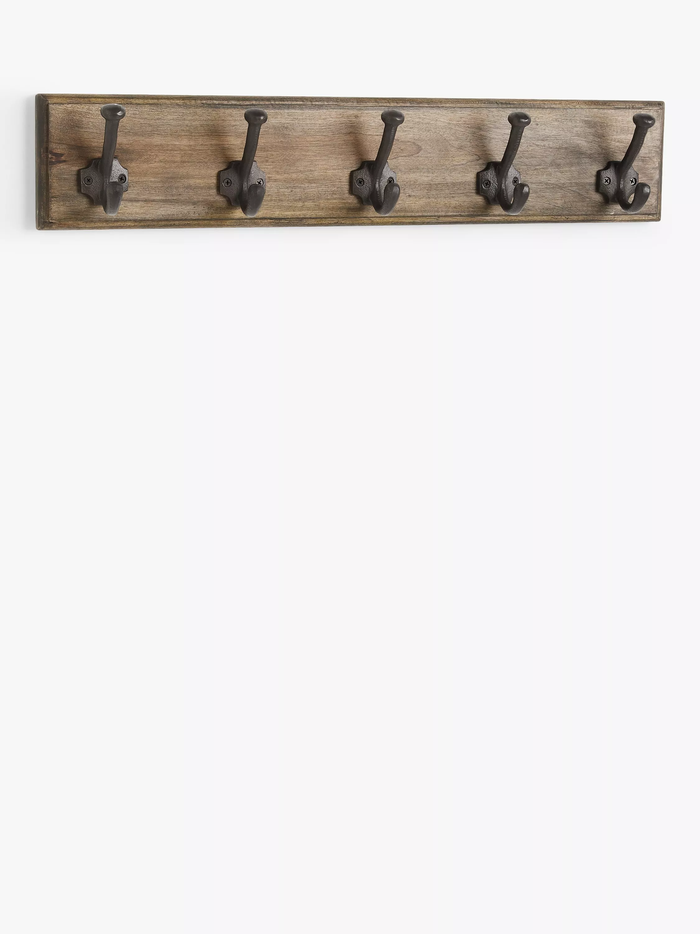 An attractive, hallway hanging rack with a rustic, hand-finished wood backing board and 5 cast aluminium hooks.