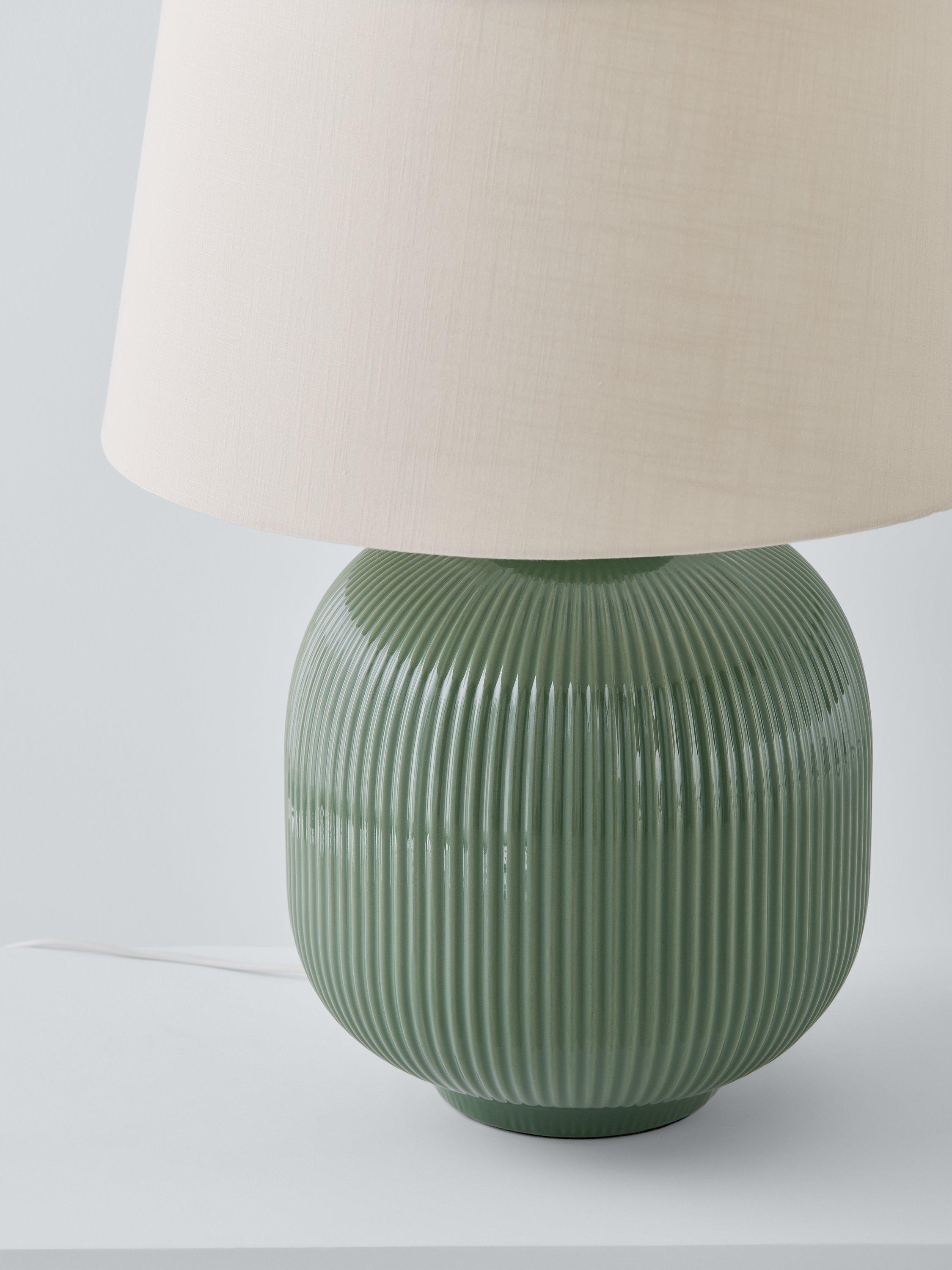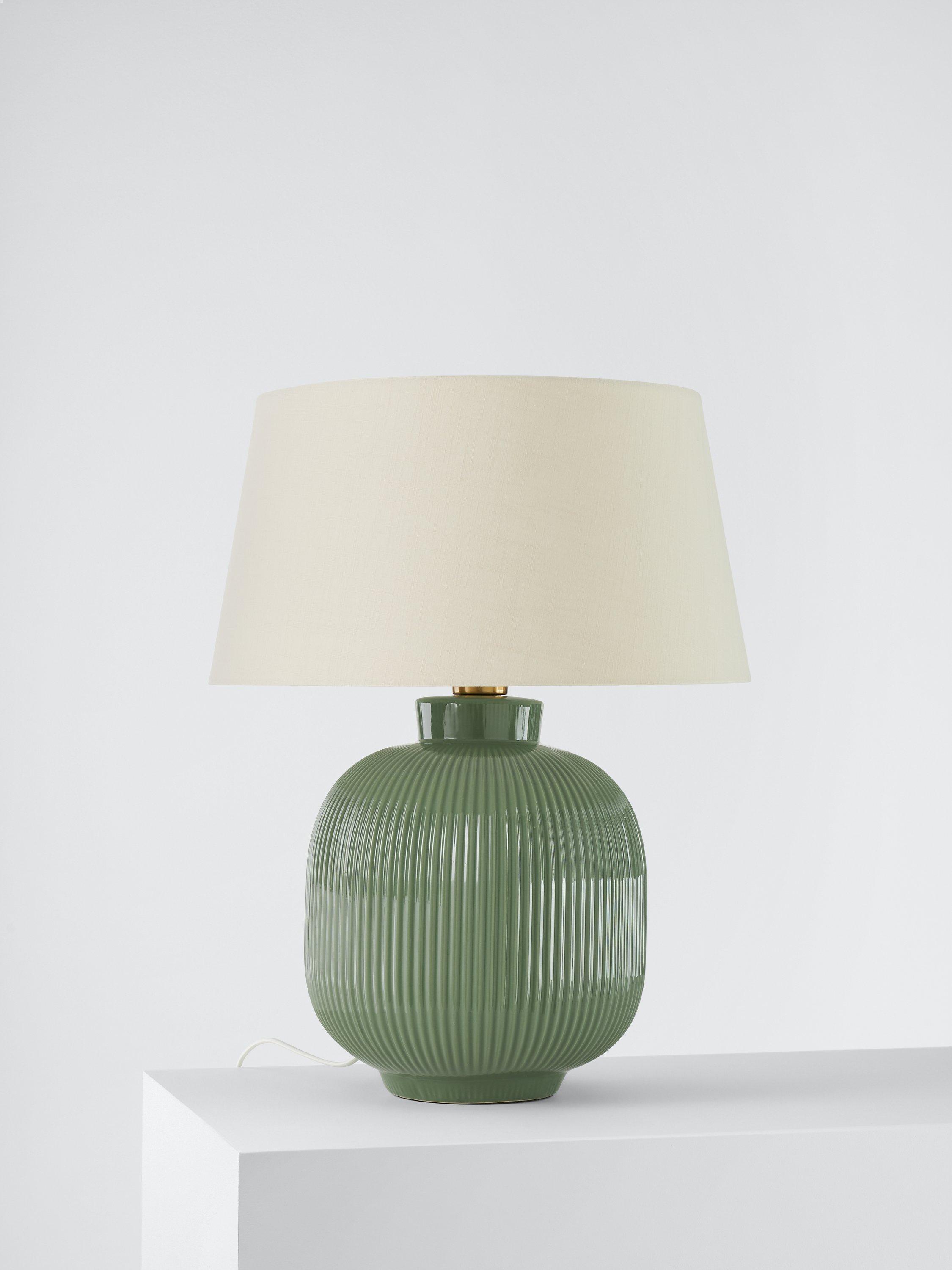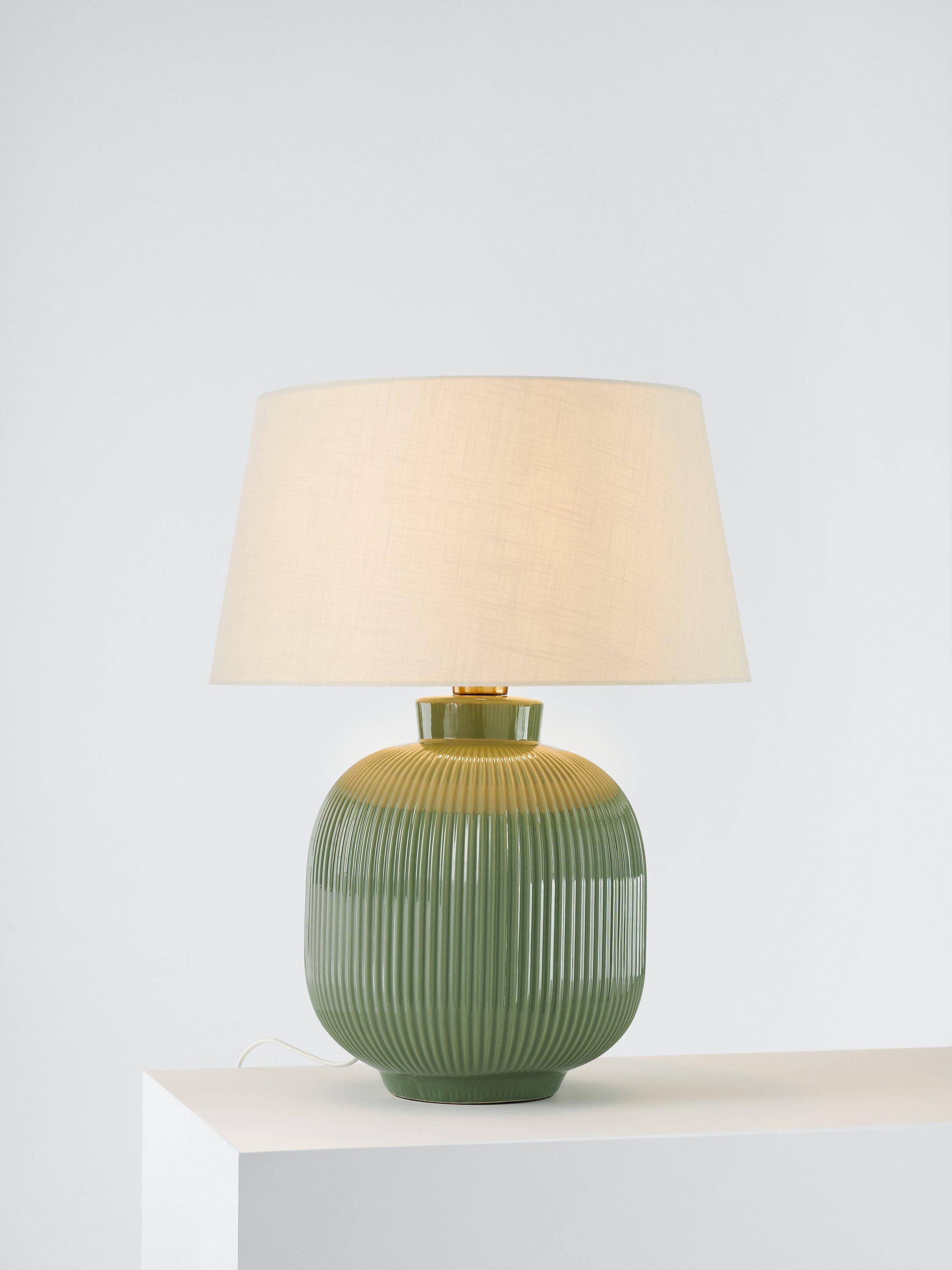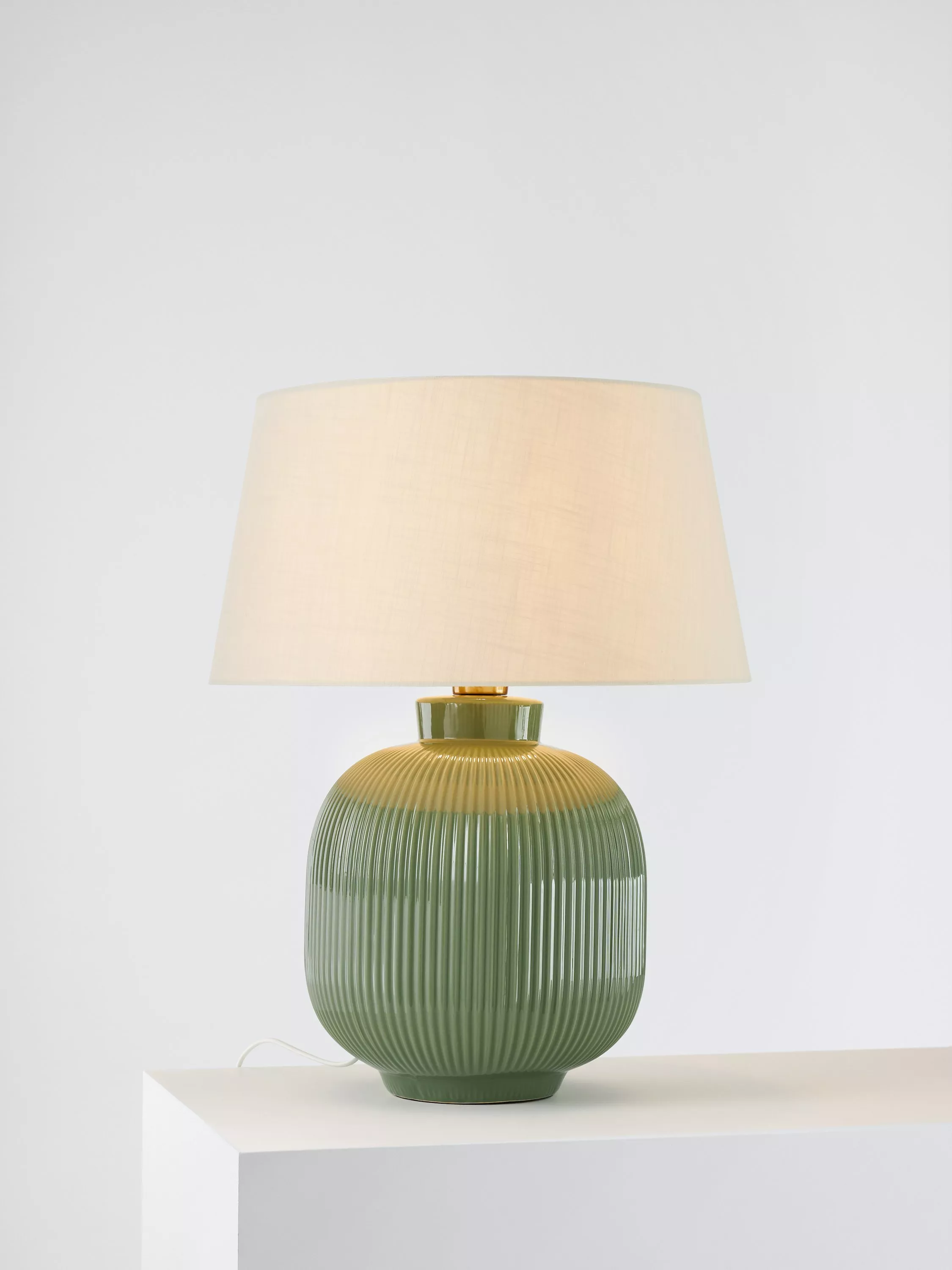 This beautiful, large ceramic rounded-shaped lamp has textured ribs and an off-white matt glaze, along with a large oatmeal faux linen shade.