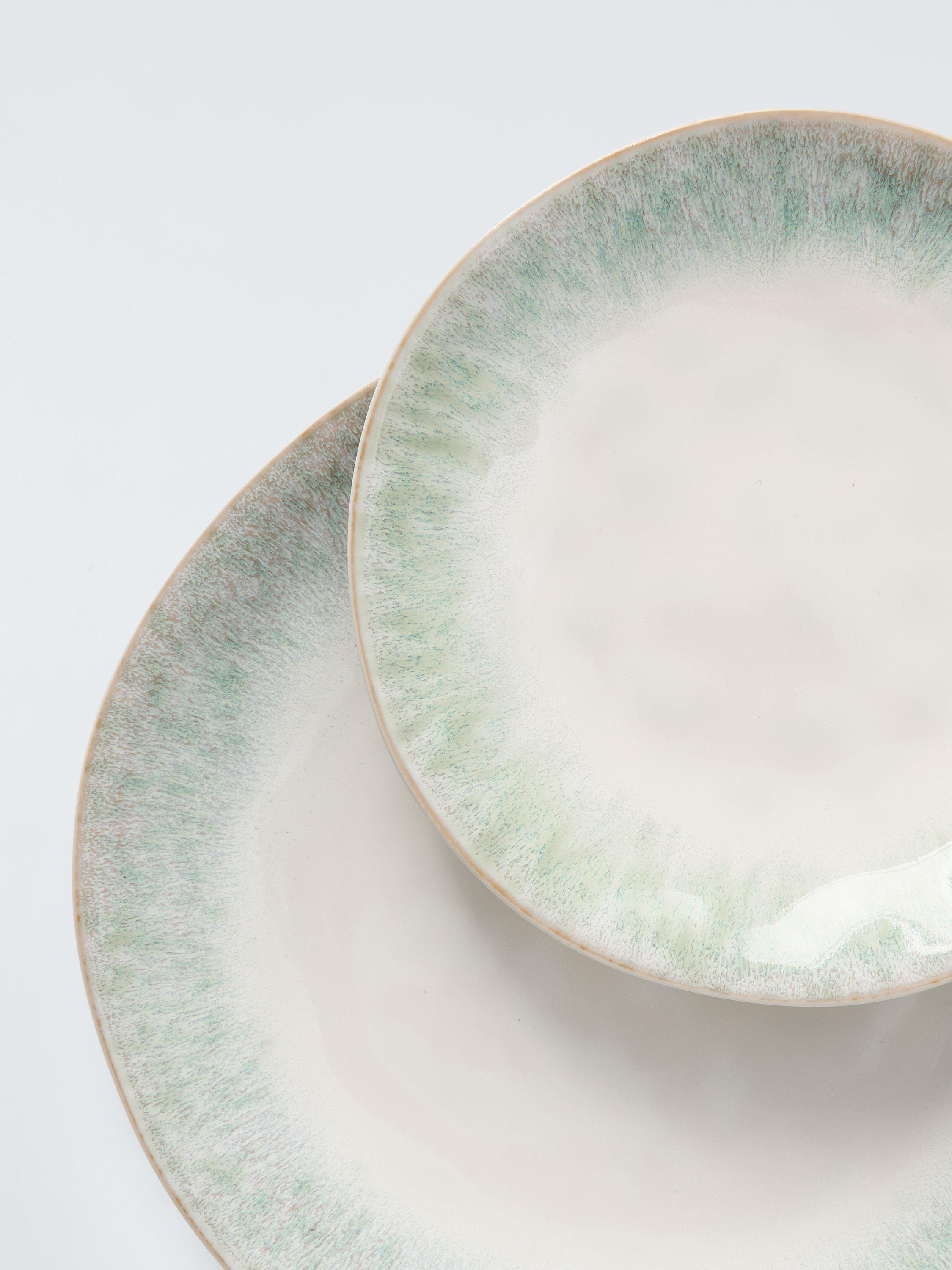 Our Cove 12-piece dinnerware set features organic shapes with reactive glazed rims. Made of stoneware, the set is dishwasher and microwave-safe for everyday use. Due to the nature of the double-layer reactive glaze, there may be slight variations from piece to piece, making your tableware unique.