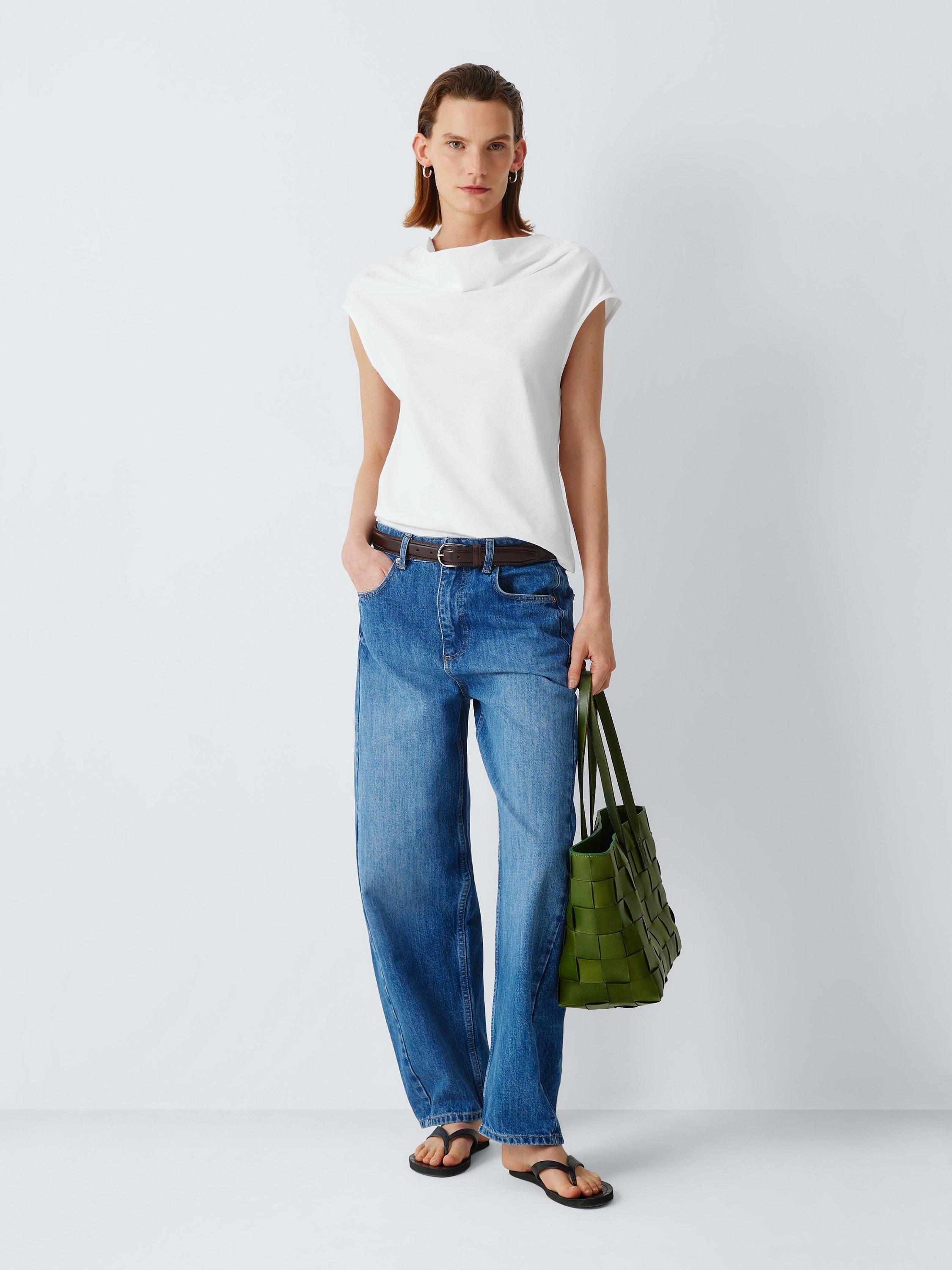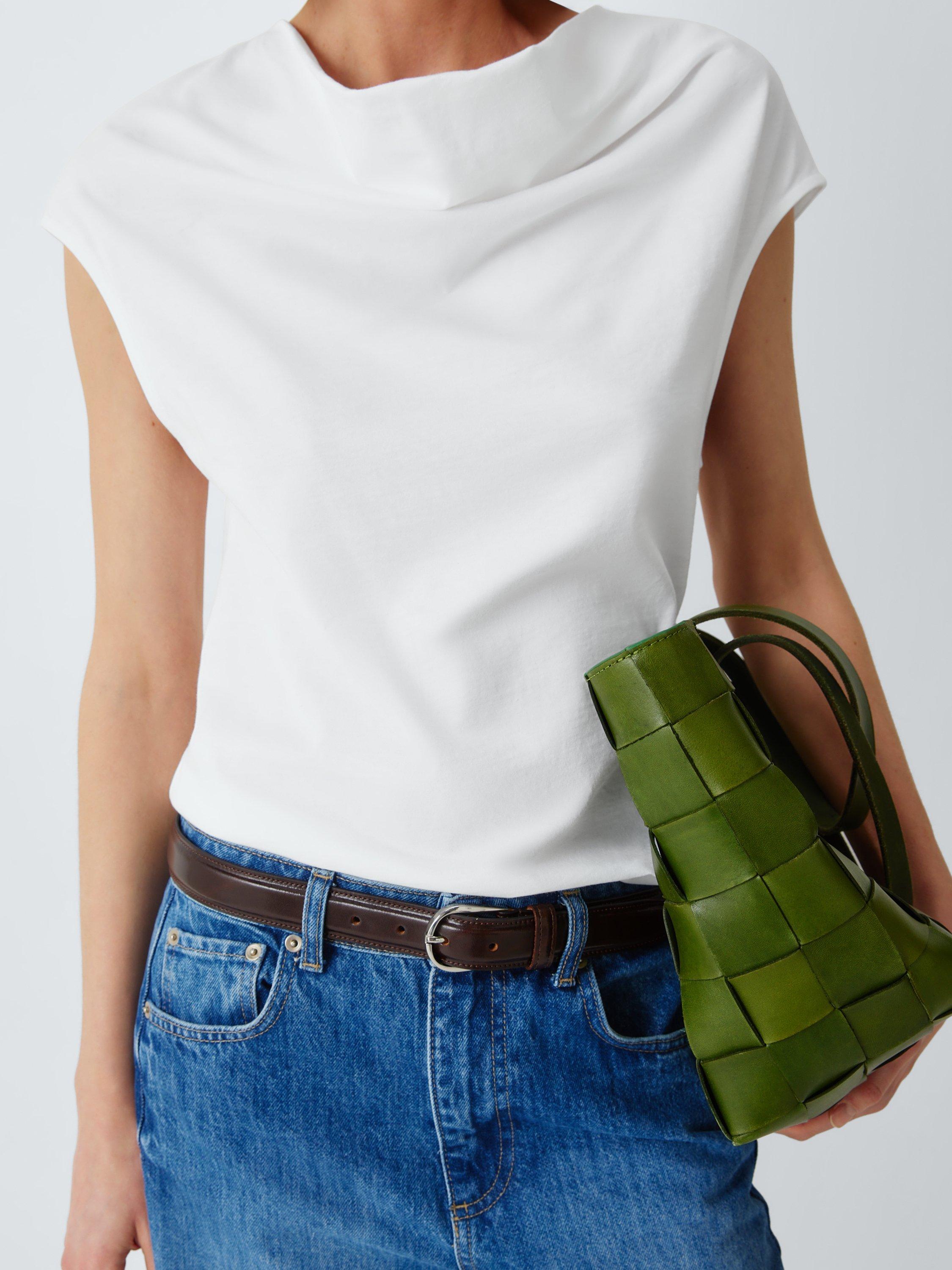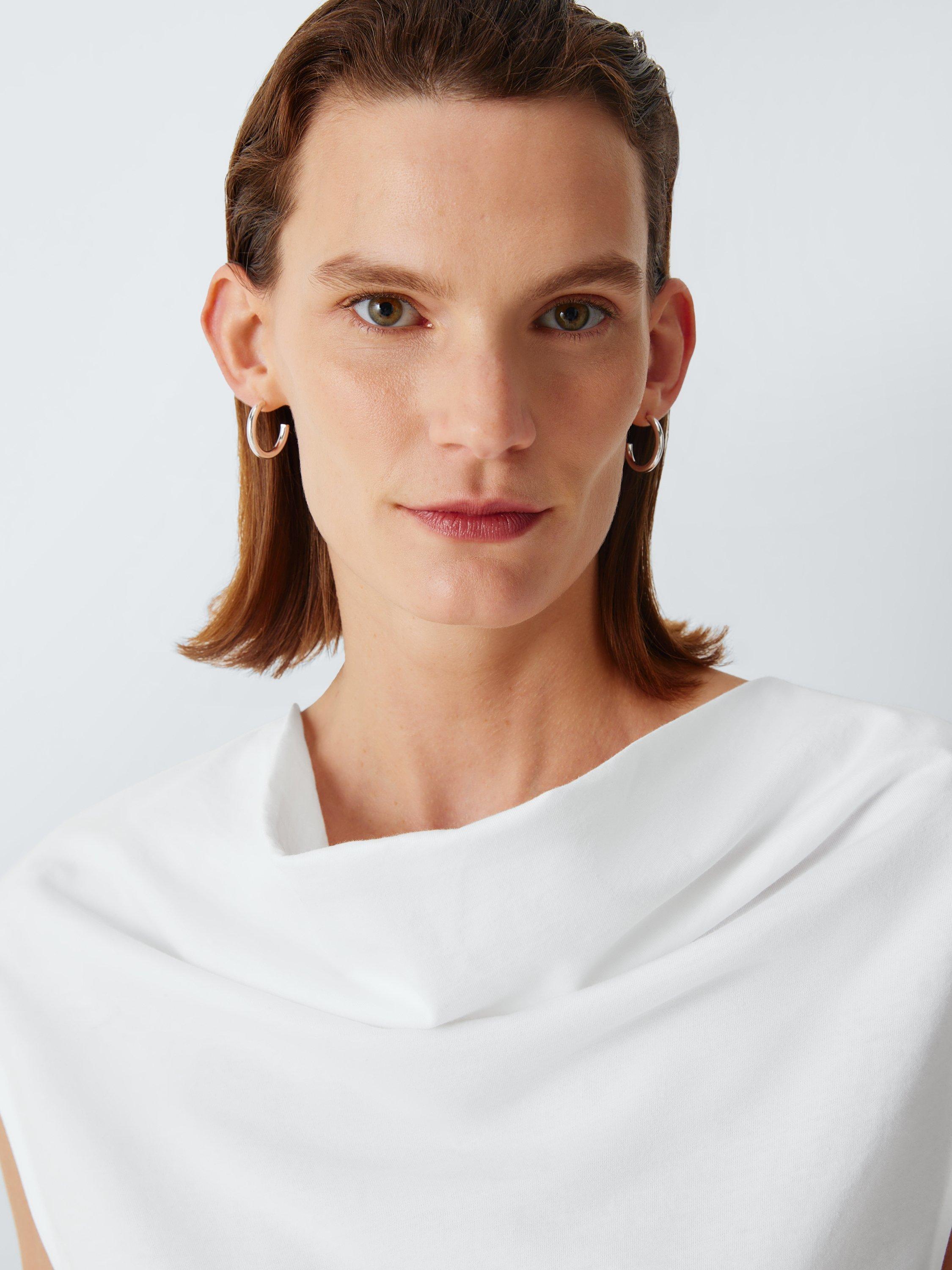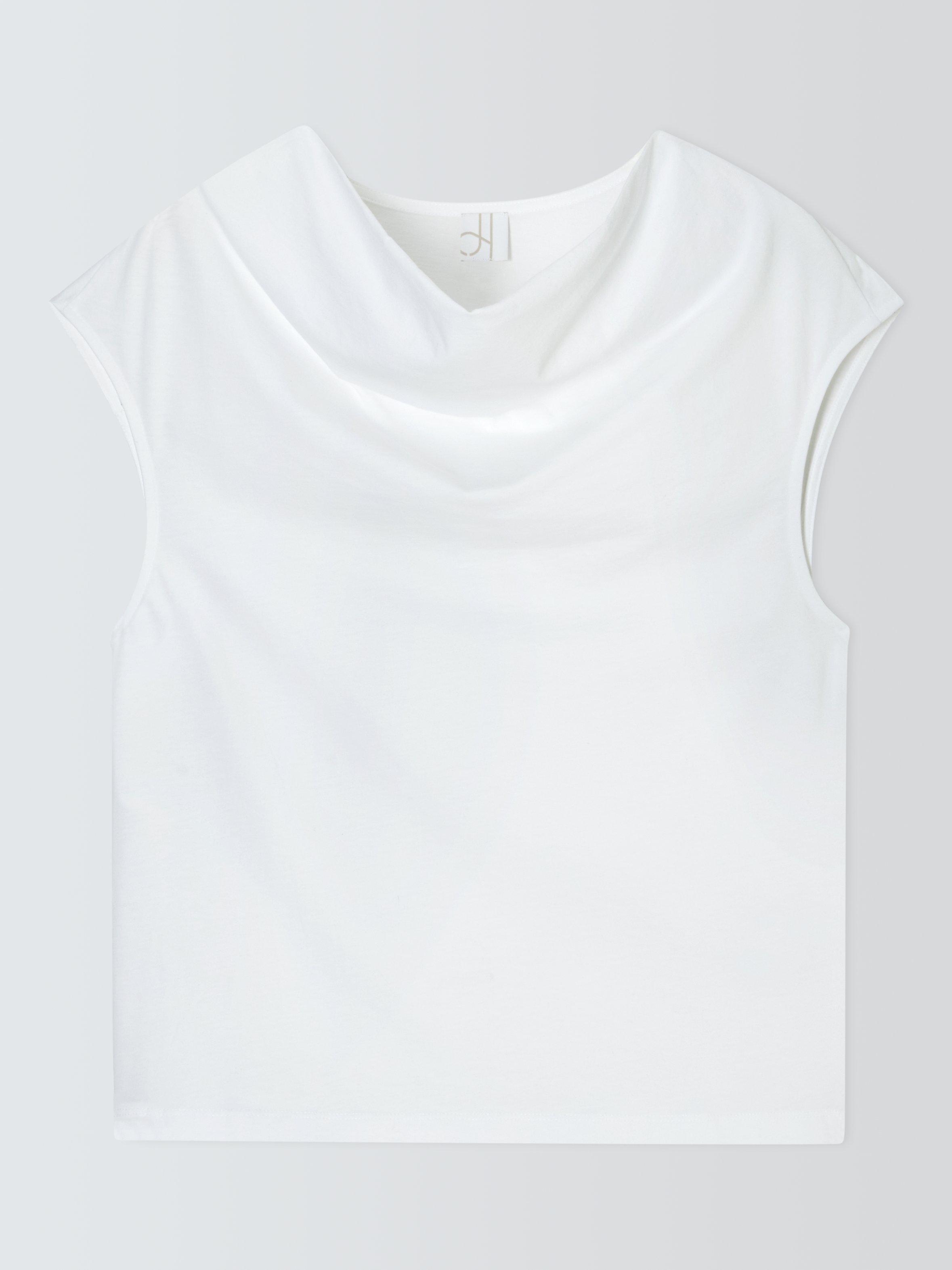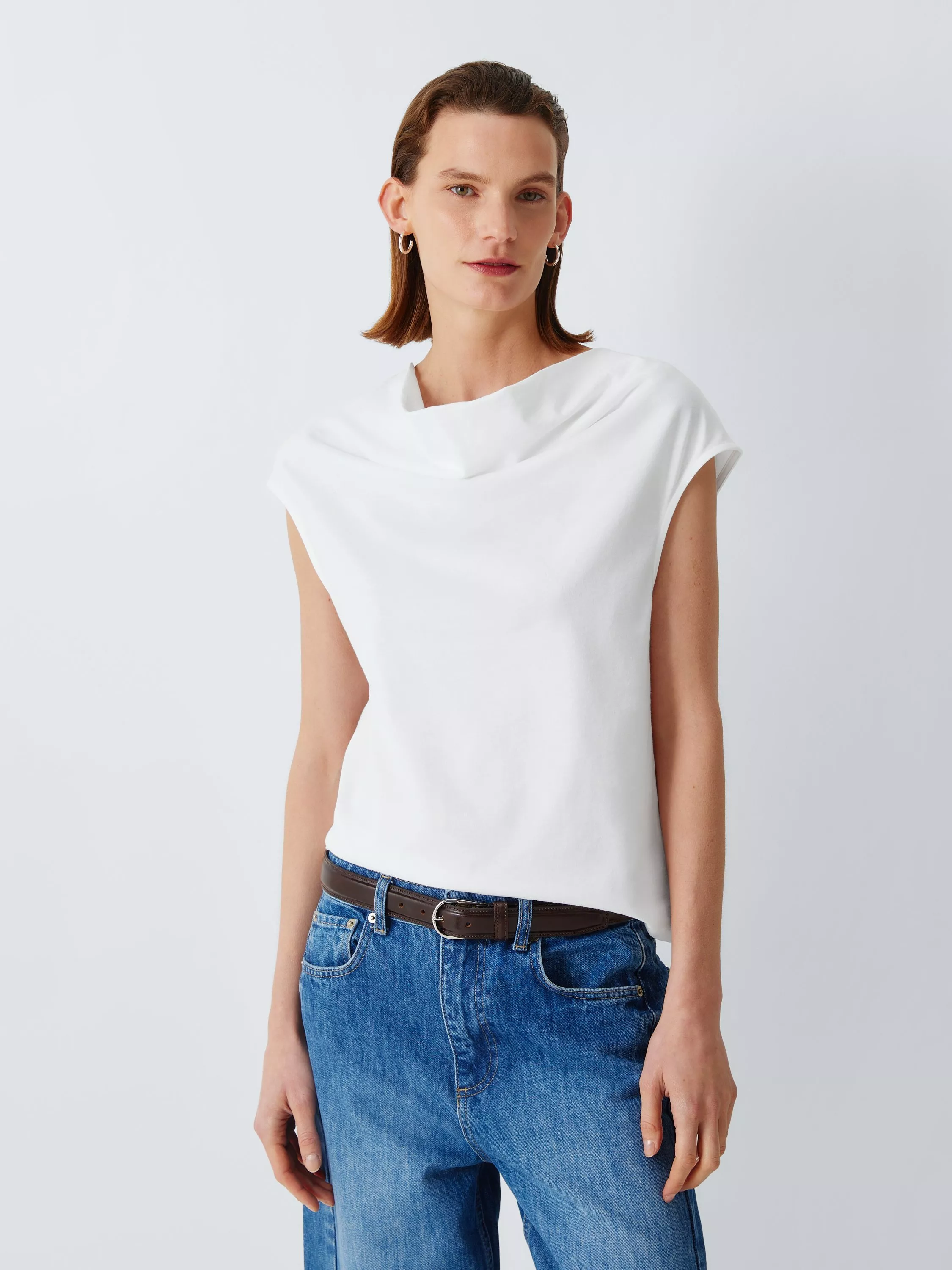 A fluid cowl neckline defines this sleeveless top, a sophisticated alternative to the classic T-shirt. The drape creates a soft focal point that transitions effortlessly from a polished solo piece to a smooth, refined layer beneath a sharp blazer.